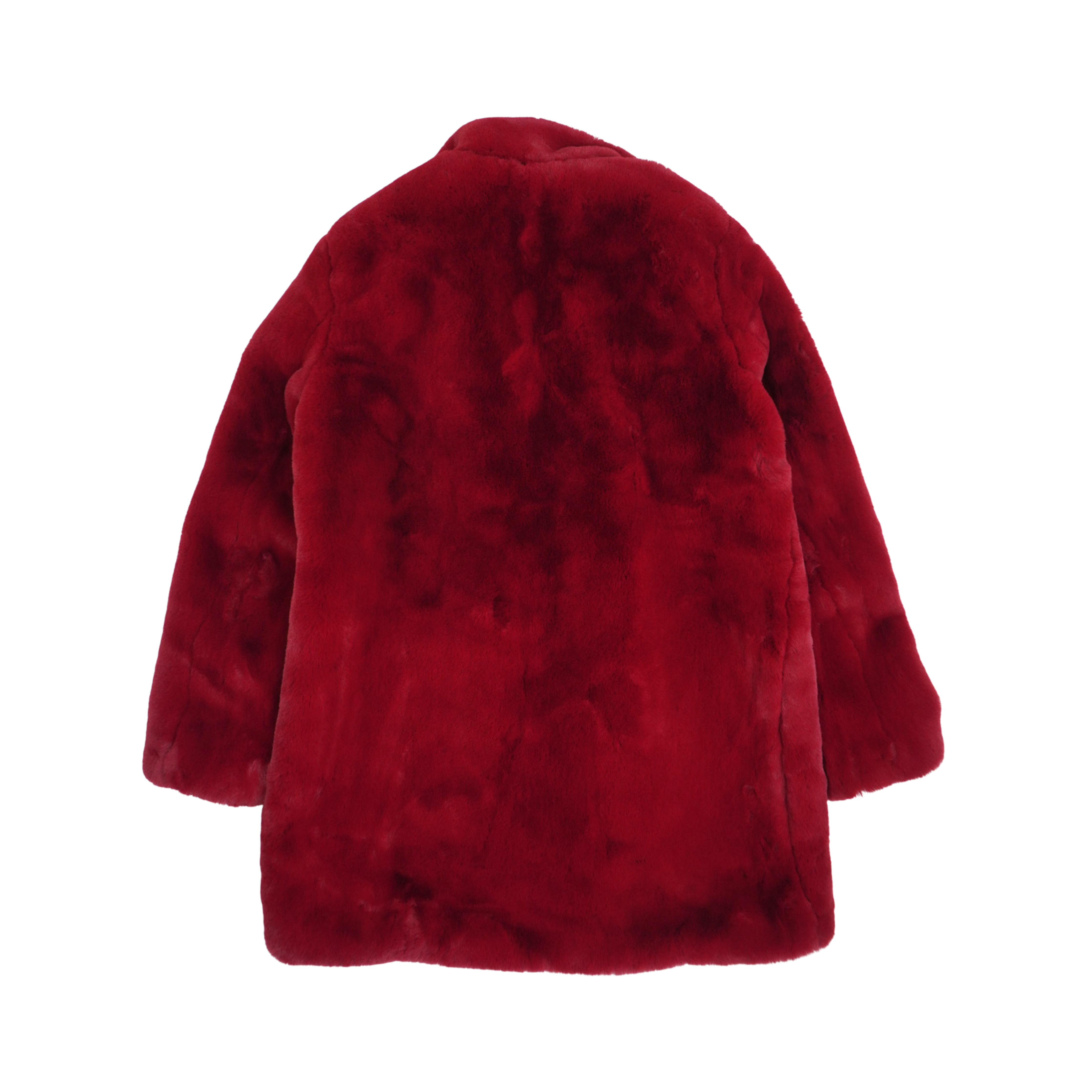Apparis 'Steffi' coat in deep red faux fur. Features a notch collar, hook closures on the front, a red lining , and two welt pockets on the front.
