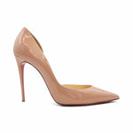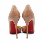 Christian Louboutin 'Irizia' pointed-toe pumps in nude patent leather with cutout detail on the inside of the shoe.
