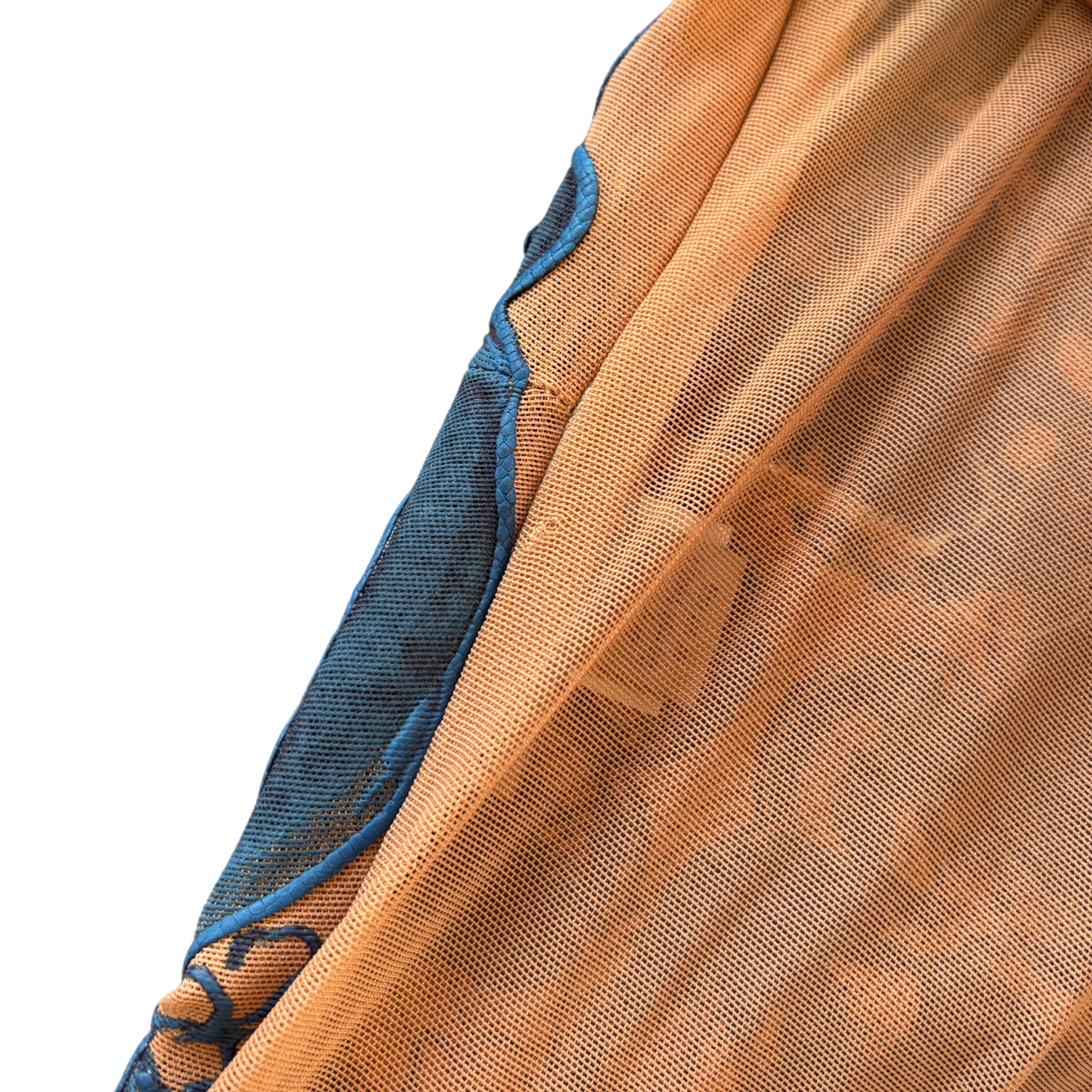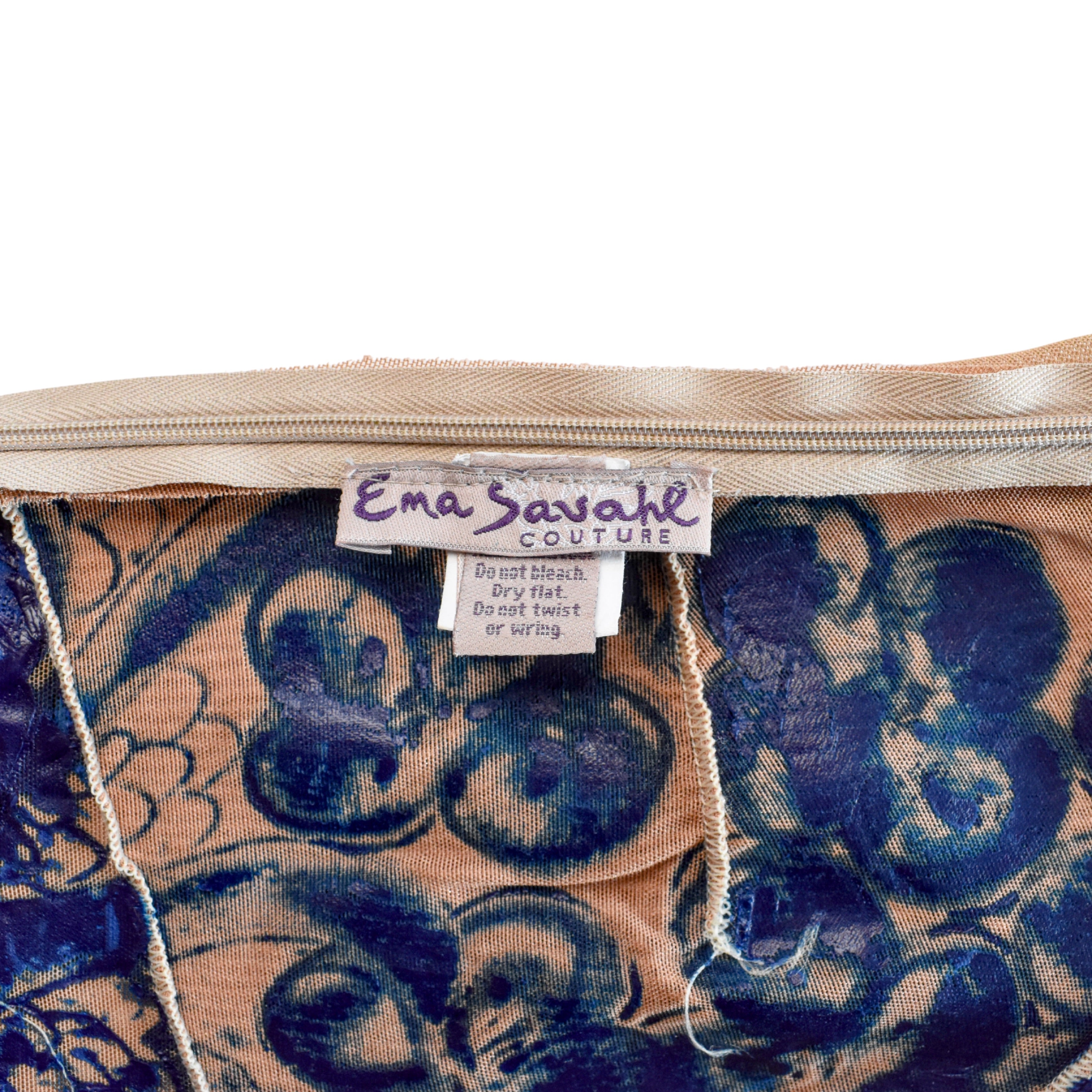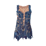 Ema Savahl fitted mini dress in nude mesh with hand painted blue floral decal throughout. Features double layered mesh at the bust and an invisible zipper down the left side.