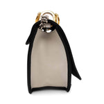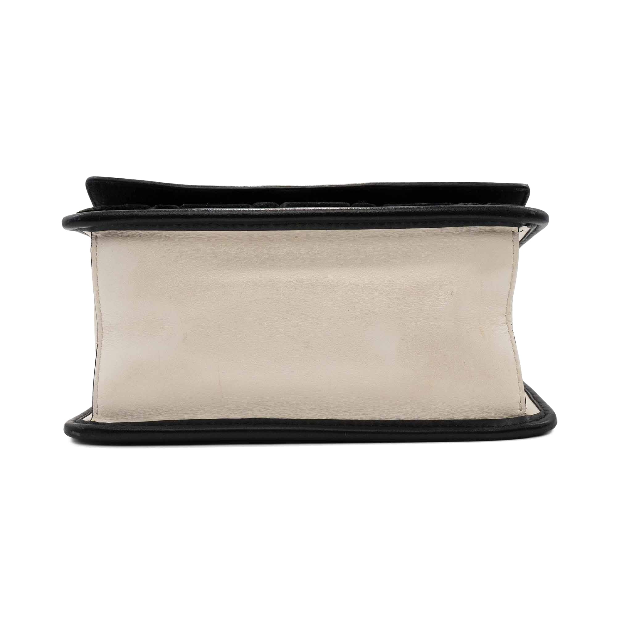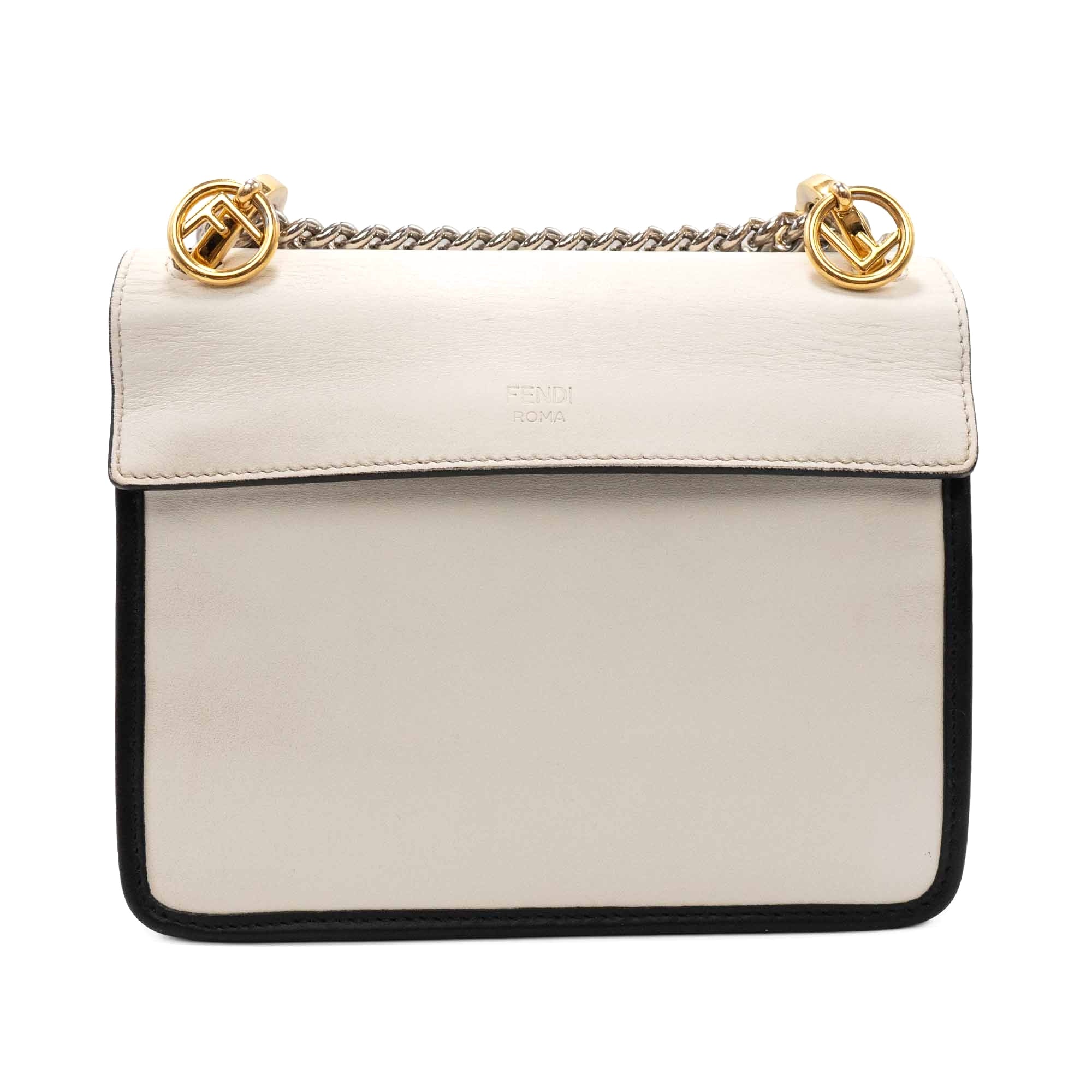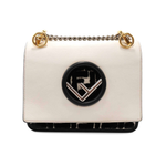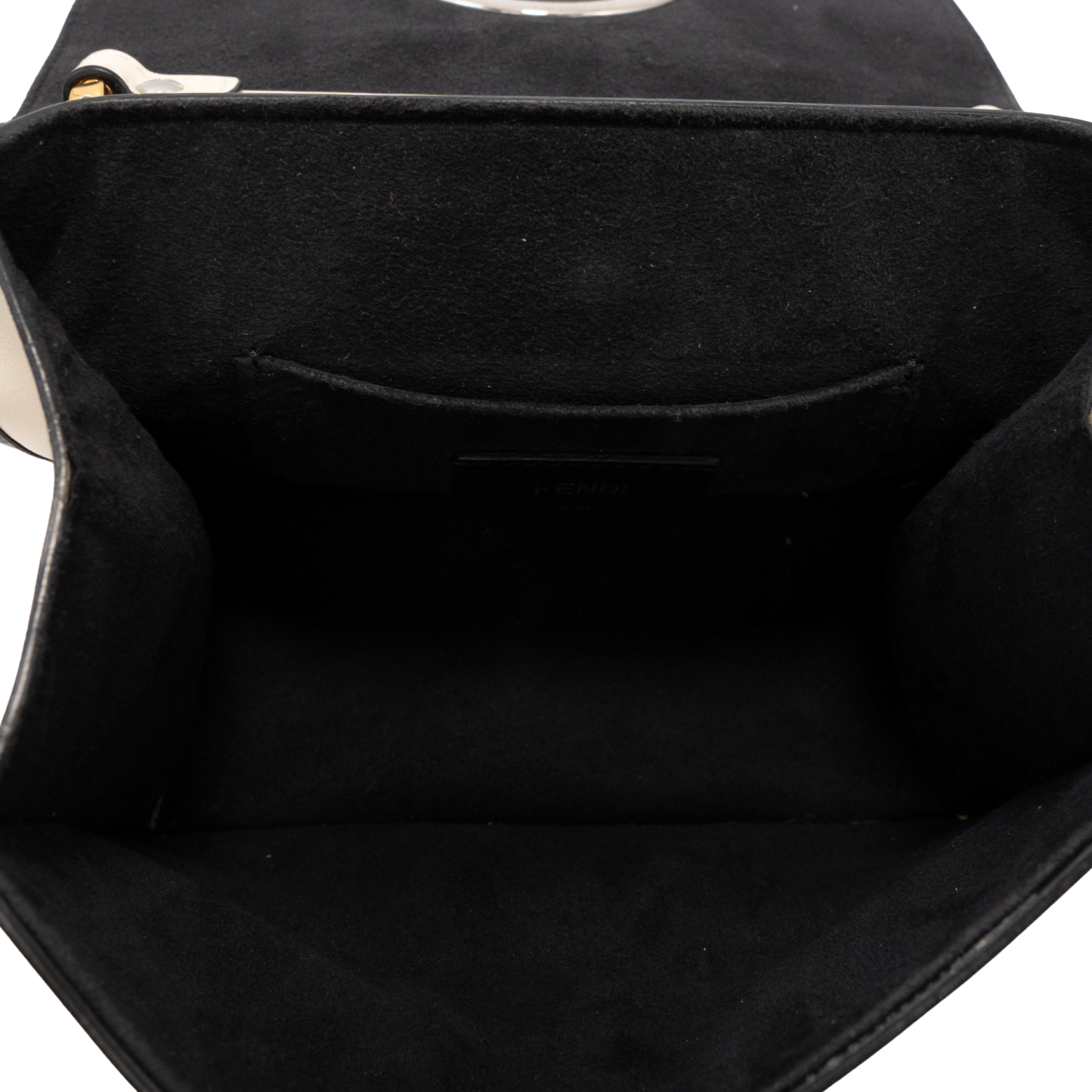 Fendi 'Kan I' mini flap bag in white leather with black details and mixed metal hardware. Features circle cut out on front with silver 'F' motif in centre, black fuzzy flocked F monogram on front under flap, one inner slip card pocket, a silver chain strap with a white leather shoulder pad, and gold hardware on top.