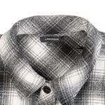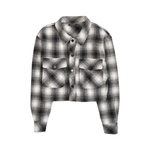 Lamarque cropped button down top in black and white plaid with two front flap pockets.