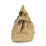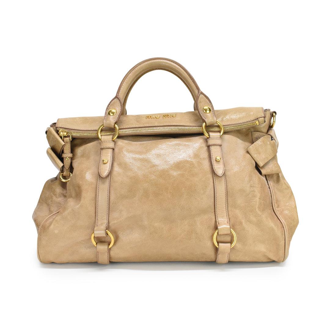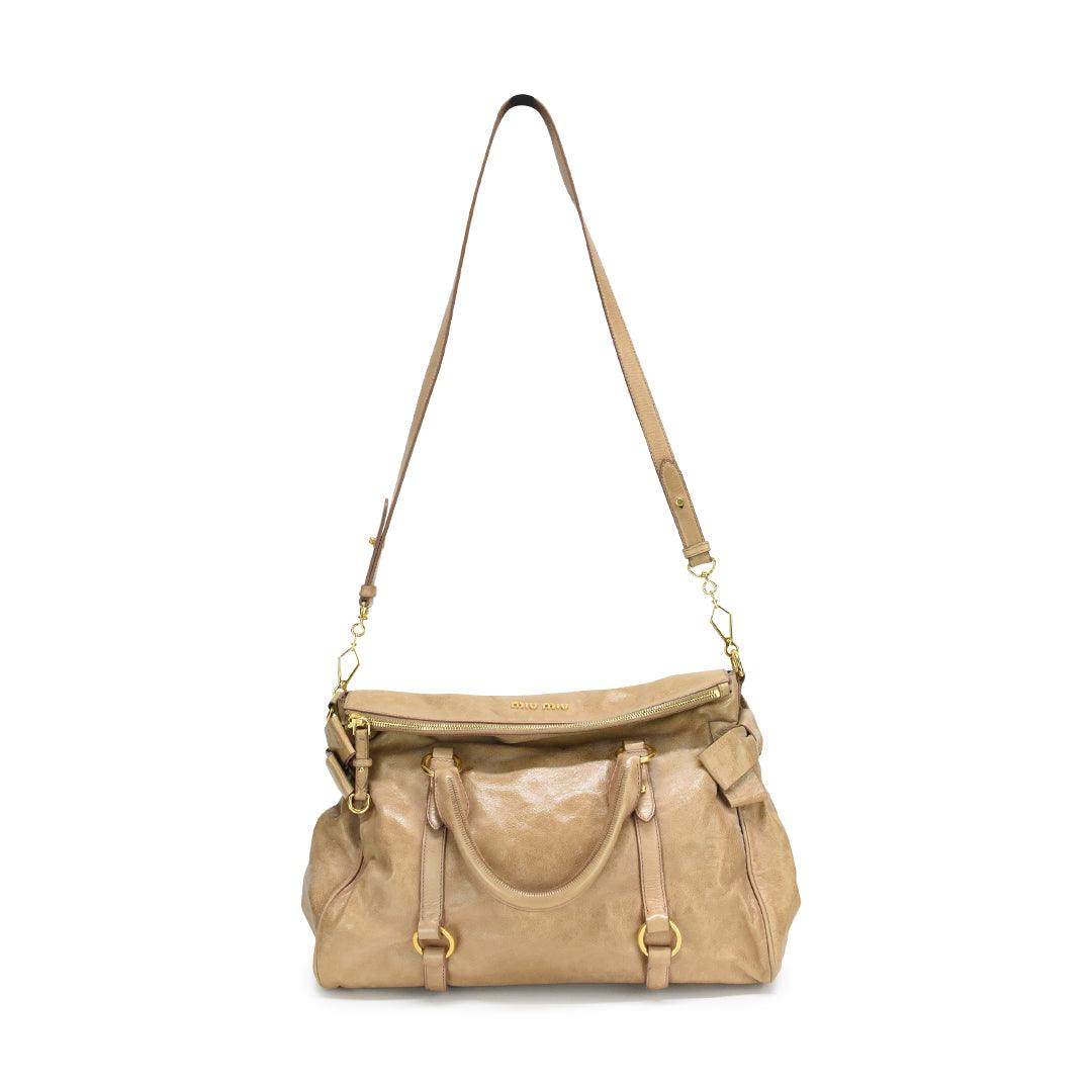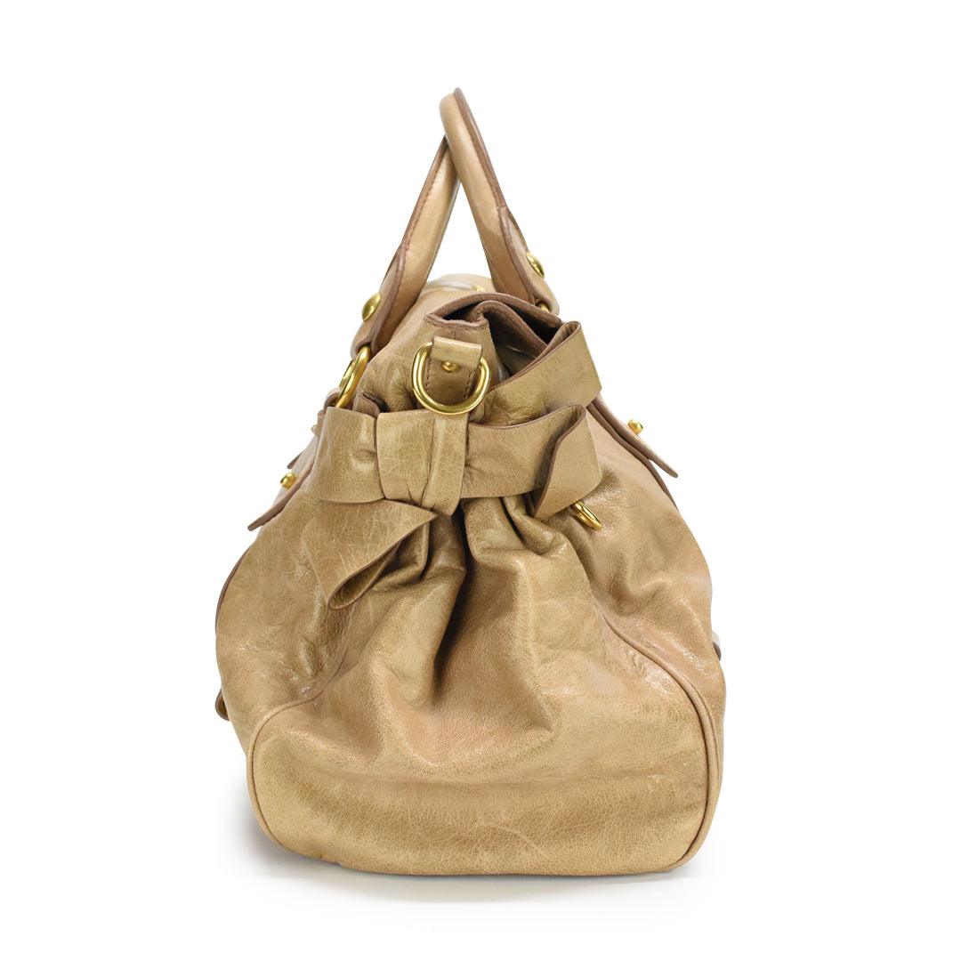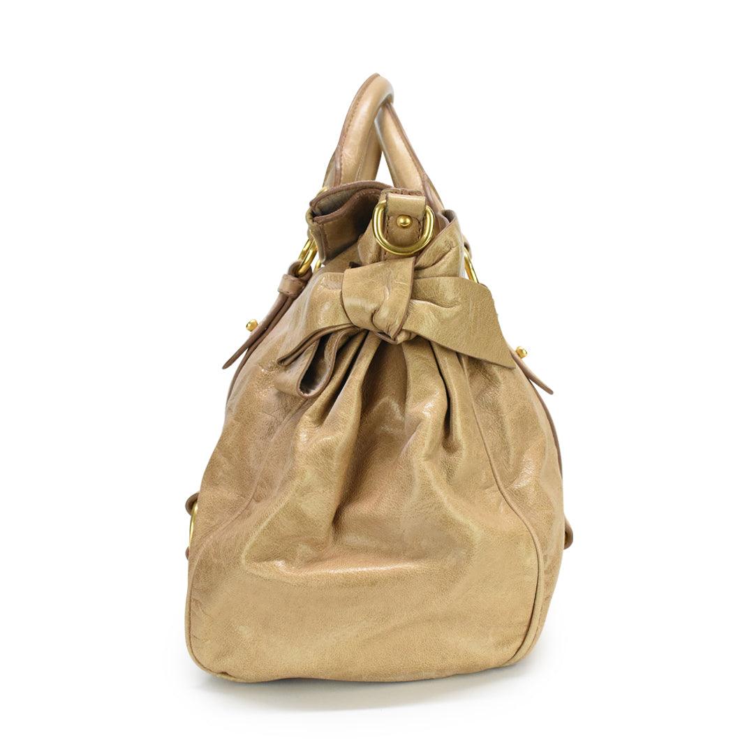 Miu Miu 'Bow' bag in tan glazed leather with harness straps and leather bows on both sides. Features zip closure that folds over, structured top handles, and a removable crossbody strap. Lined with dark brown cotton.