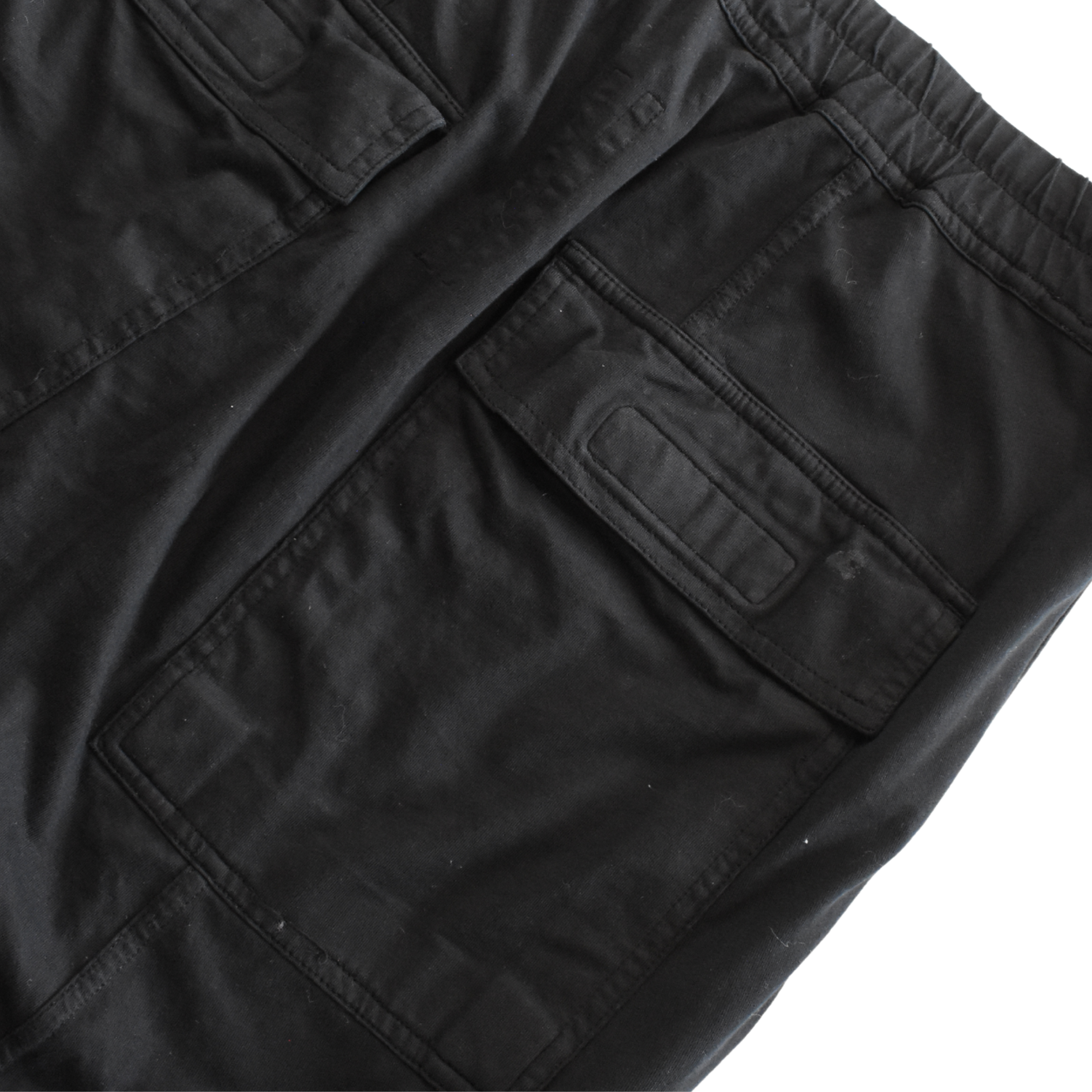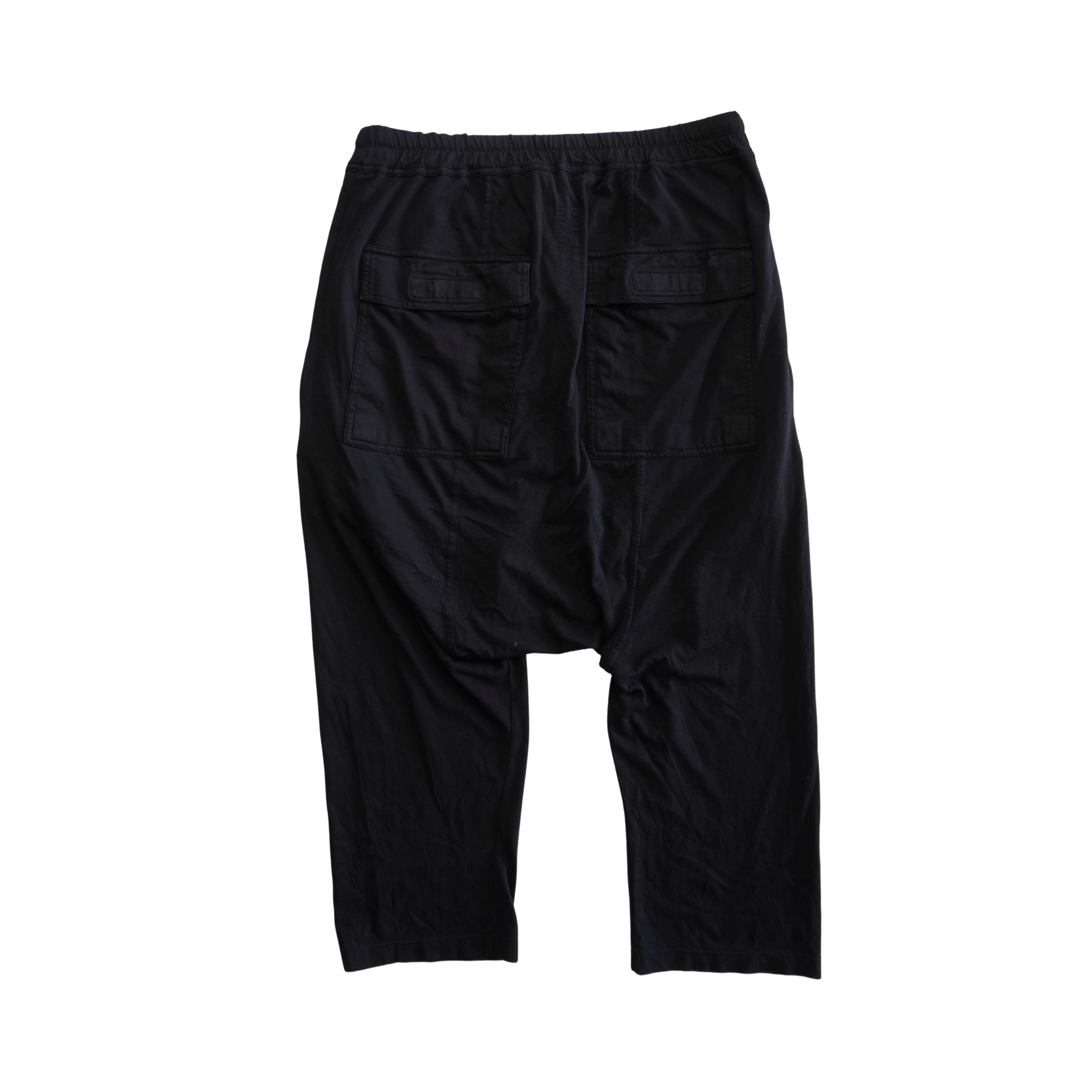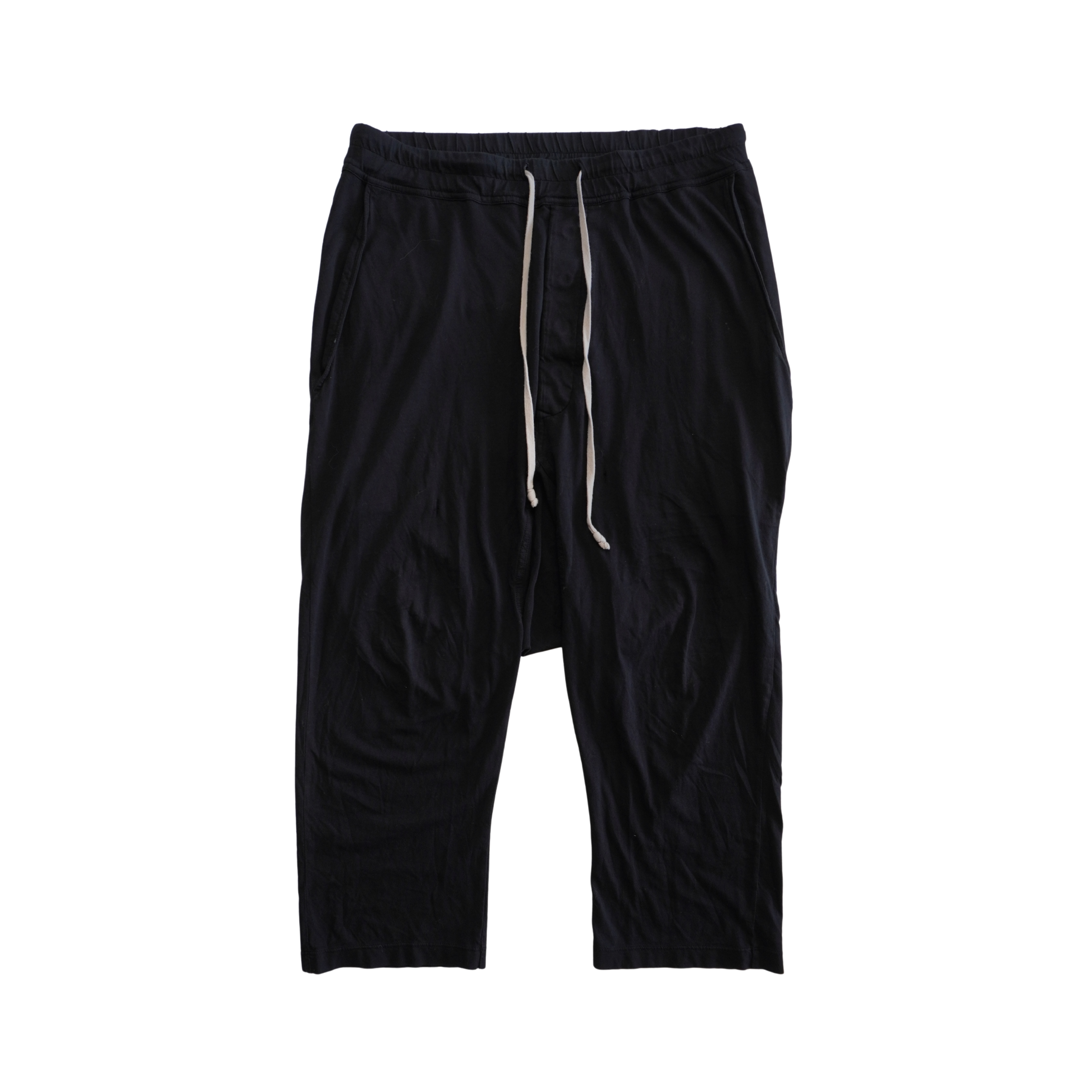 Rick Owens cropped pants in black cotton with a drop crotch and an elastic drawstring waistband with signature long cream drawstrings.