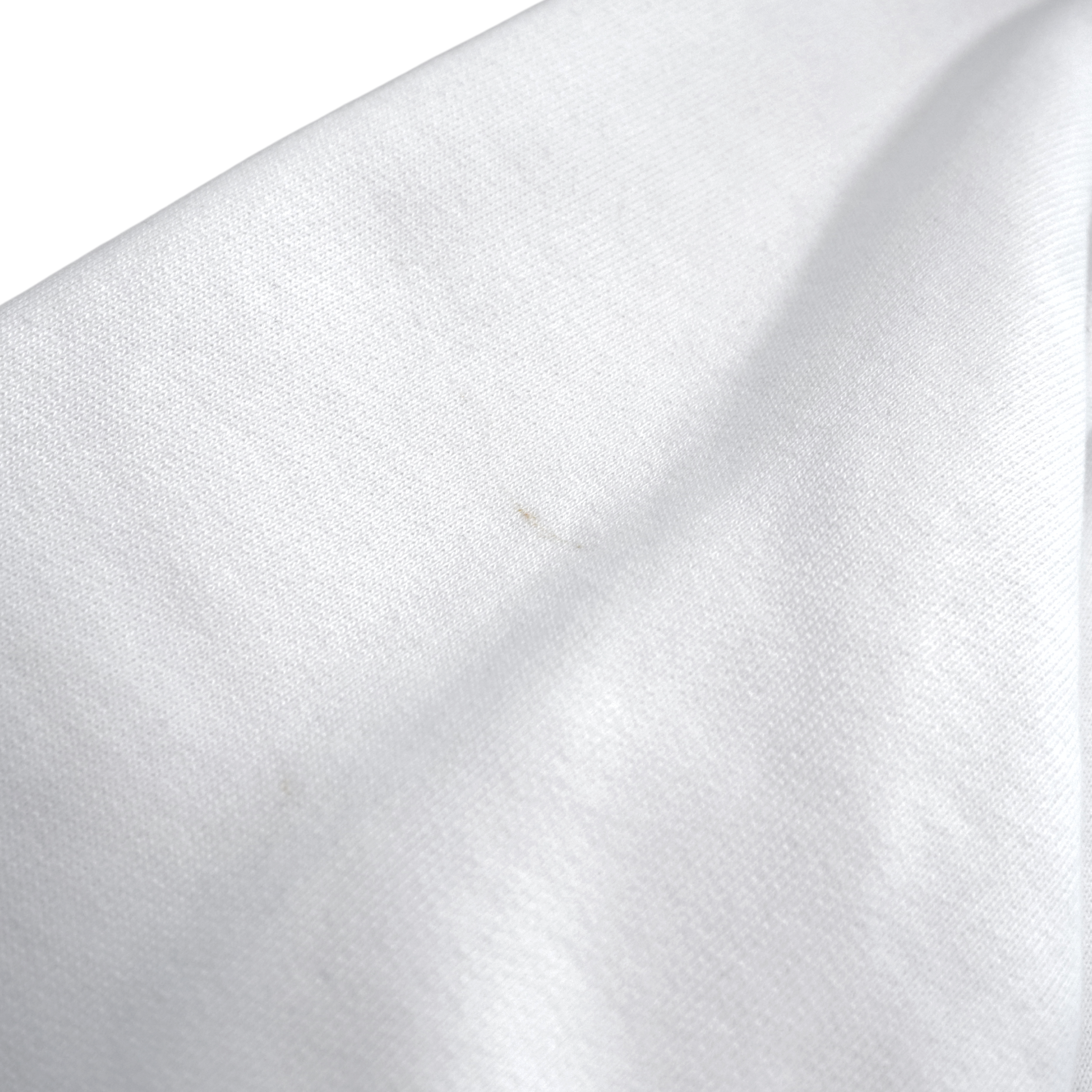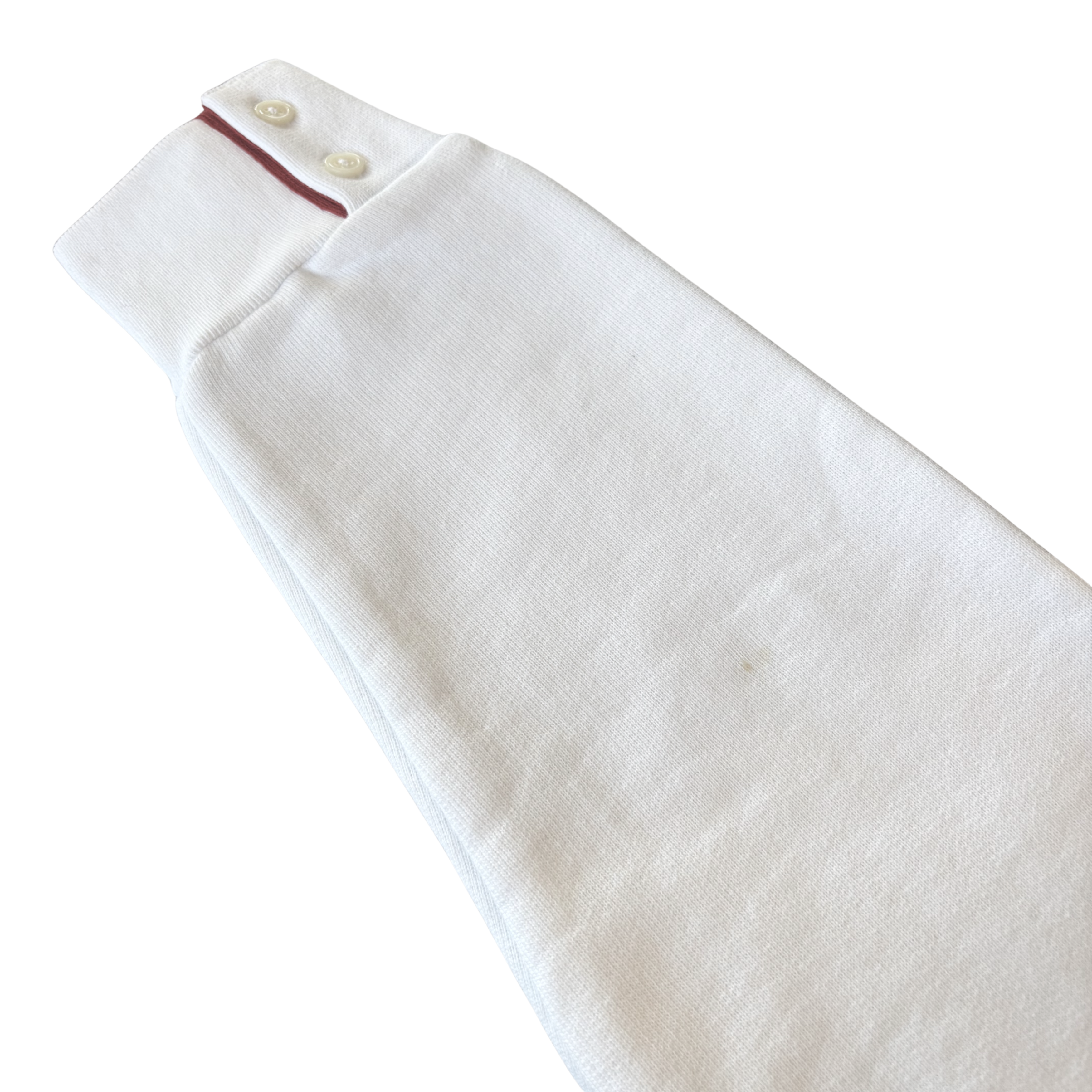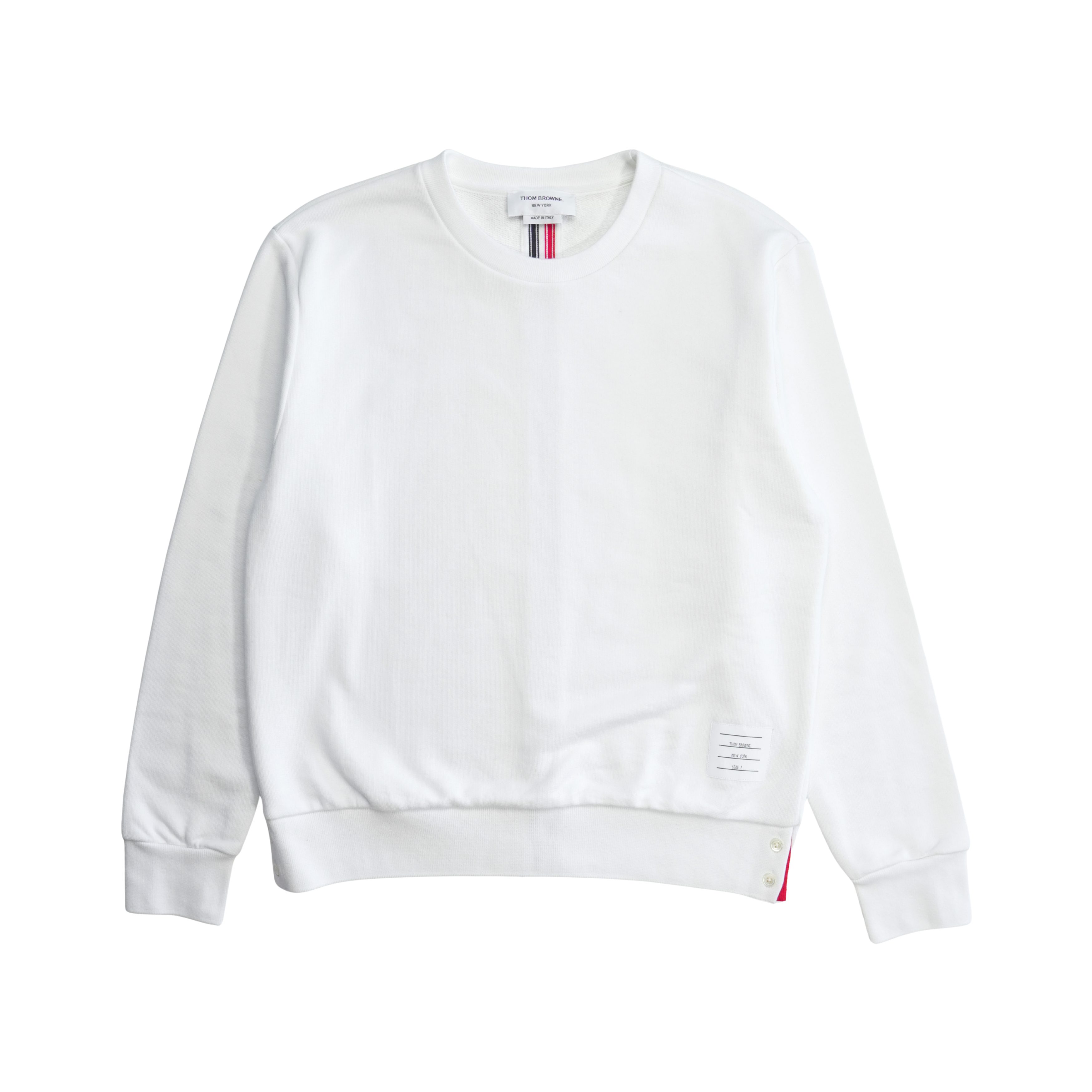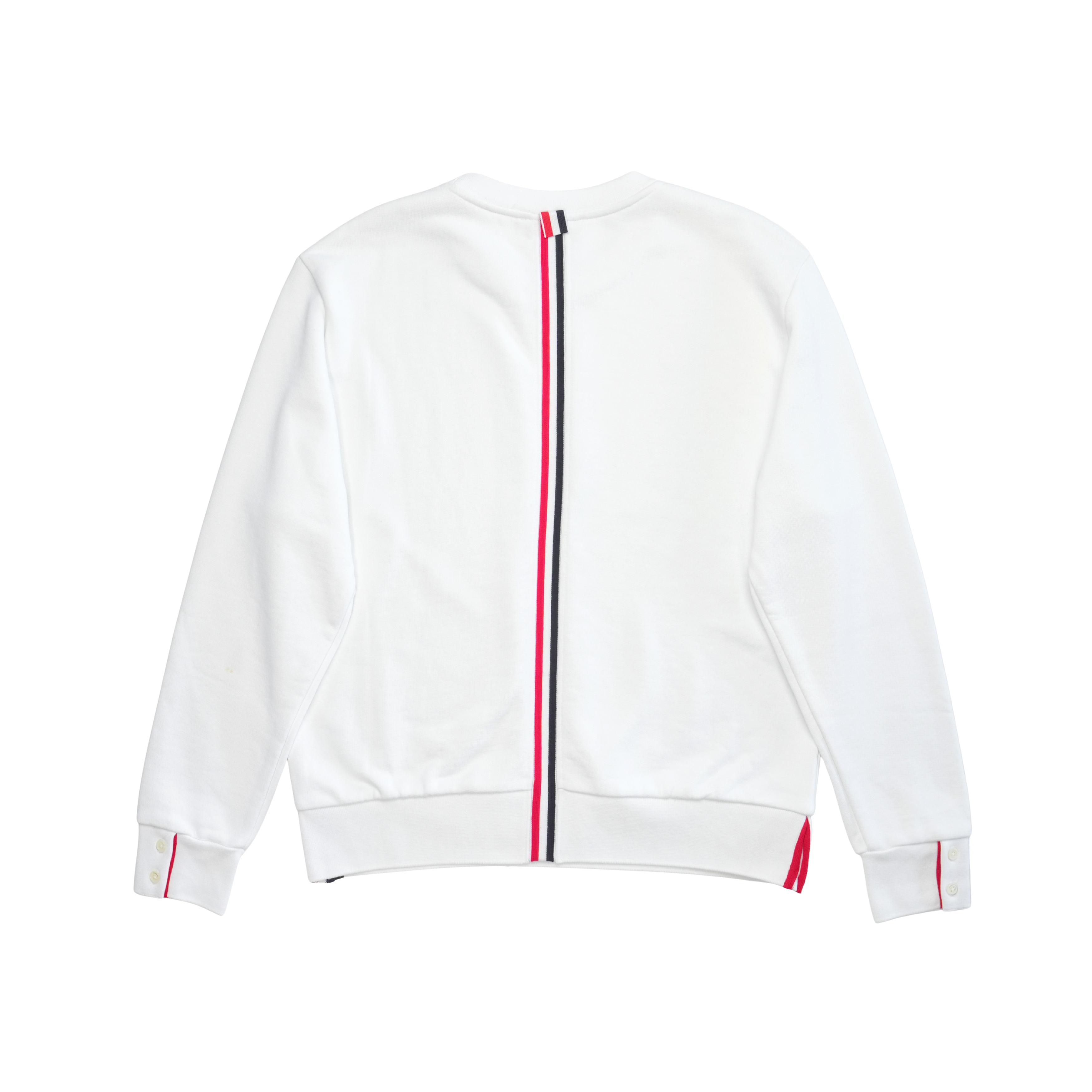 Thom Browne pullover sweater in white cotton with a signature red and blue stripe down the centre back, a white logo tab at the front hem, and button details on the hem and sleeves.