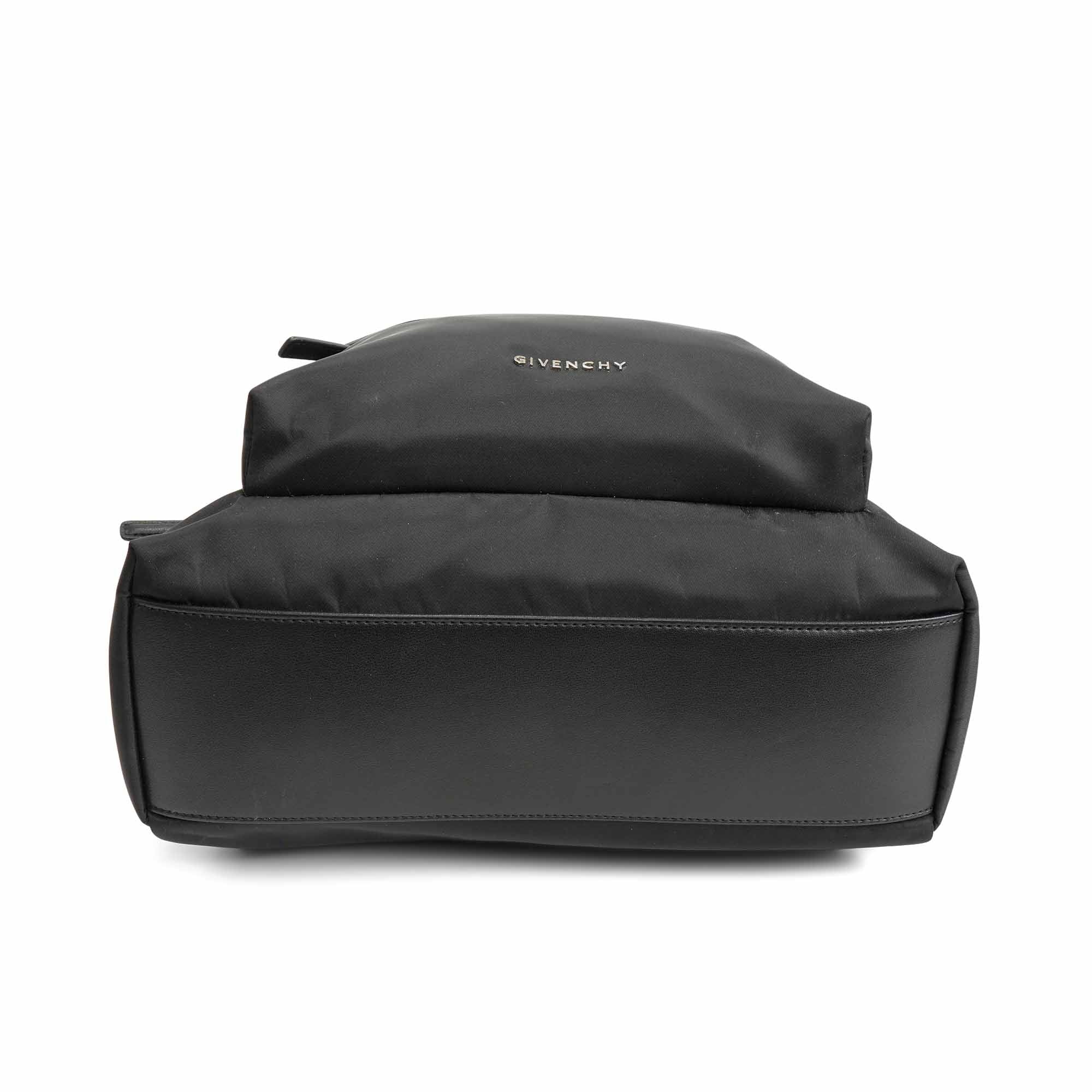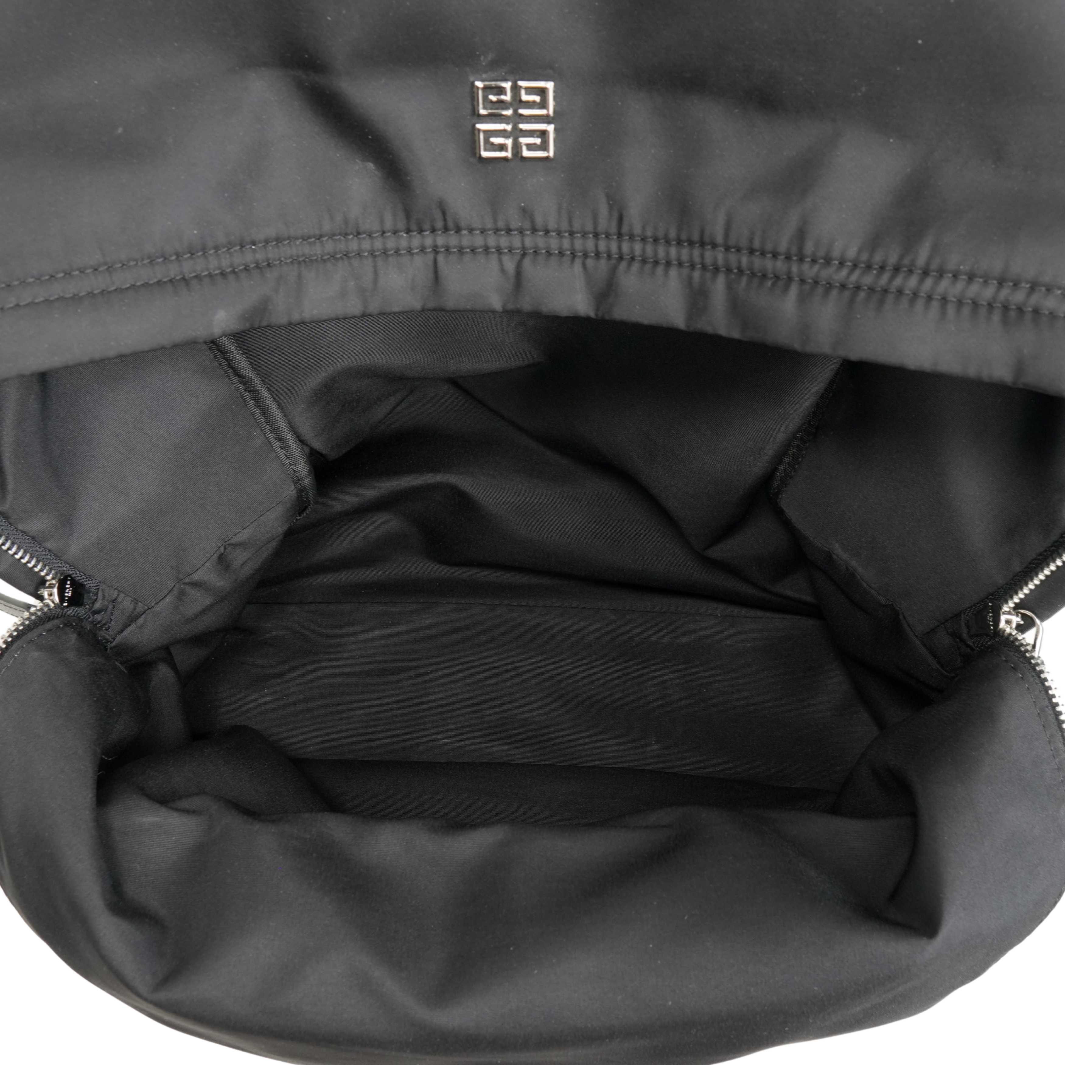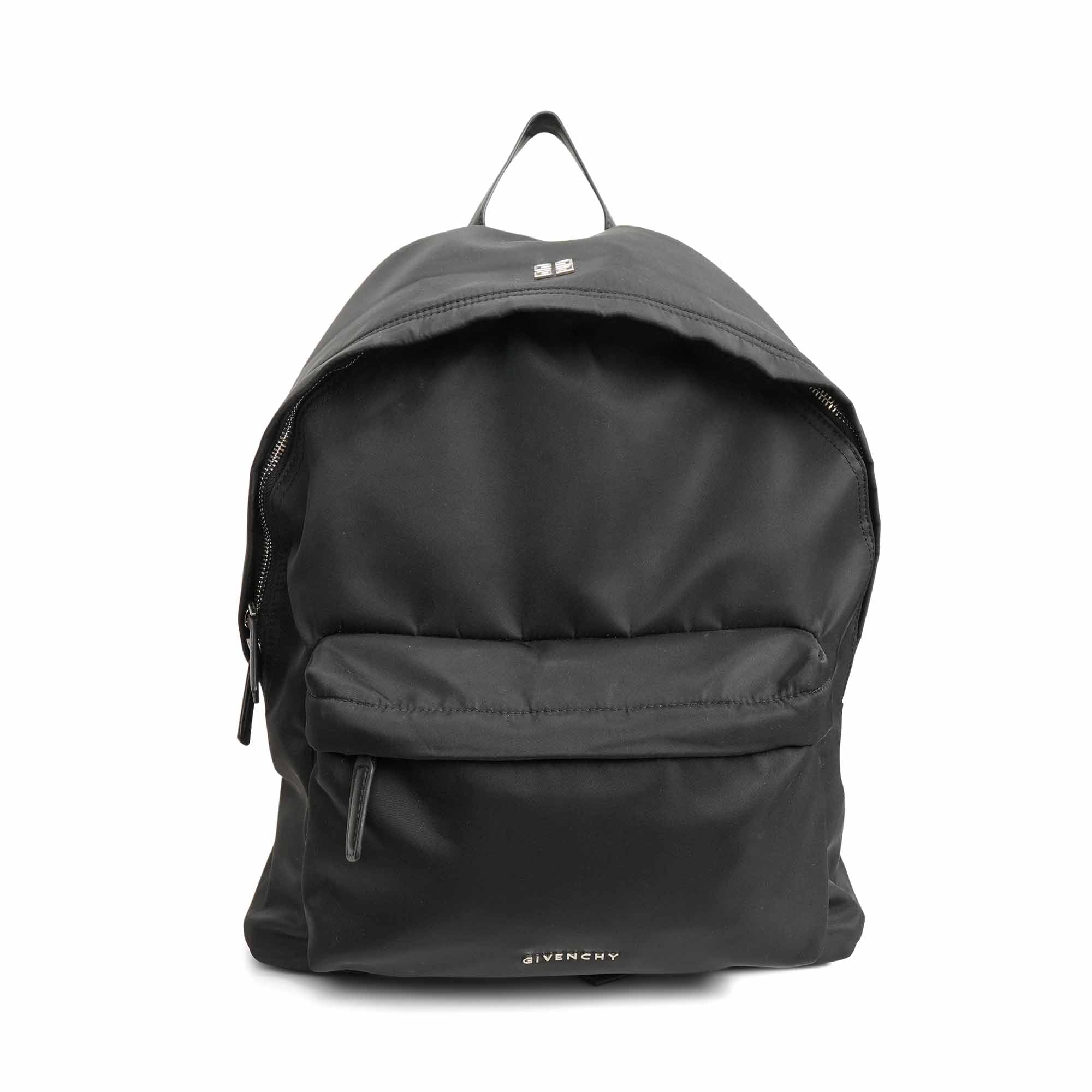 Givenchy backpack in black nylon with black leather trim, adjustable shoulder straps, and a front zip pocket with a silver metal logo monogram. The bag has a zip opening to the main compartment which is lined with black nylon and has a zip pocket.