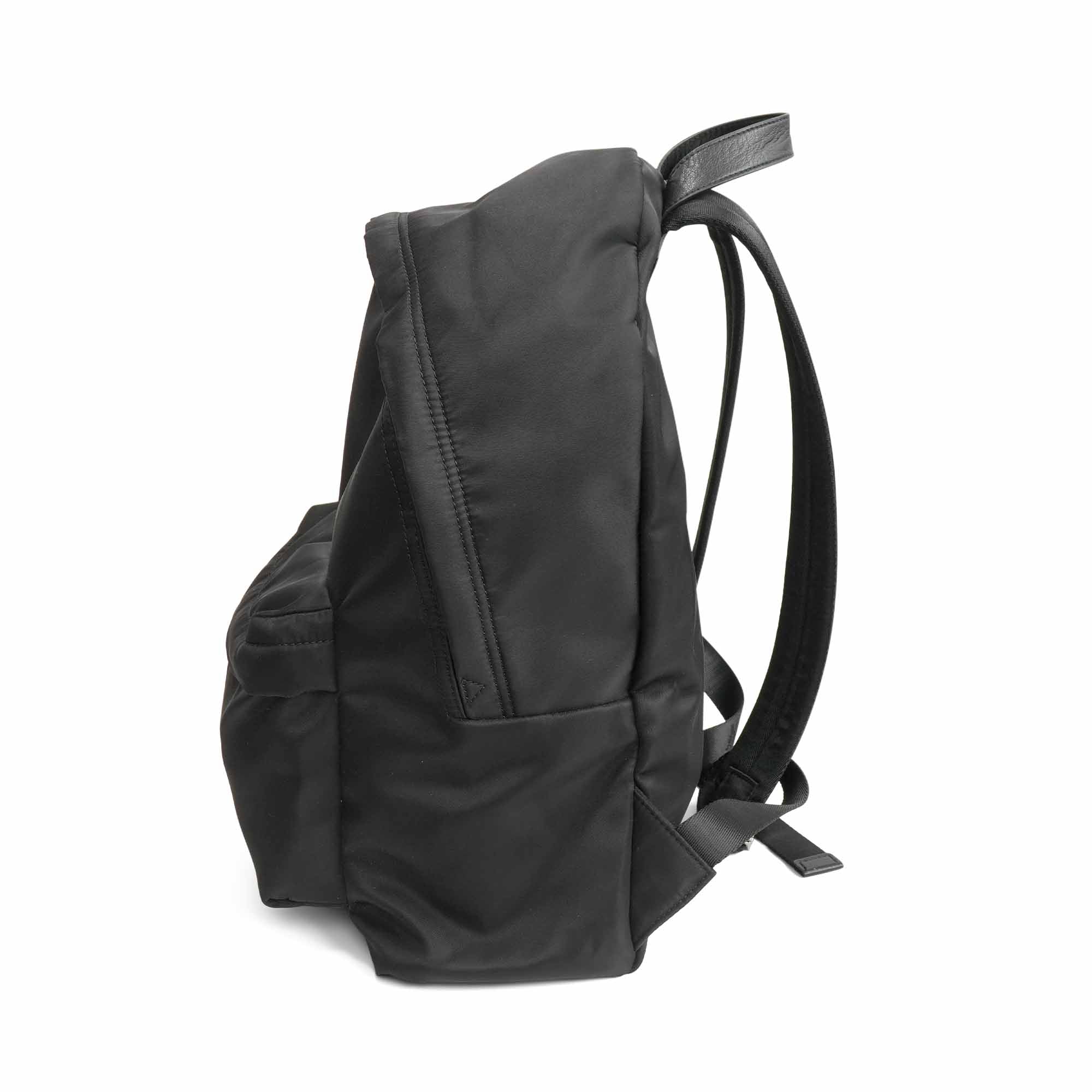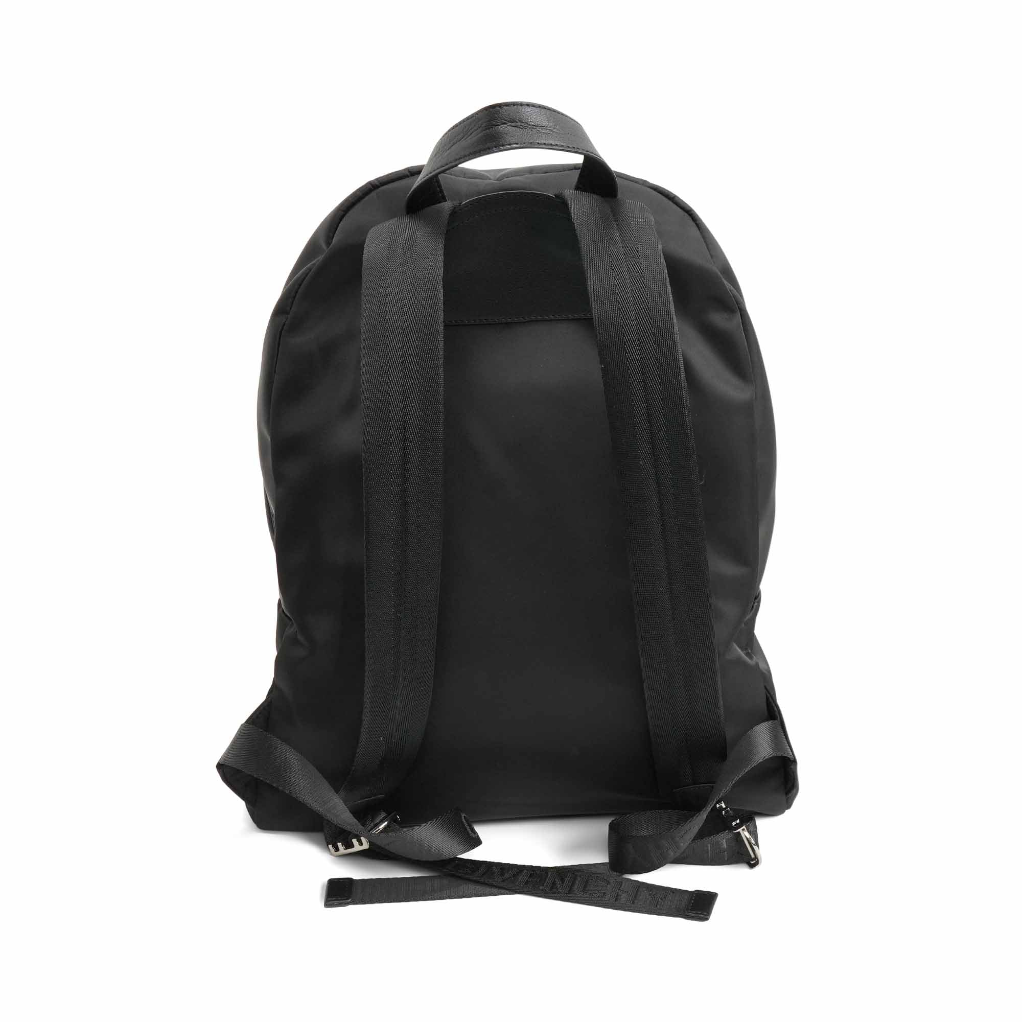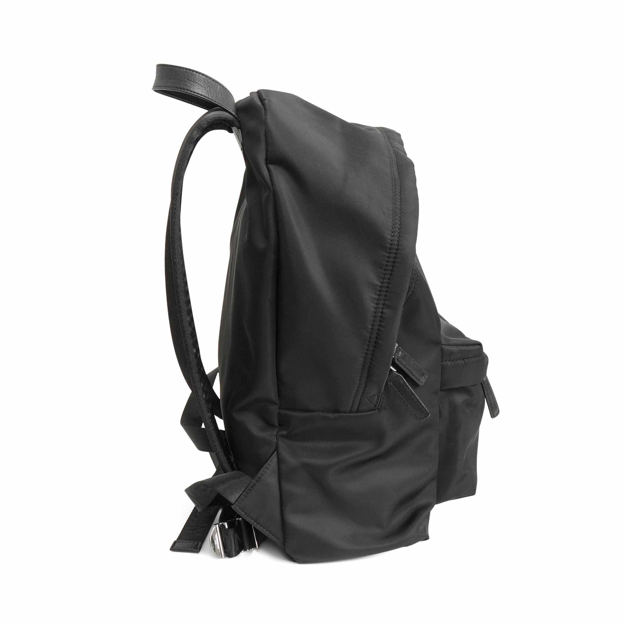 Givenchy backpack in black nylon with black leather trim, adjustable shoulder straps, and a front zip pocket with a silver metal logo monogram. The bag has a zip opening to the main compartment which is lined with black nylon and has a zip pocket.