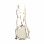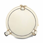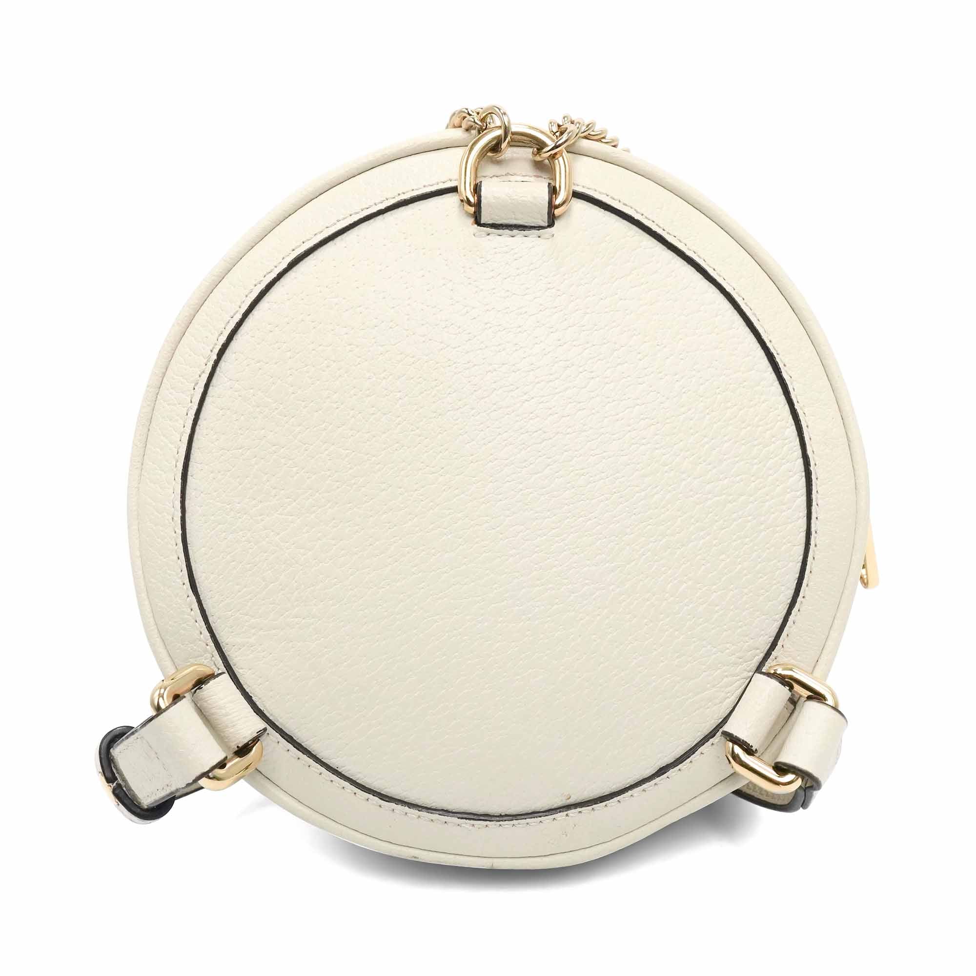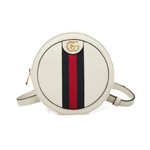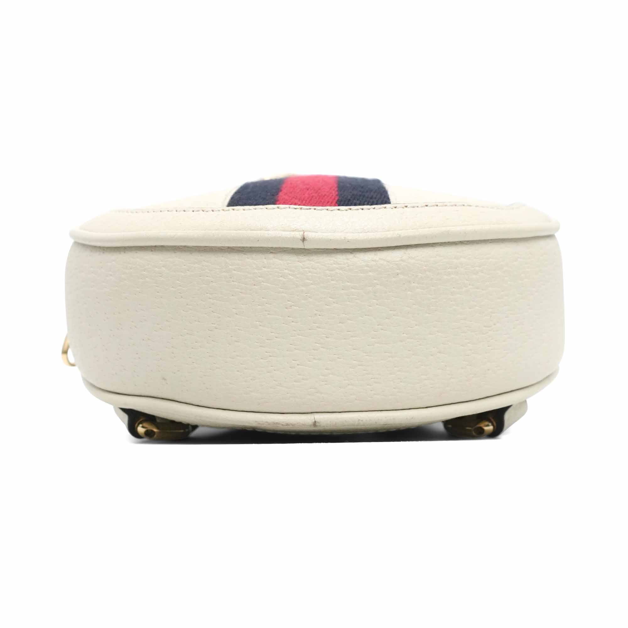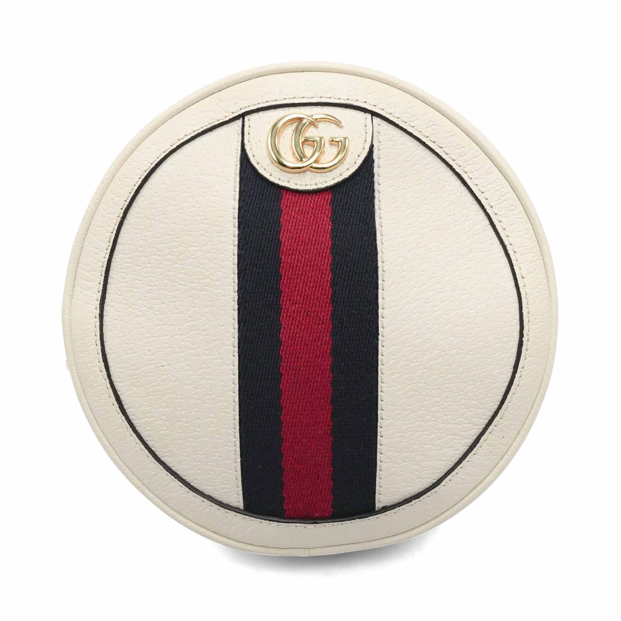 Gucci 'Ophidia' round mini backpack in cream leather with navy and red woven stripe down front and a gold GG logo. Features adjustable leather and gold chain backpack straps and interior card pockets.