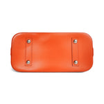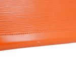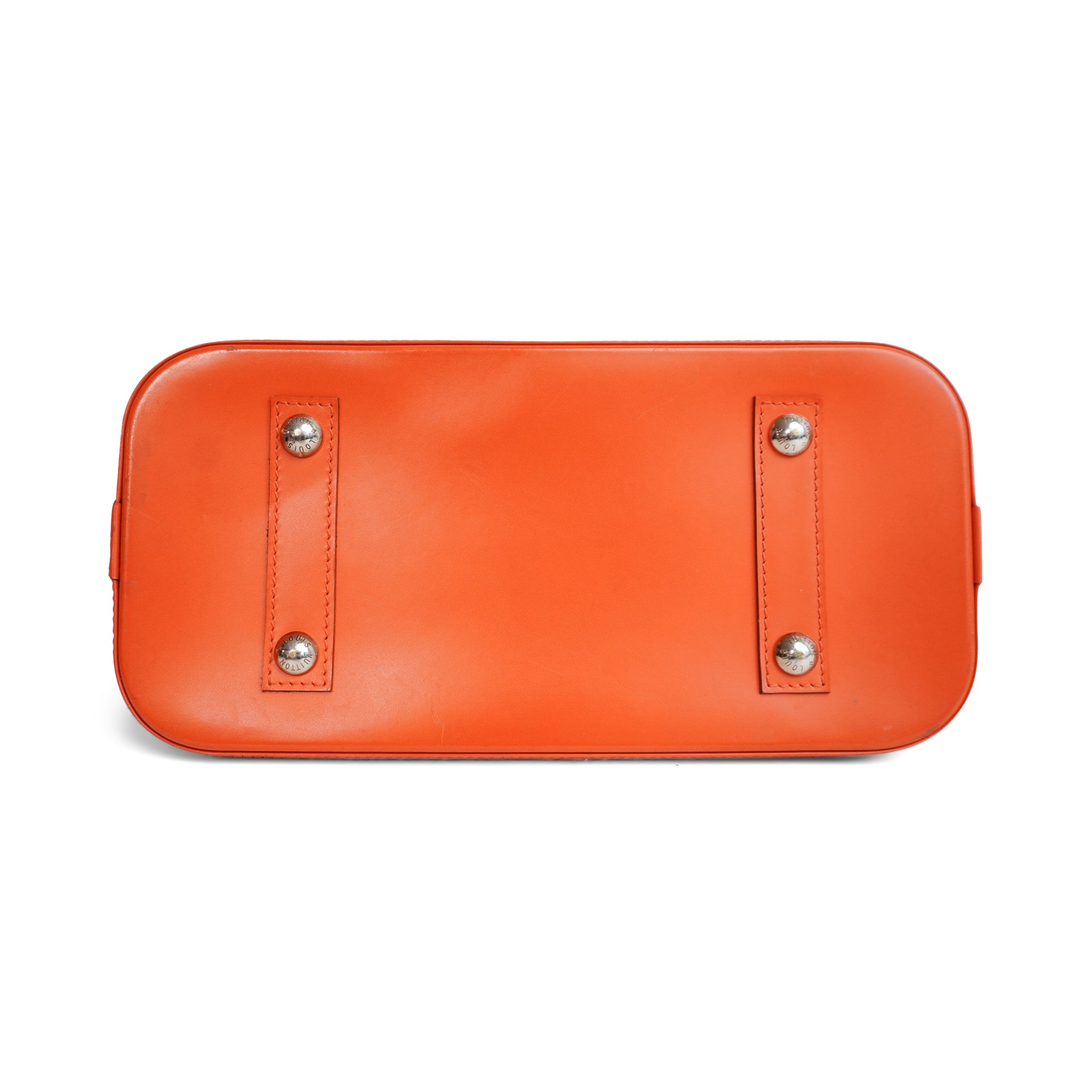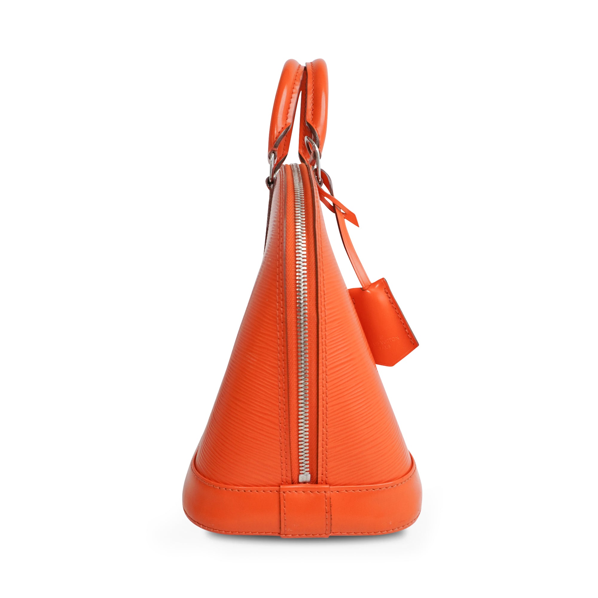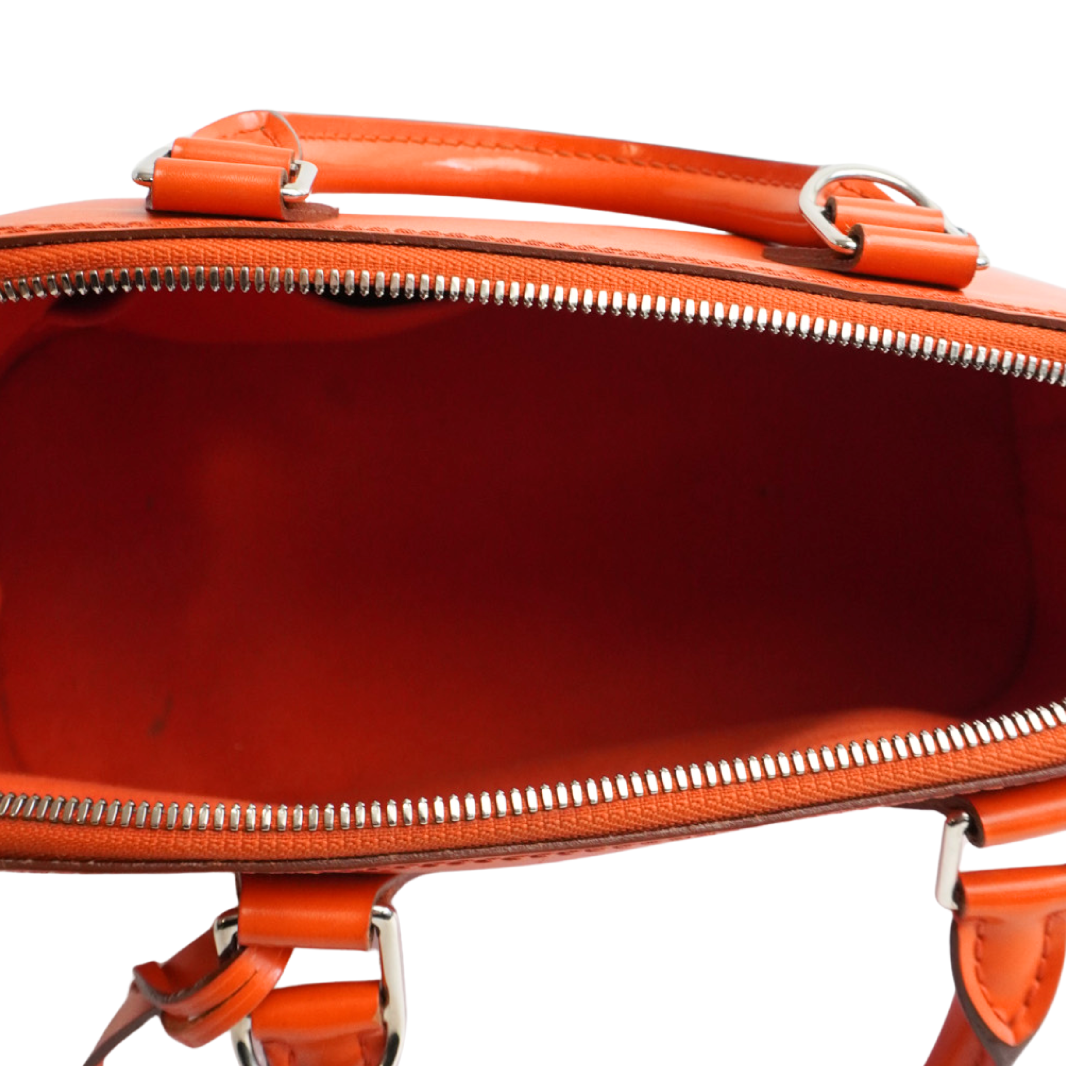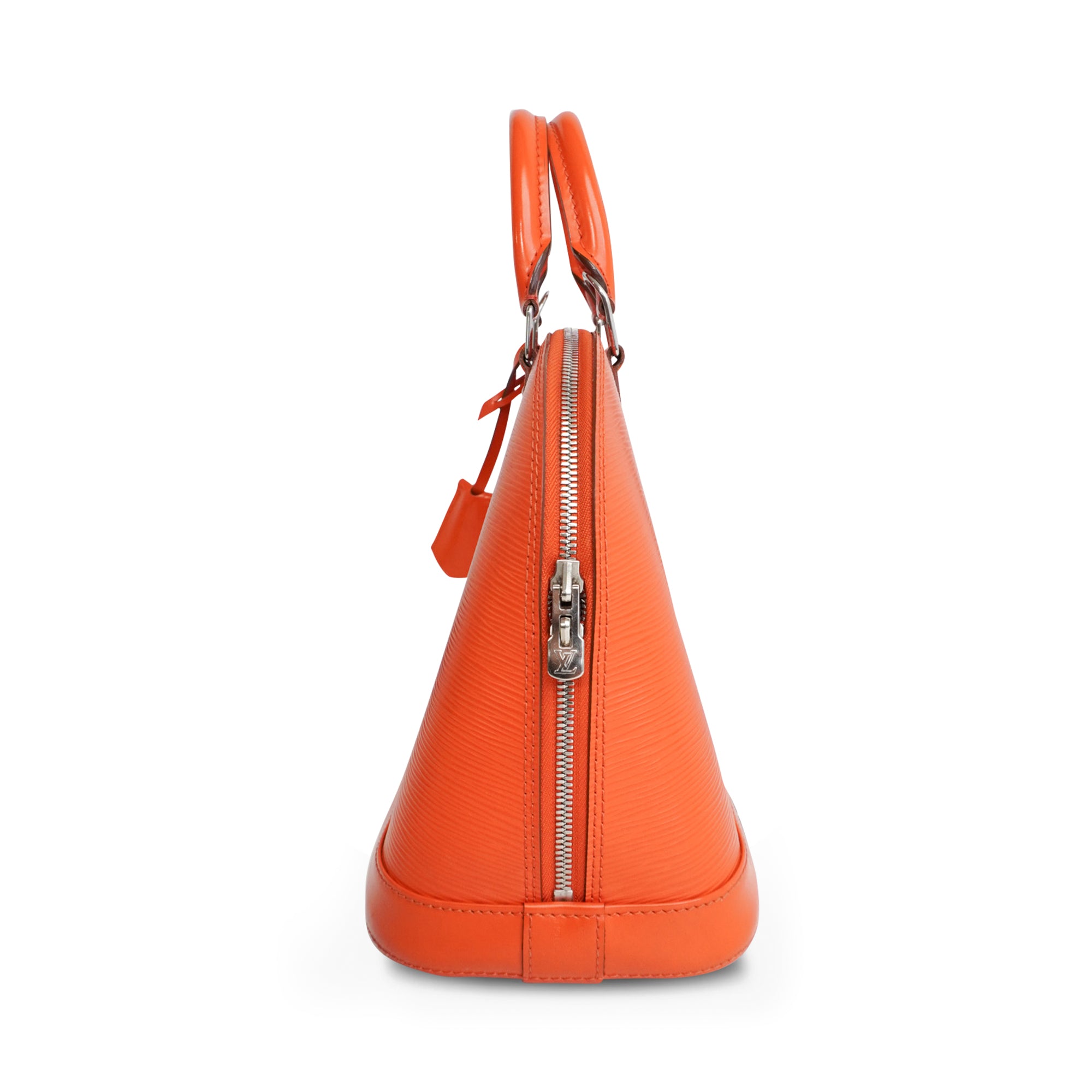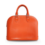 Louis Vuitton 'Alma MM' handbag in orange epi leather with dual rolled top handles, silver hardware, and and top-zip closure. The interior is lined with orange suede and has two slip pockets.