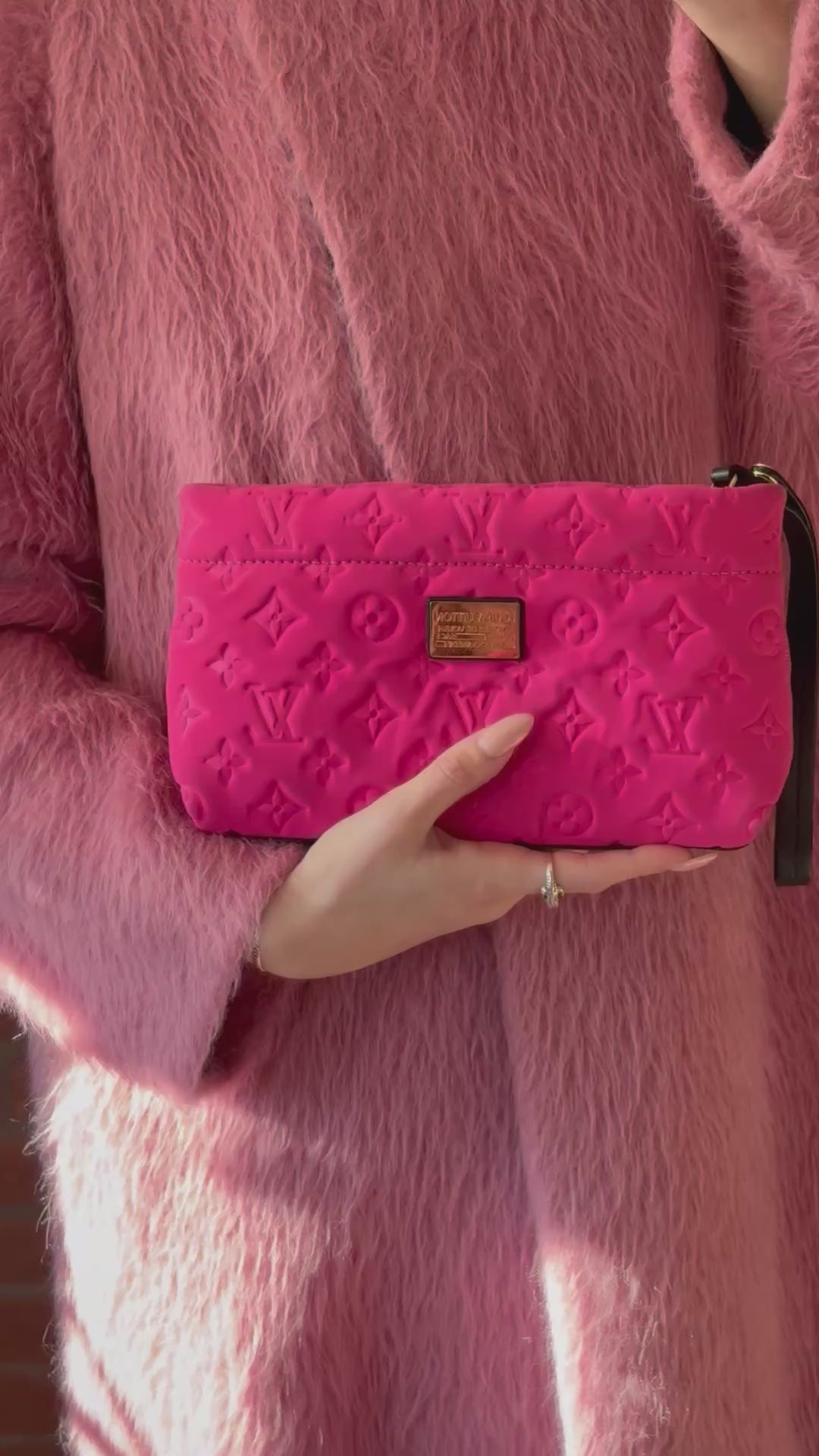 Louis Vuitton 'Pochette Scuba' wristlet bag in hot pink monogram embossed neoprene with a gold metal logo plaque on the front and a black leather base panel. The bag has a top zip opening in gold hardware with a black leather wristlet strap attached to the zipper pull.