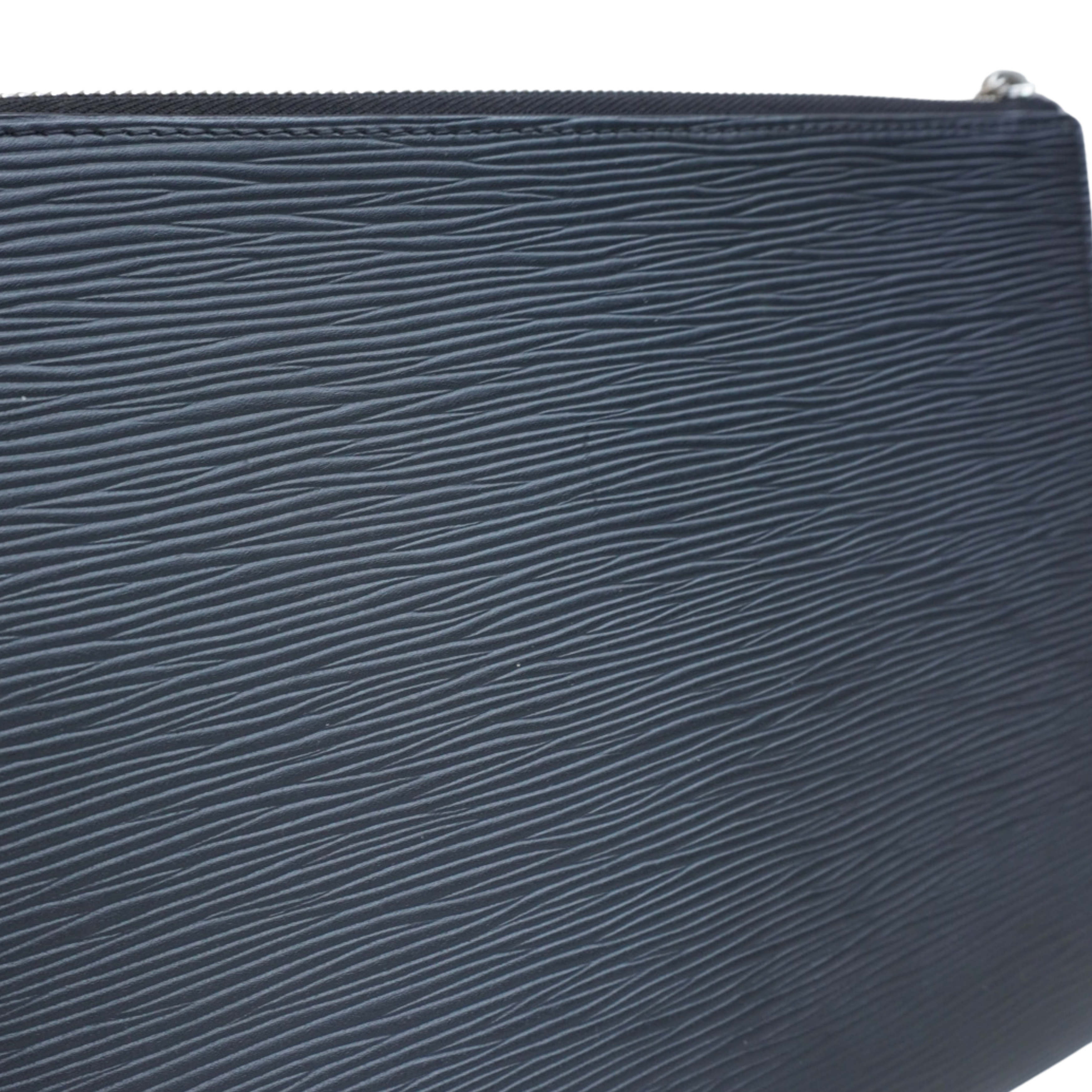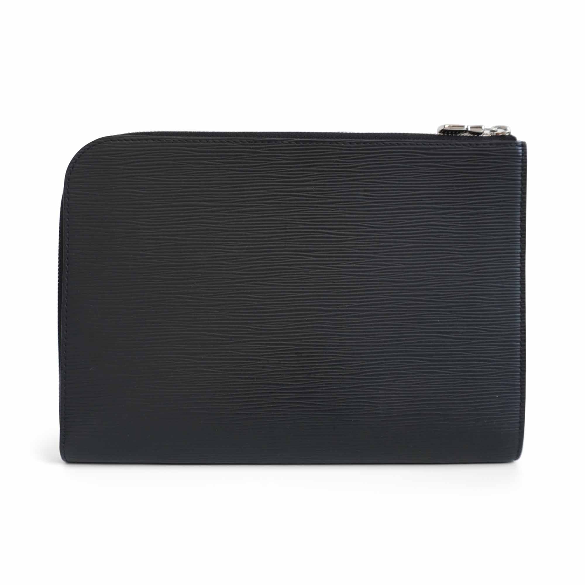 Louis Vuitton 'Posh Documen' clutch in black Épi leather with a corner-embossed logo, silver-tone zip-around closure, and tonal stitching. Features six interior card slots and a full-length bill compartment.
