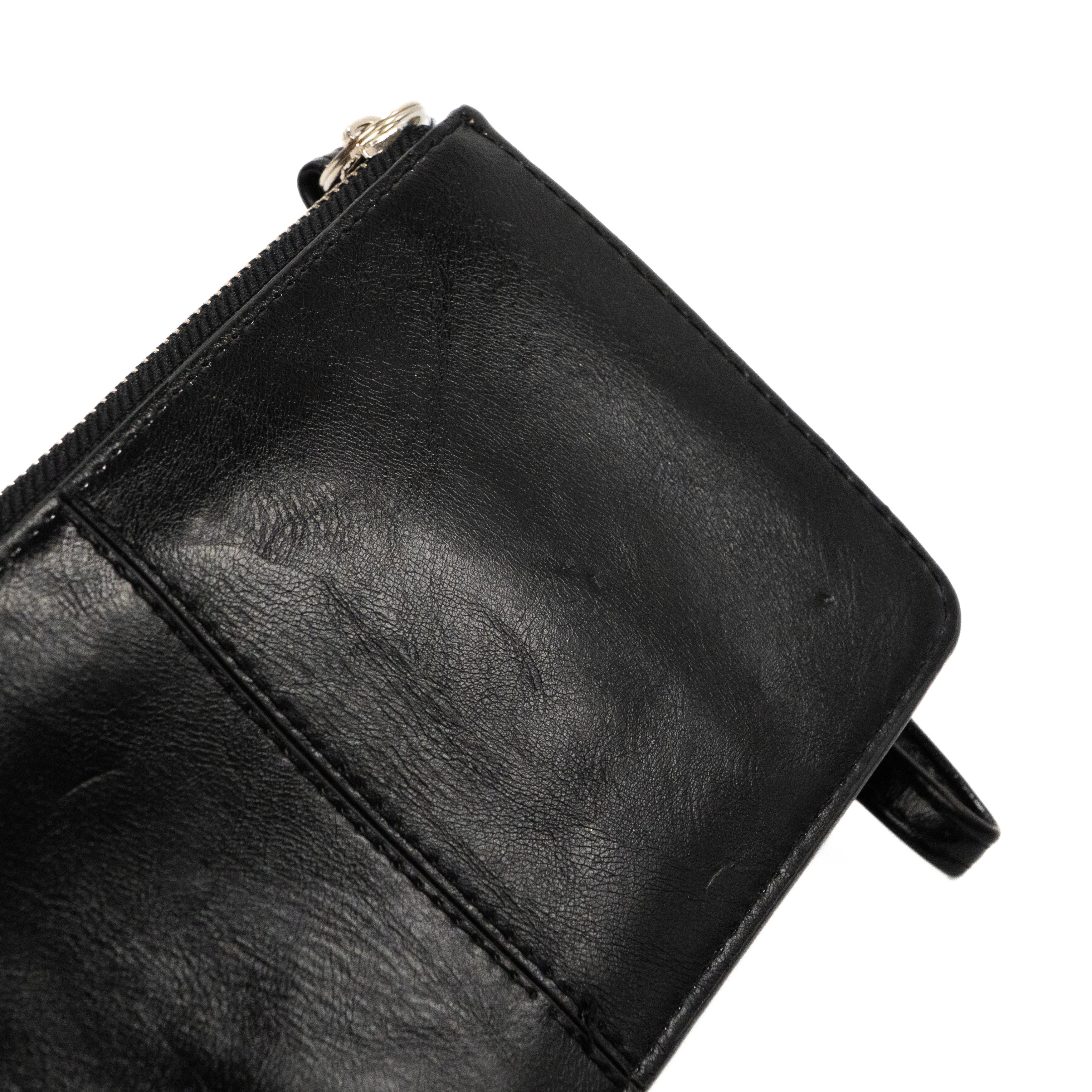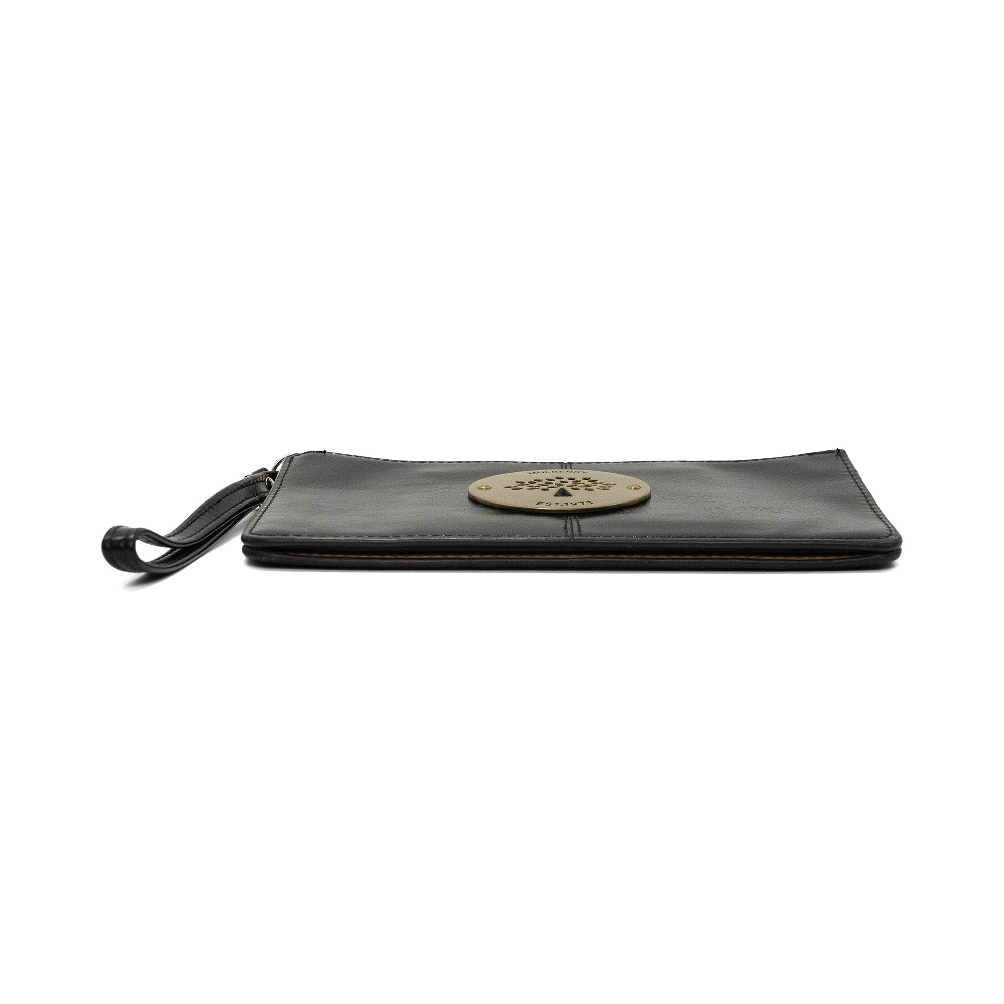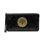 Mulberry 'Daria' black smooth shiny leather wristlet pouch. Features a gold circular logo plaque on the front, an inner zip pocket, two inner slip pockets with card sections inside, and a black leather wrist loop on zip.