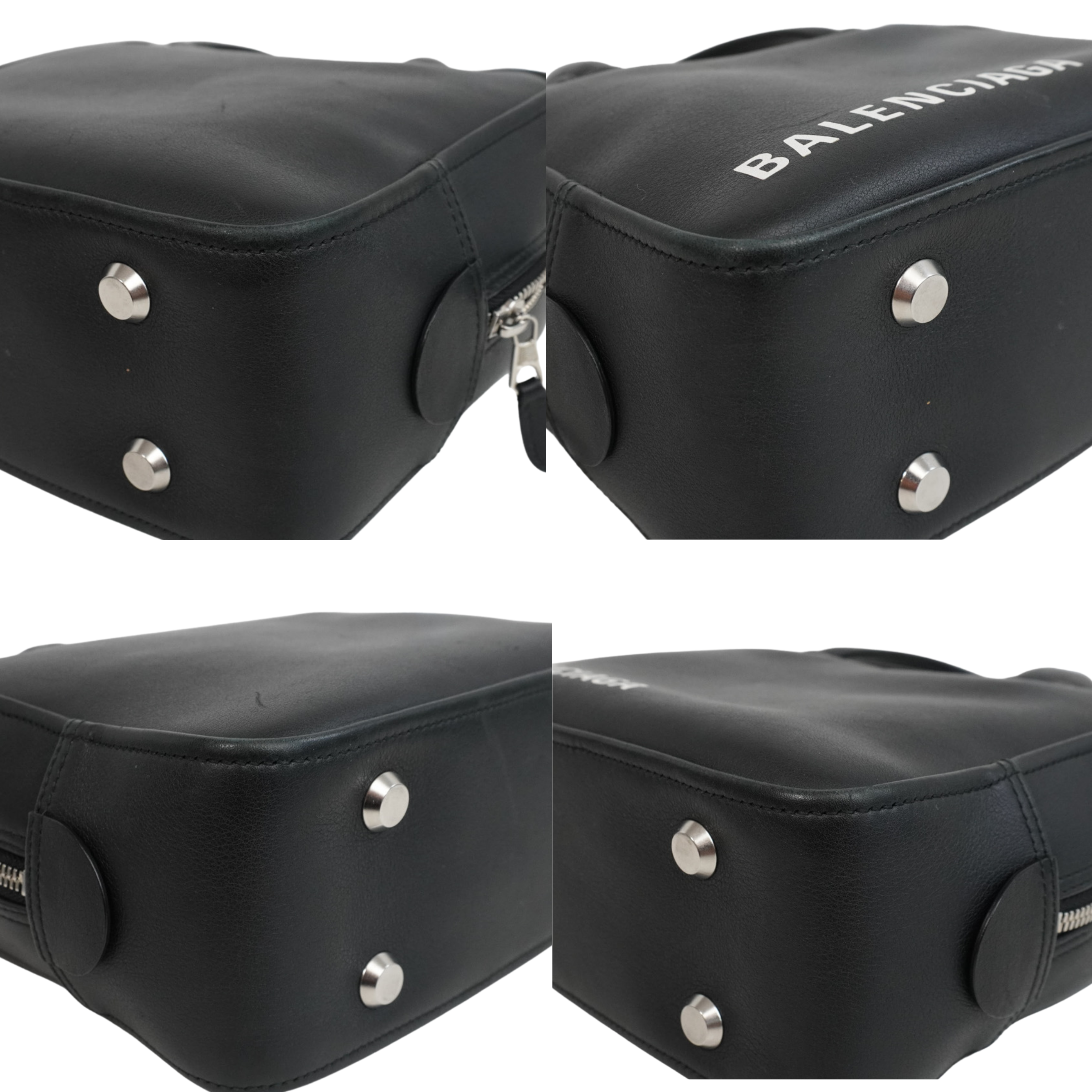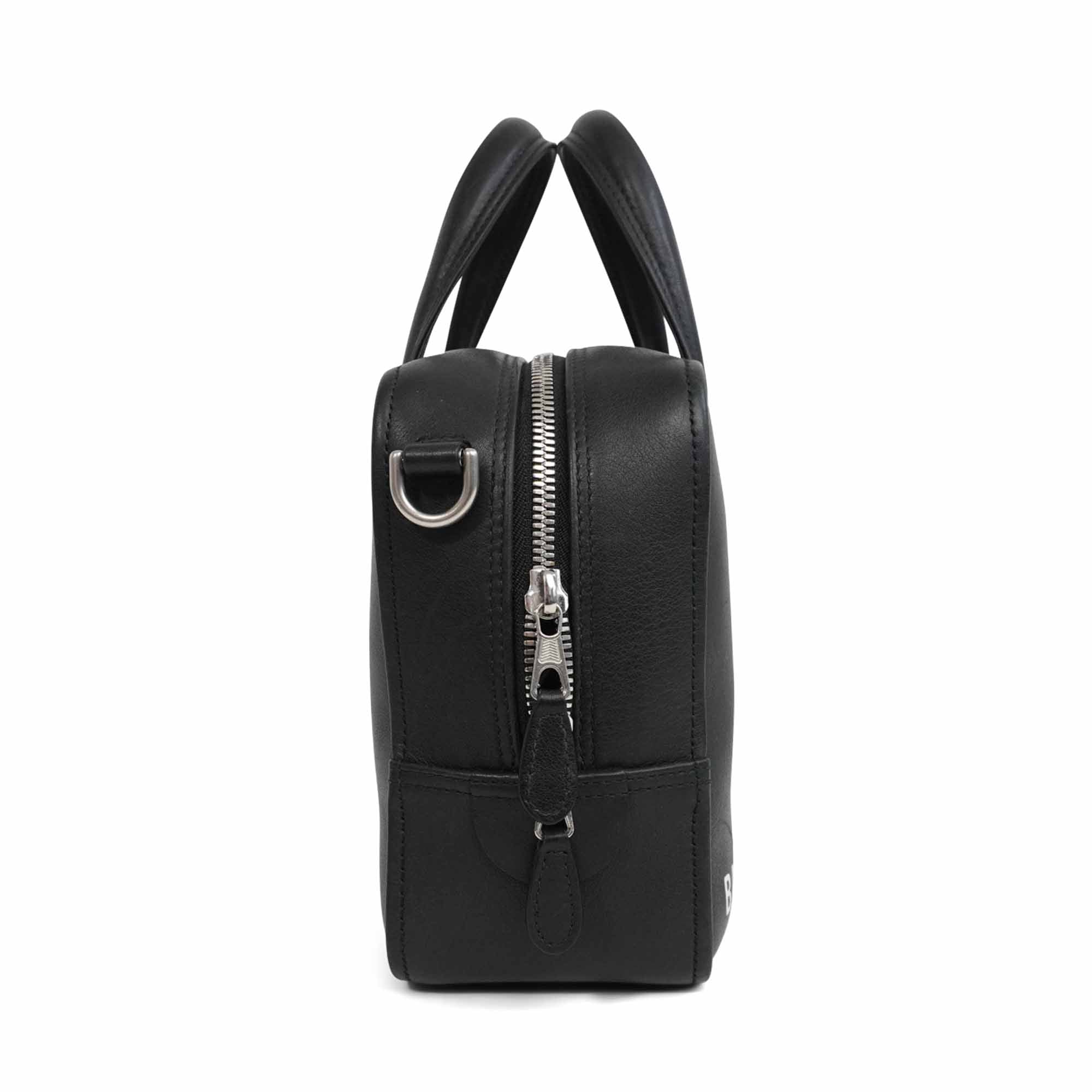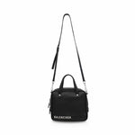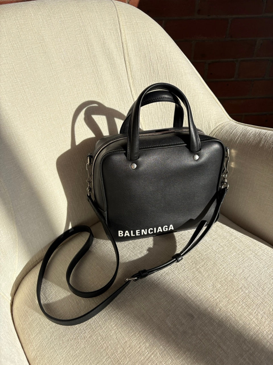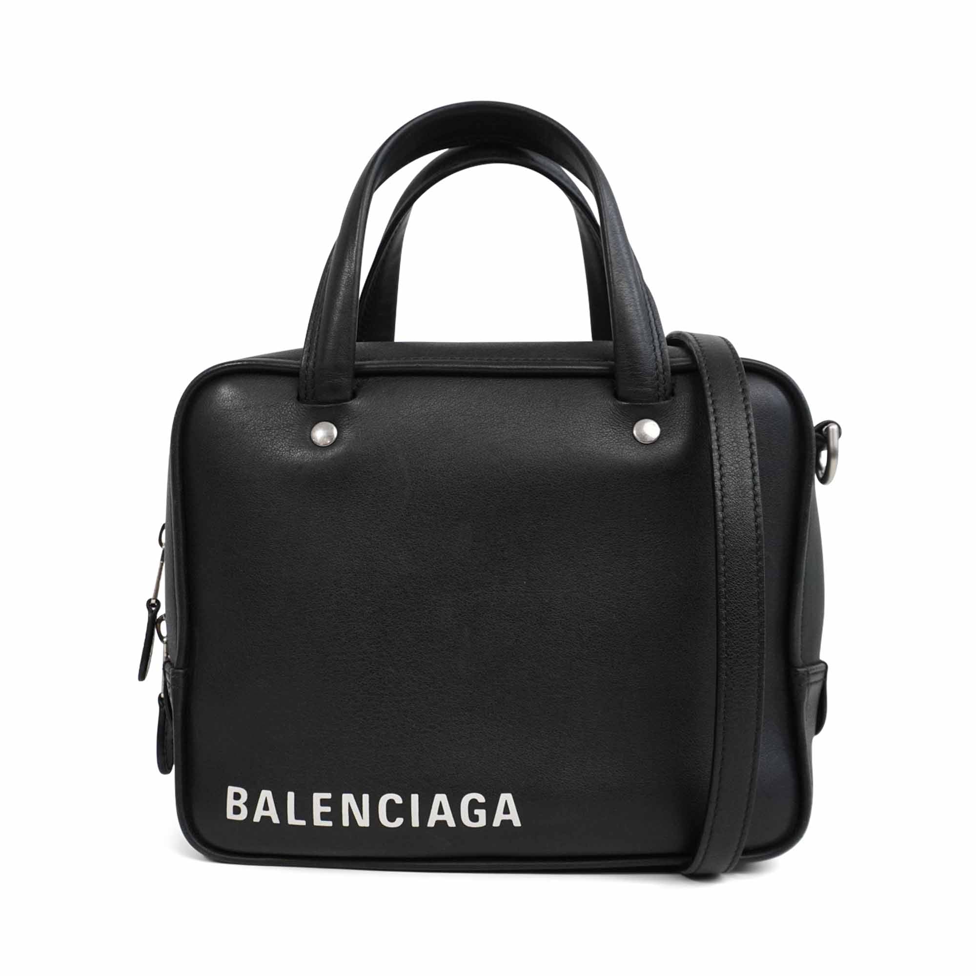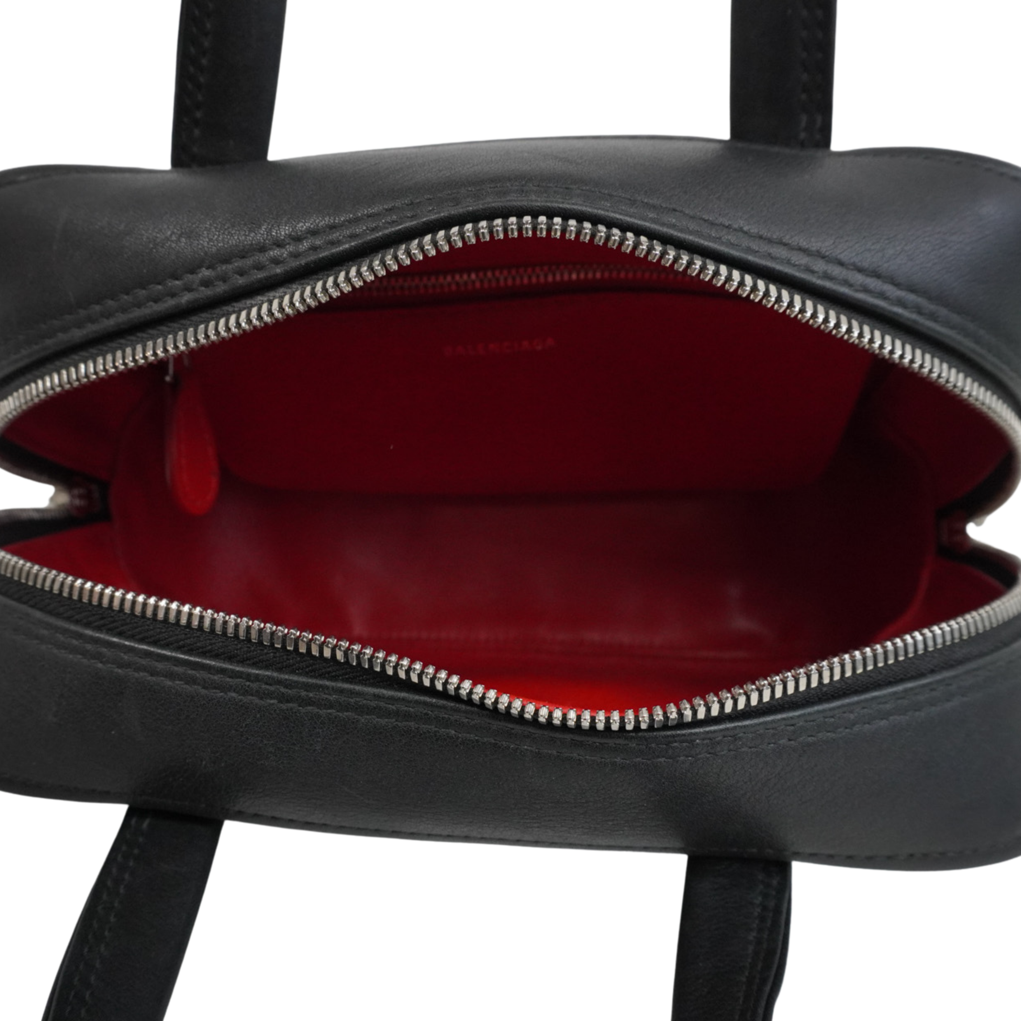 Balenciaga 'Triangle Square XS' handbag in black smooth leather with a white logo monogram across the front, dual top handles, and a removable crossbody strap. The bag has a top zip opening in silver hardware revealing a red leather lined interior with slip pockets.