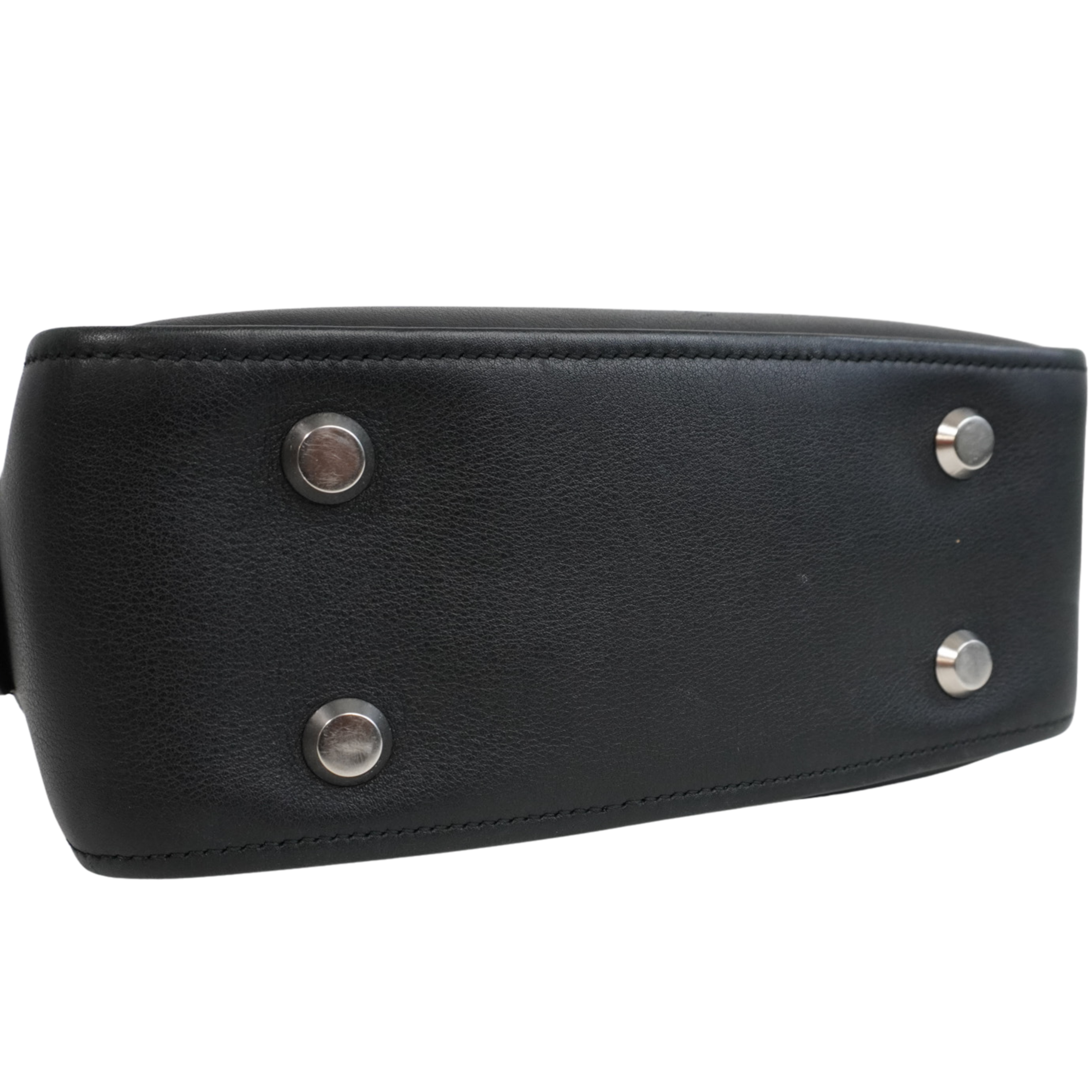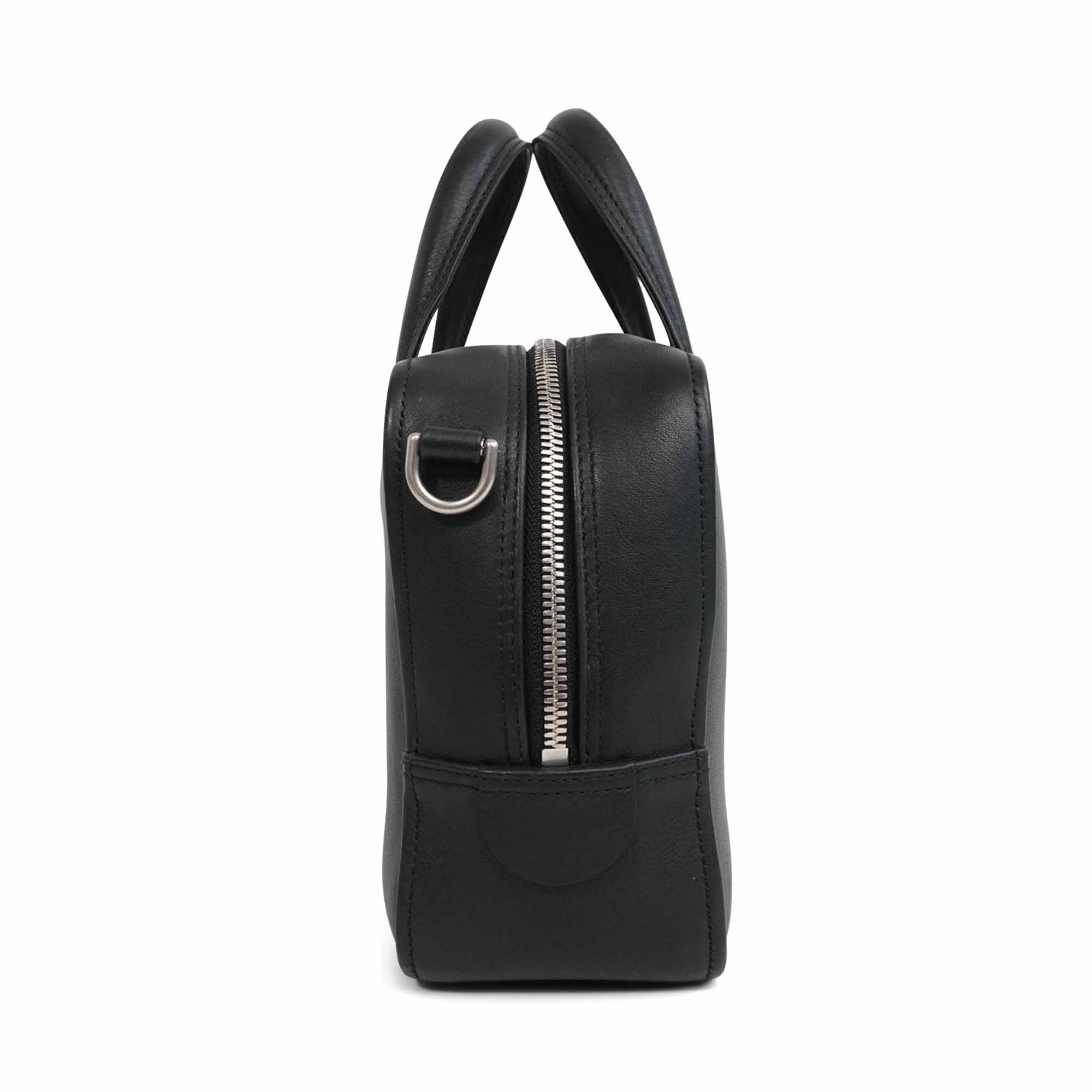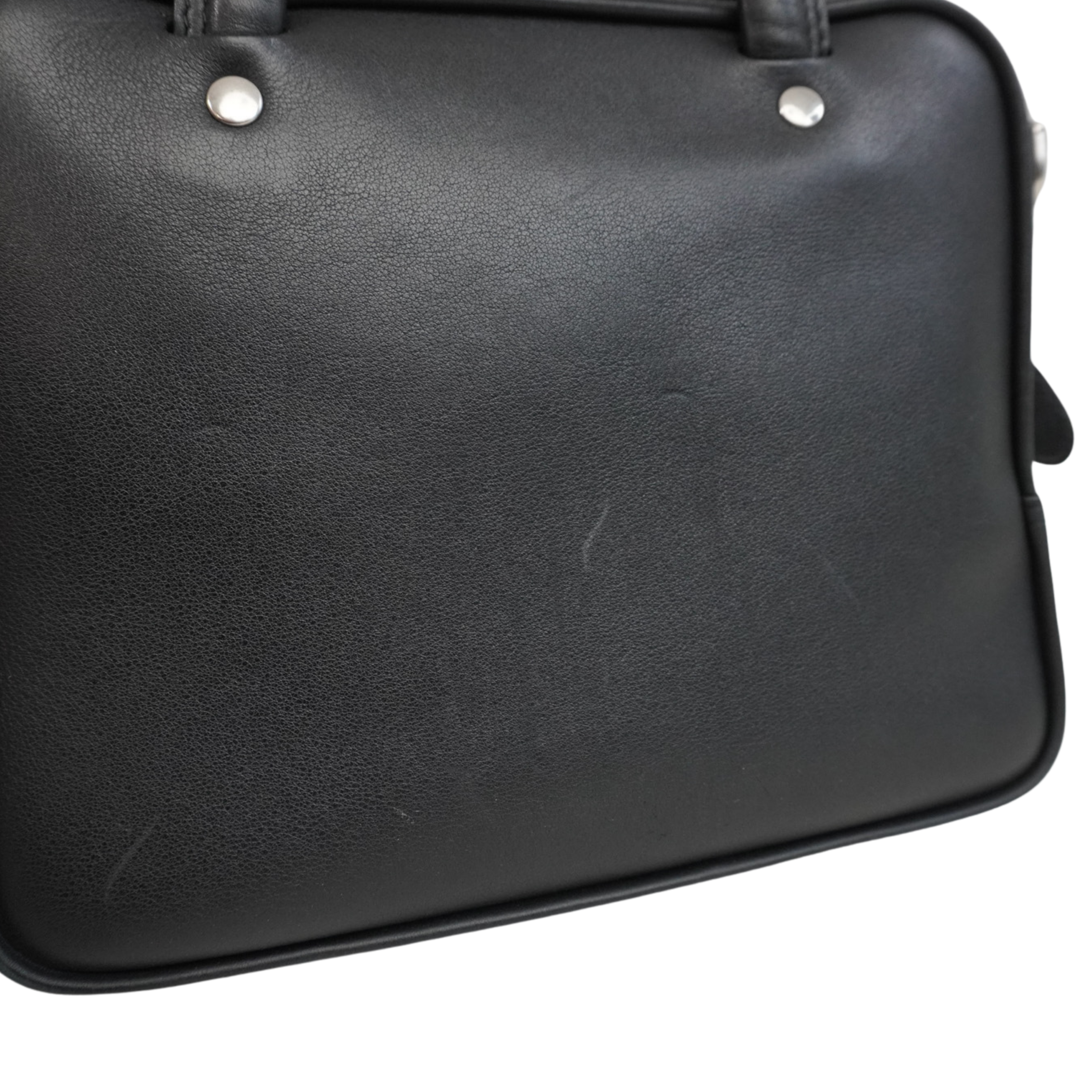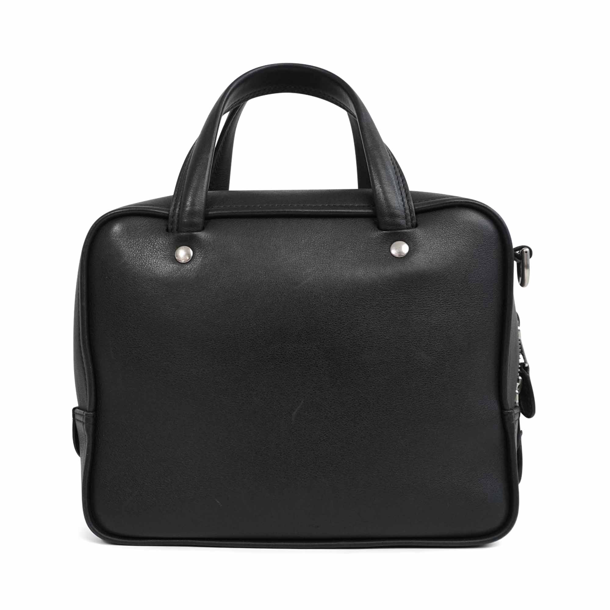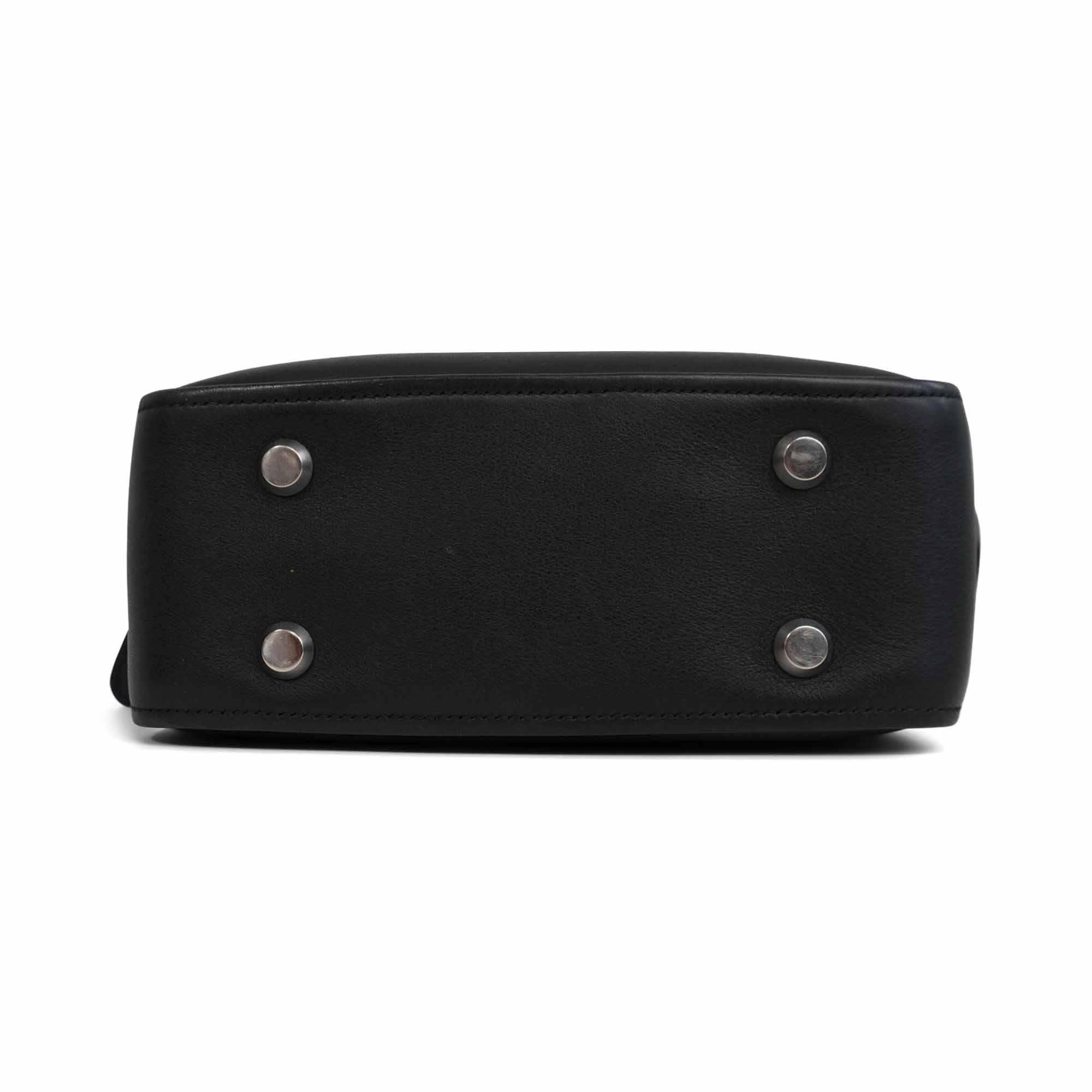 Balenciaga 'Triangle Square XS' handbag in black smooth leather with a white logo monogram across the front, dual top handles, and a removable crossbody strap. The bag has a top zip opening in silver hardware revealing a red leather lined interior with slip pockets.