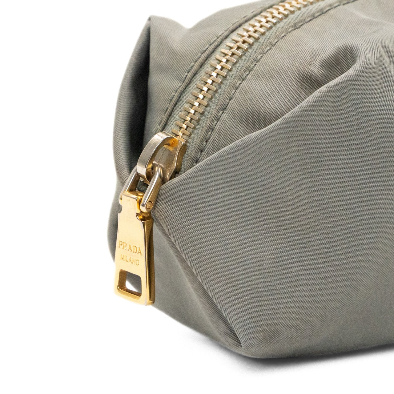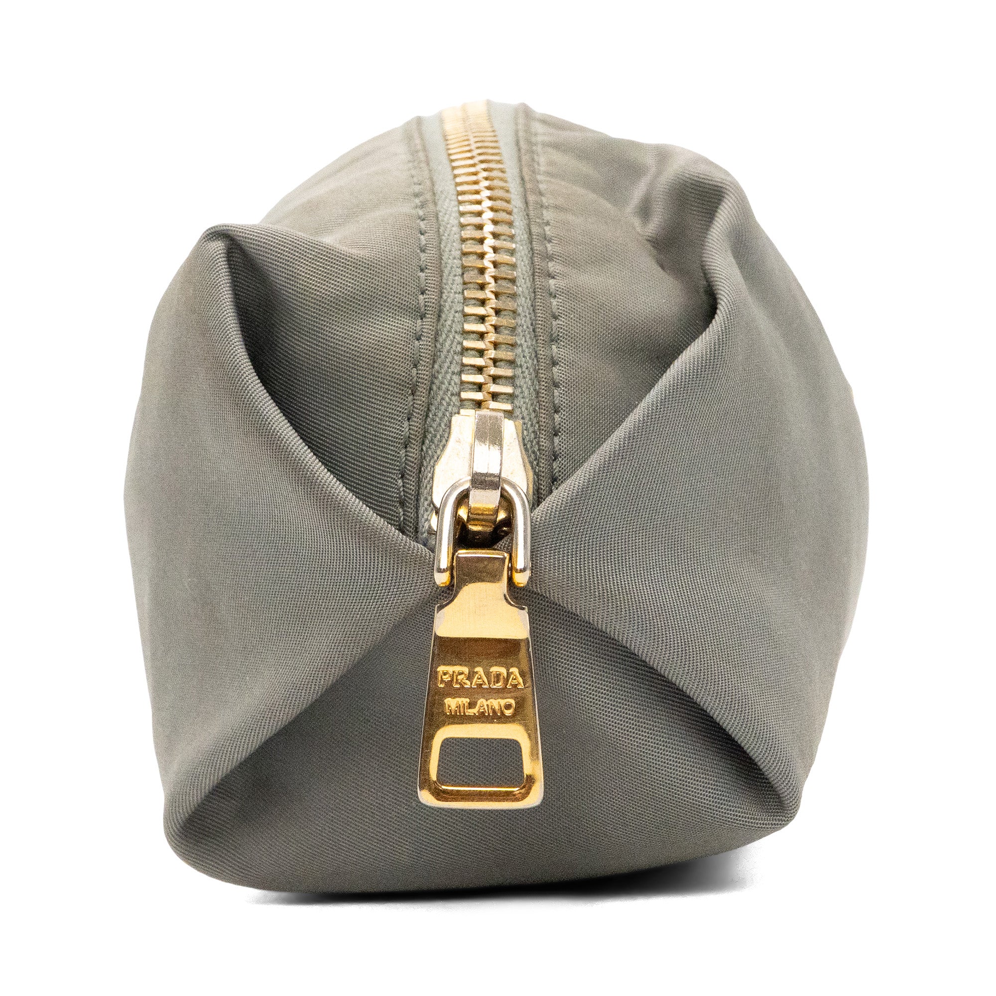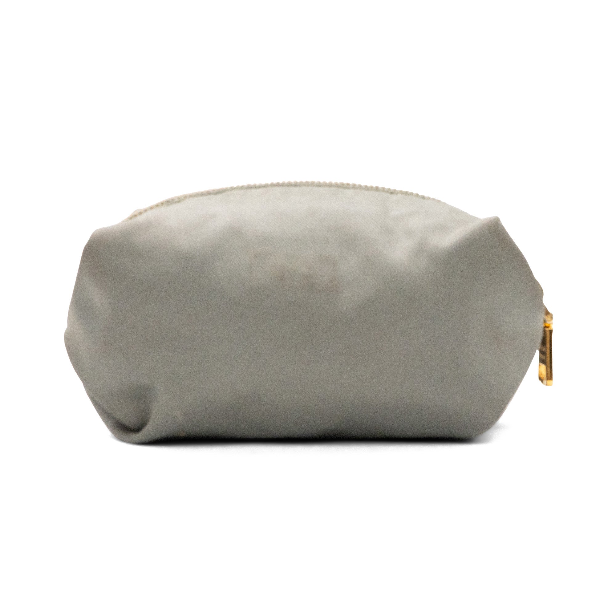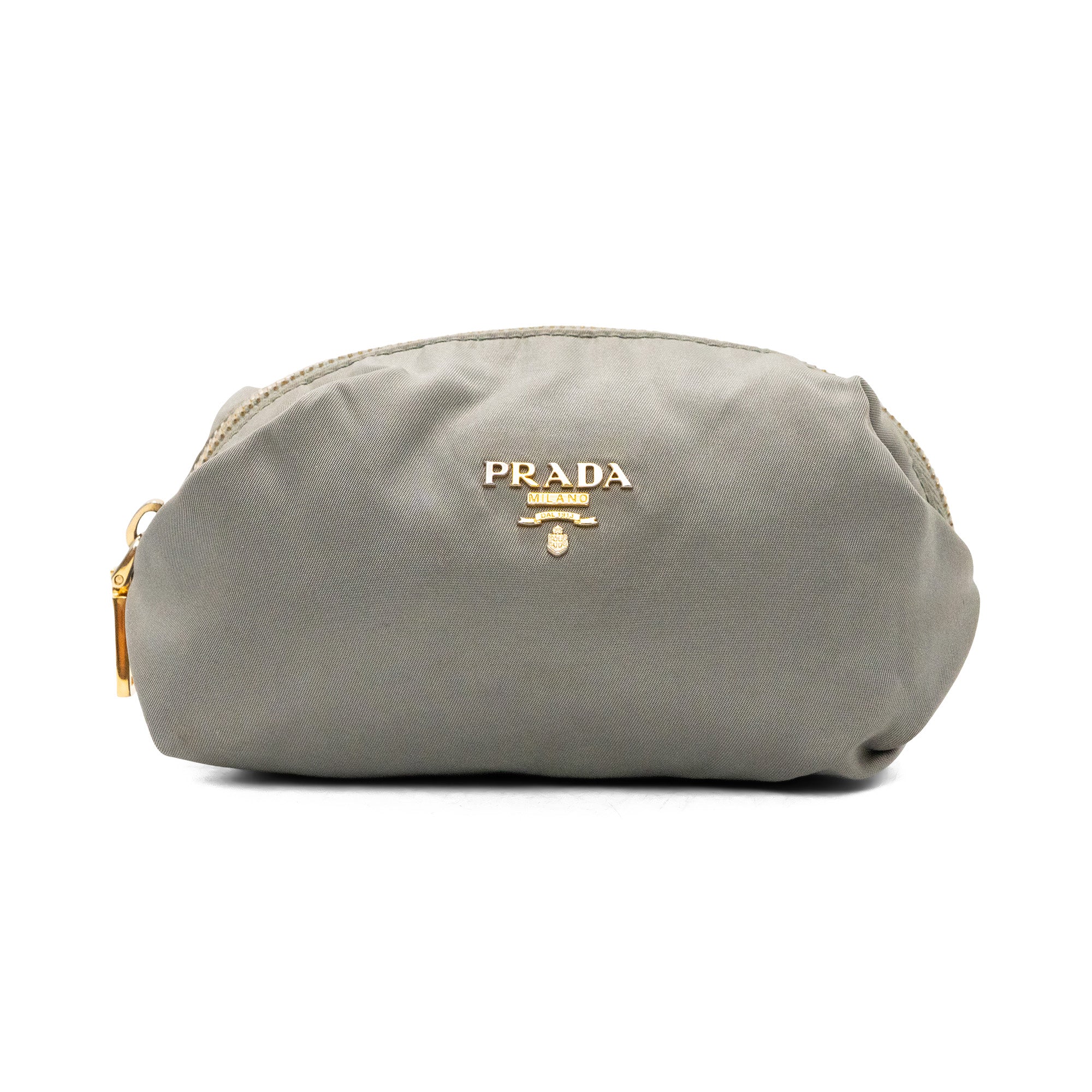 Prada nylon small pouch in grey nylon with signature logo on the front in gold hardware and top zip in gold hardware with grey monogram lining.
