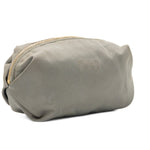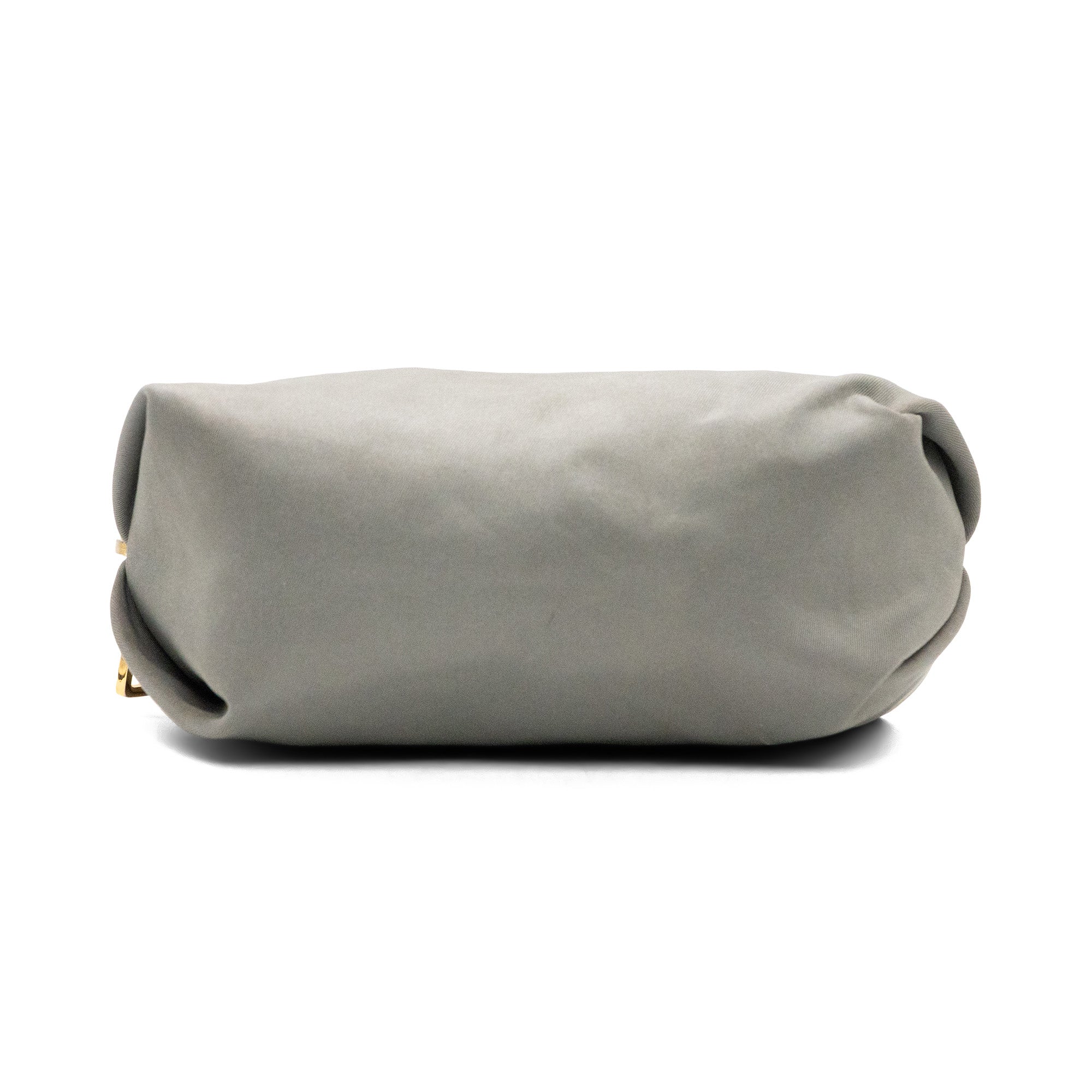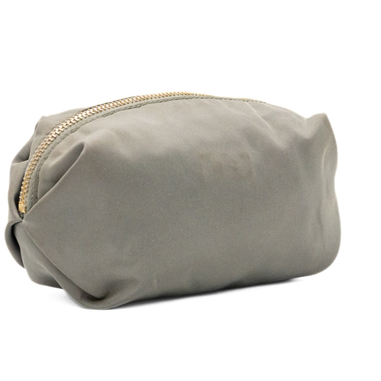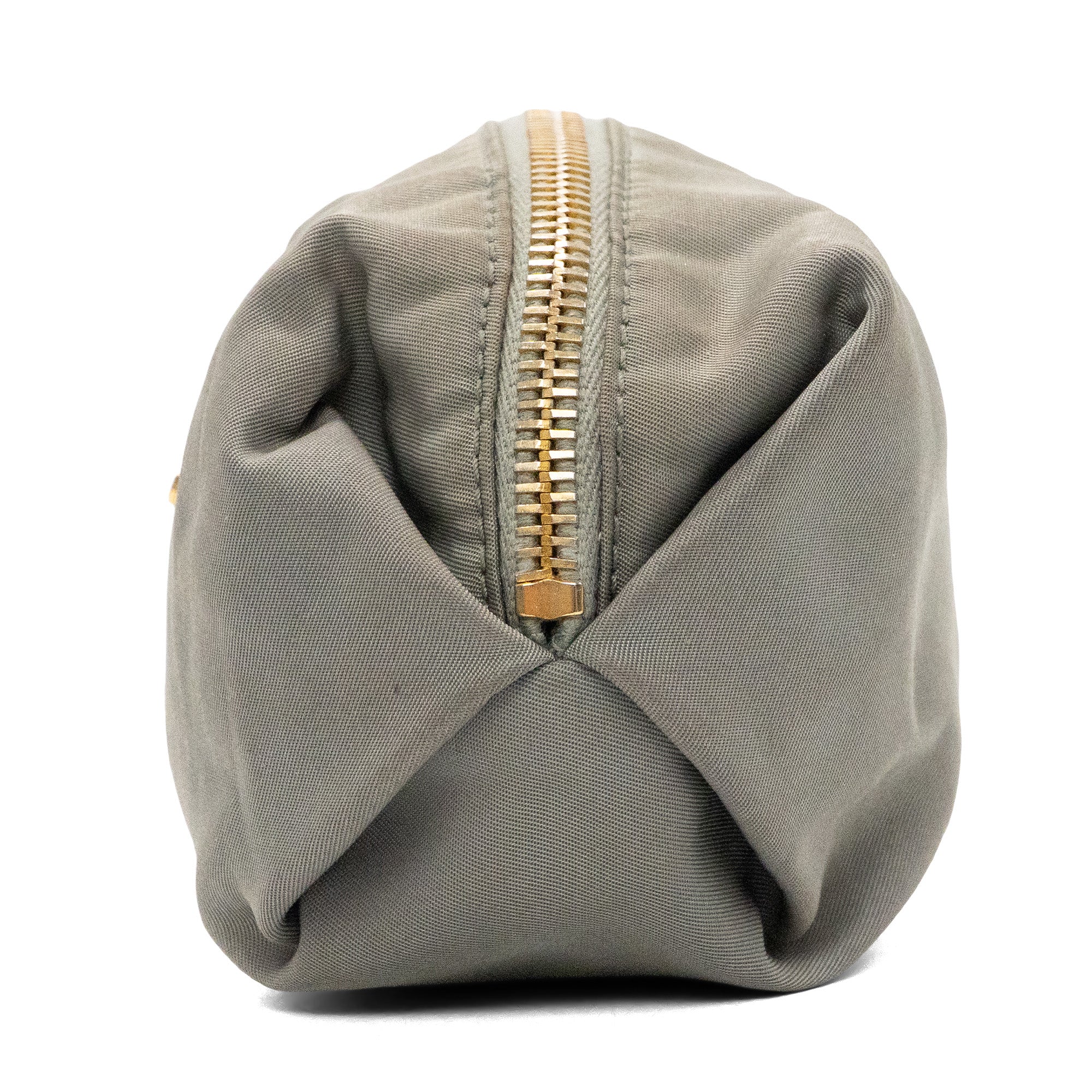 Prada nylon small pouch in grey nylon with signature logo on the front in gold hardware and top zip in gold hardware with grey monogram lining.