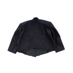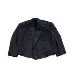 Balenciaga oversized tuxedo-style blazer jacket in a black wool-mohair blend with a satin peak lapel collar, a double-breasted front button closure with covered buttons, and a cropped and frayed hem.