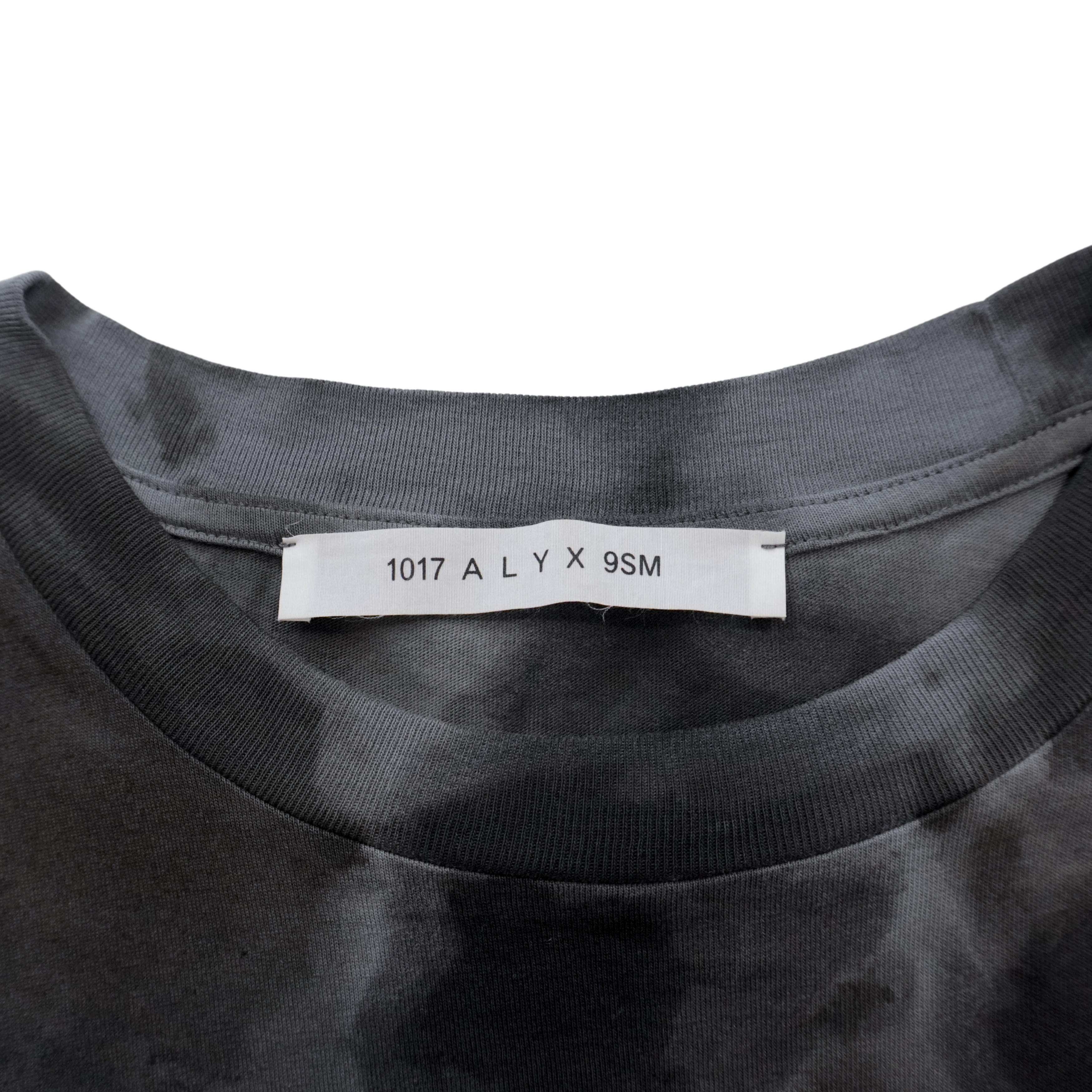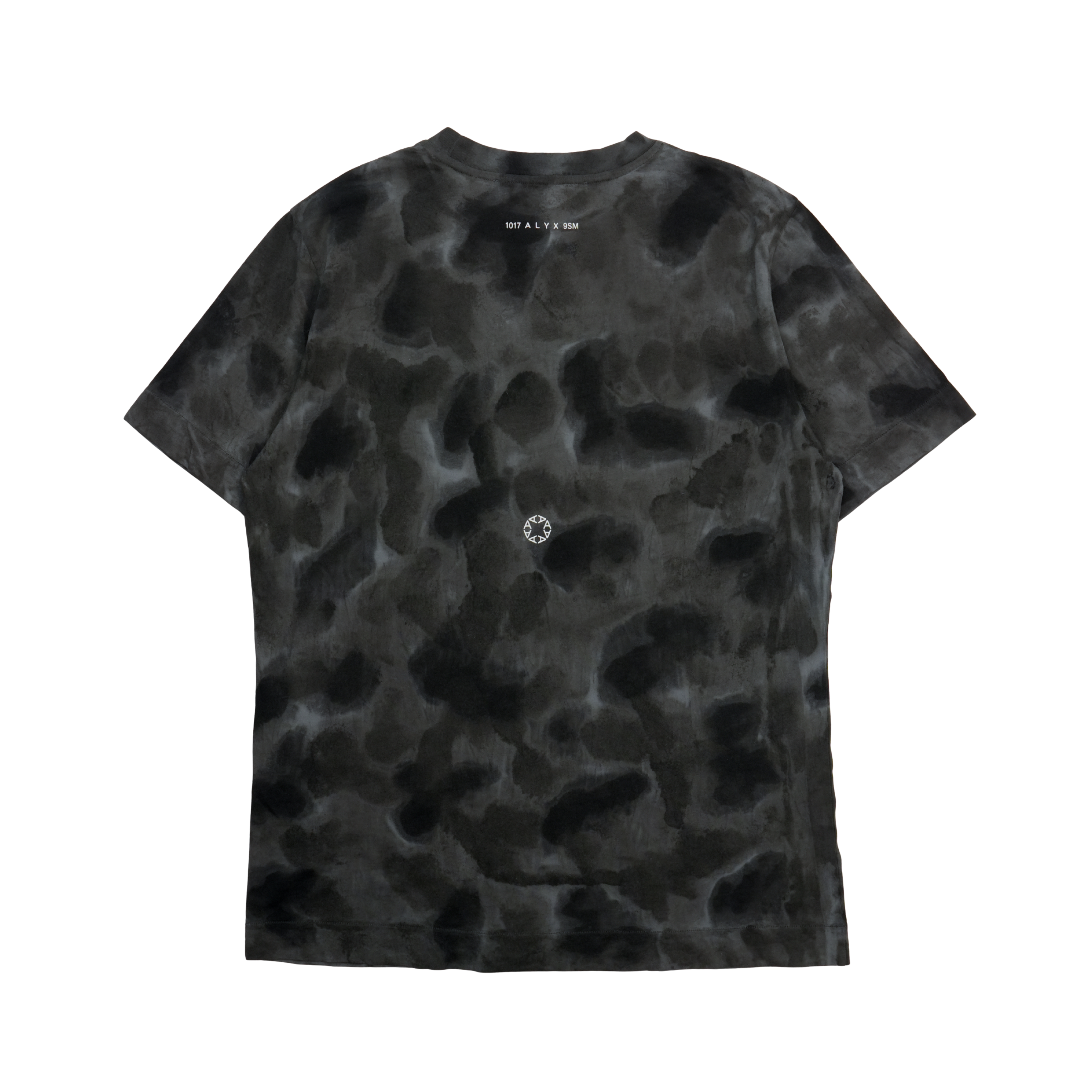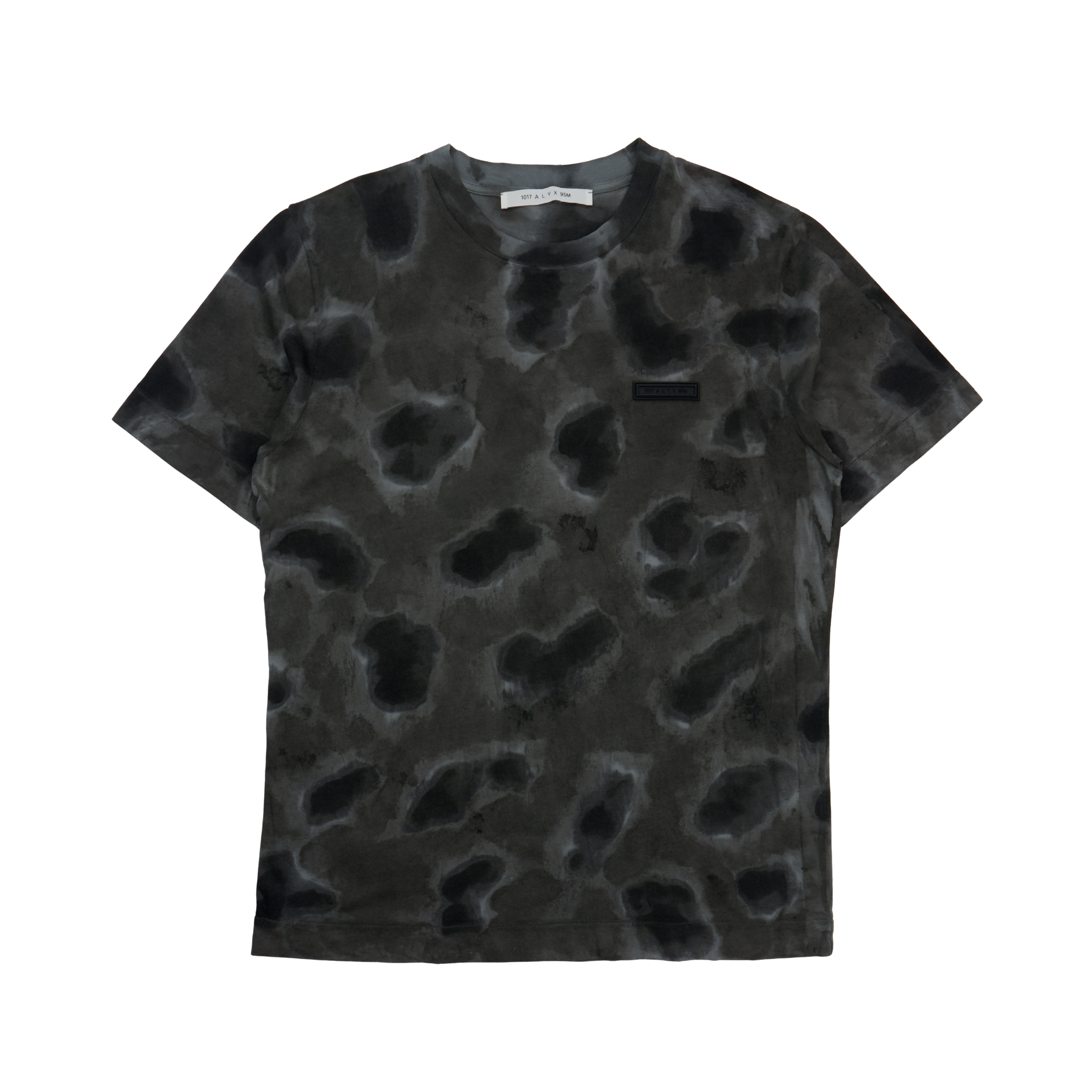 1017 ALYX 9SM grey and black tie dye t-shirt with black rubberized logo patch.