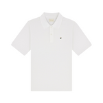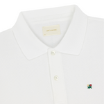 Aime Leon Dore 'Crest Piqué' polo shirt in white cotton with a small floral crest embroidery on the chest, iridescent buttons, and a collar.