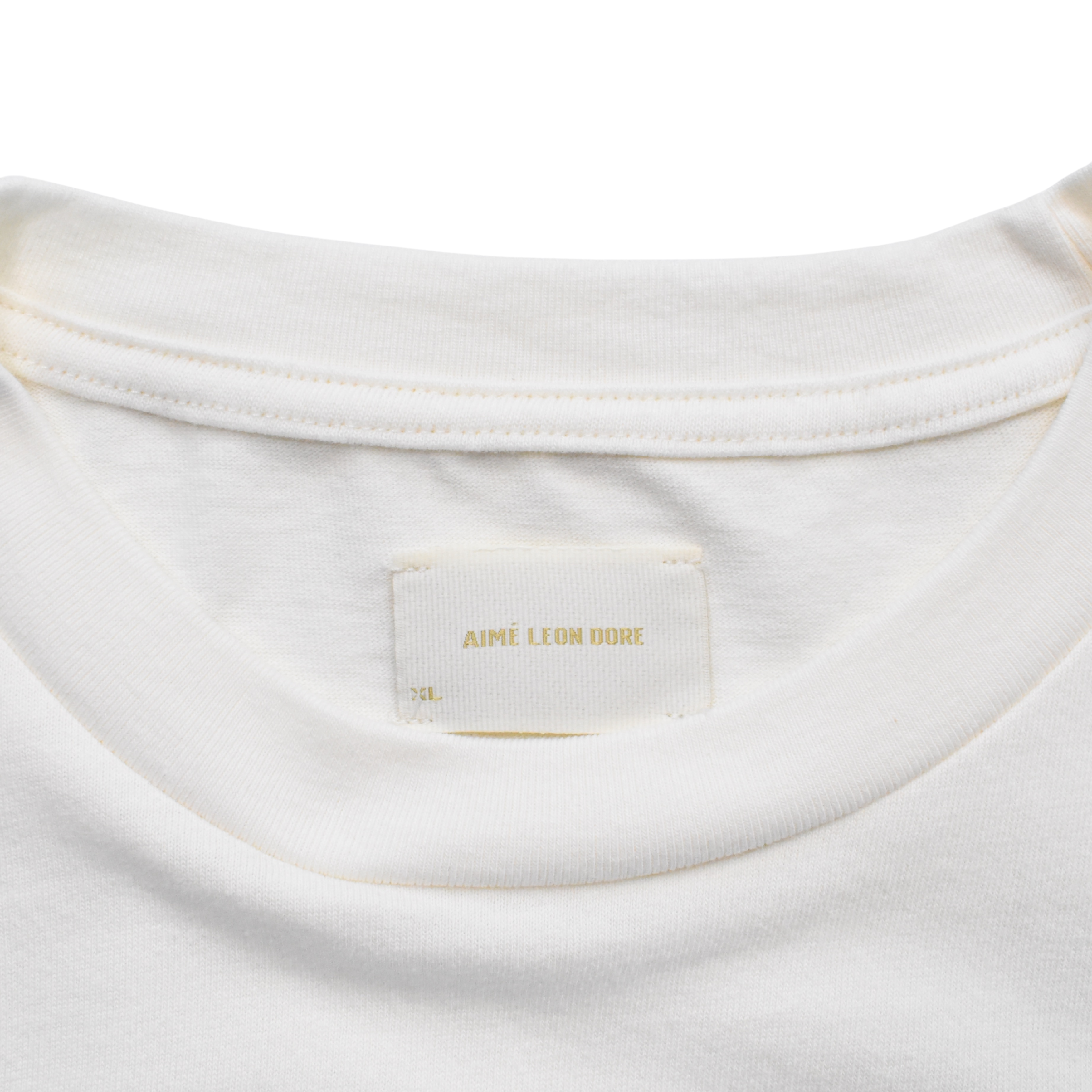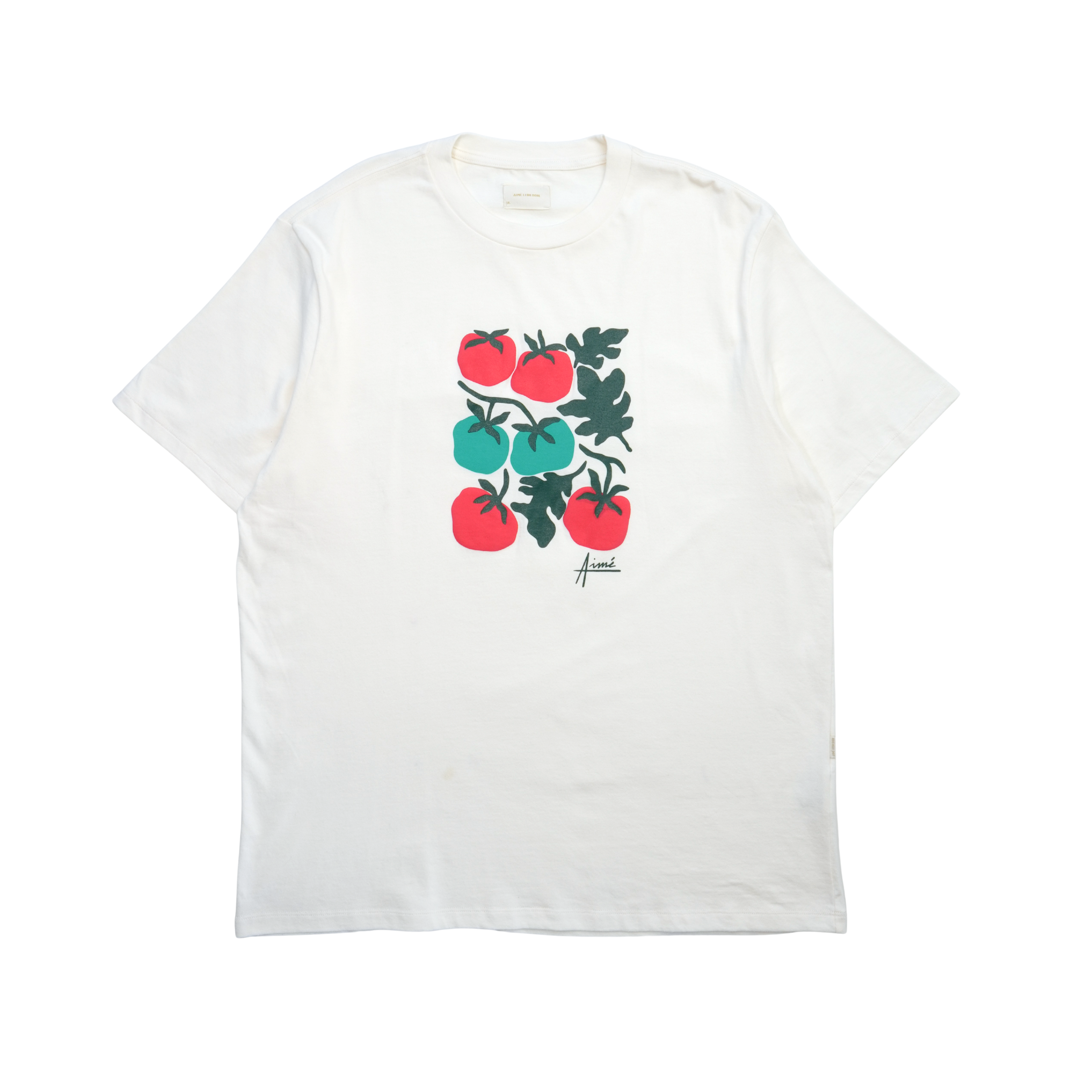 Aime Leon Dore 'Tomato' t-shirt in cream cotton with a red and green tomato graphic on the chest.