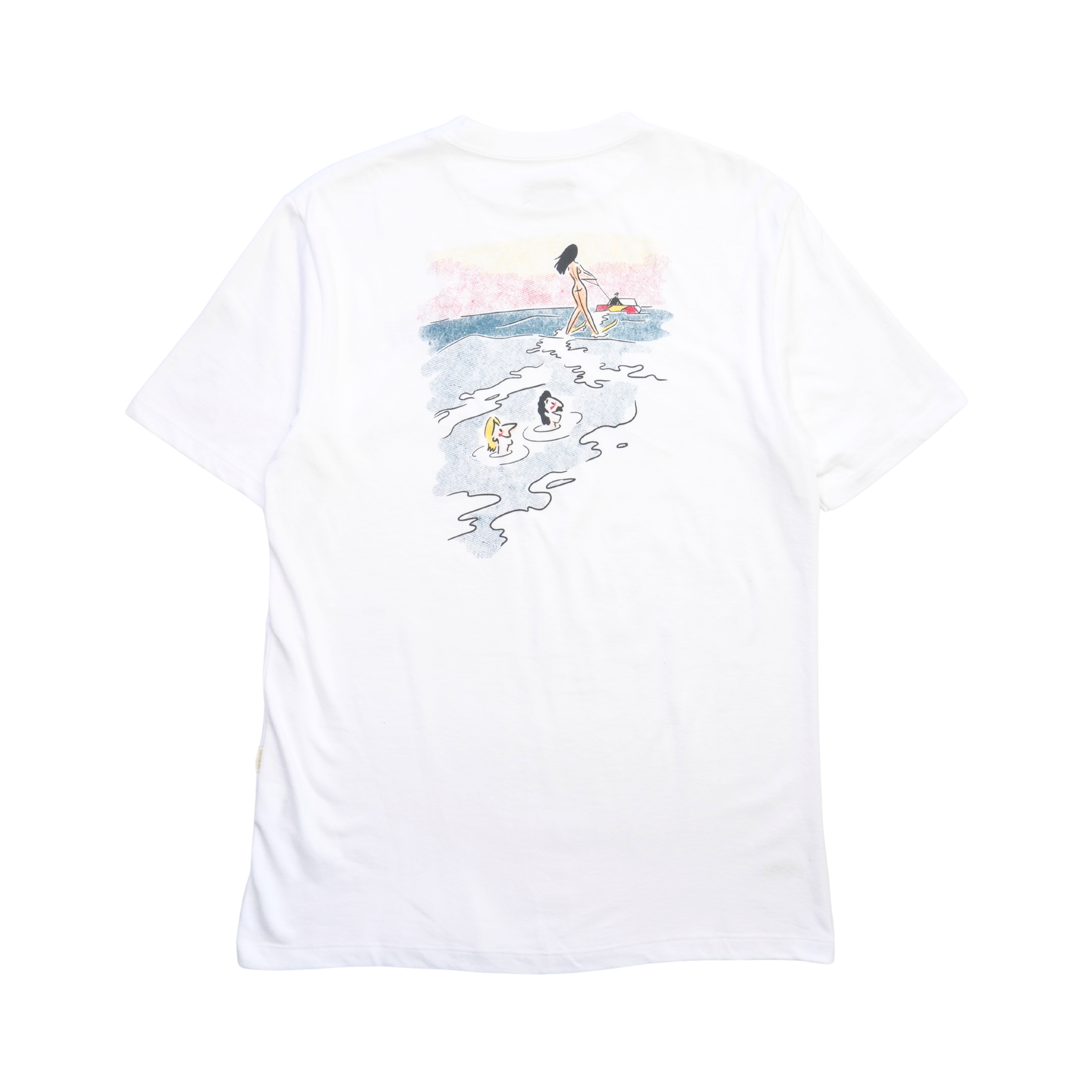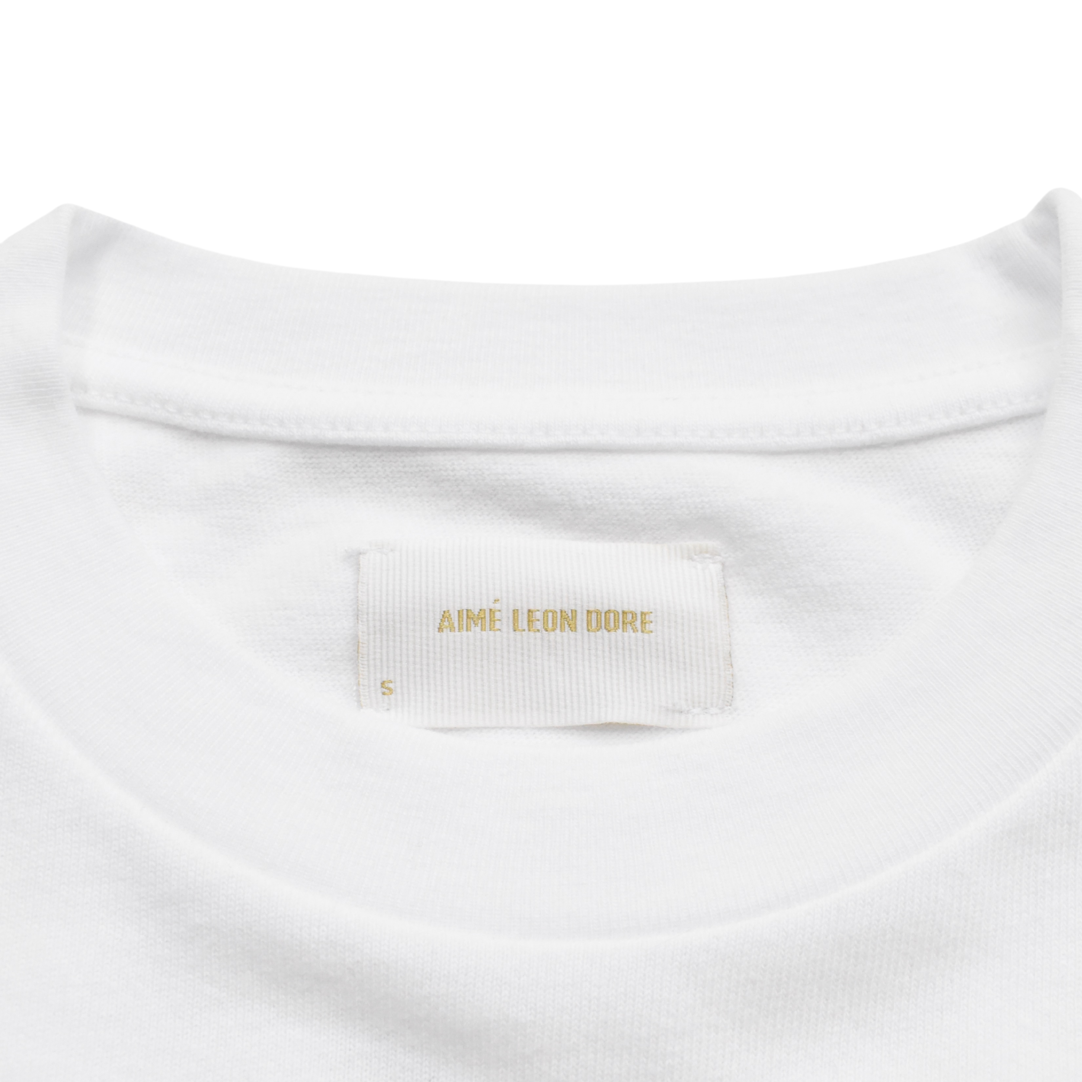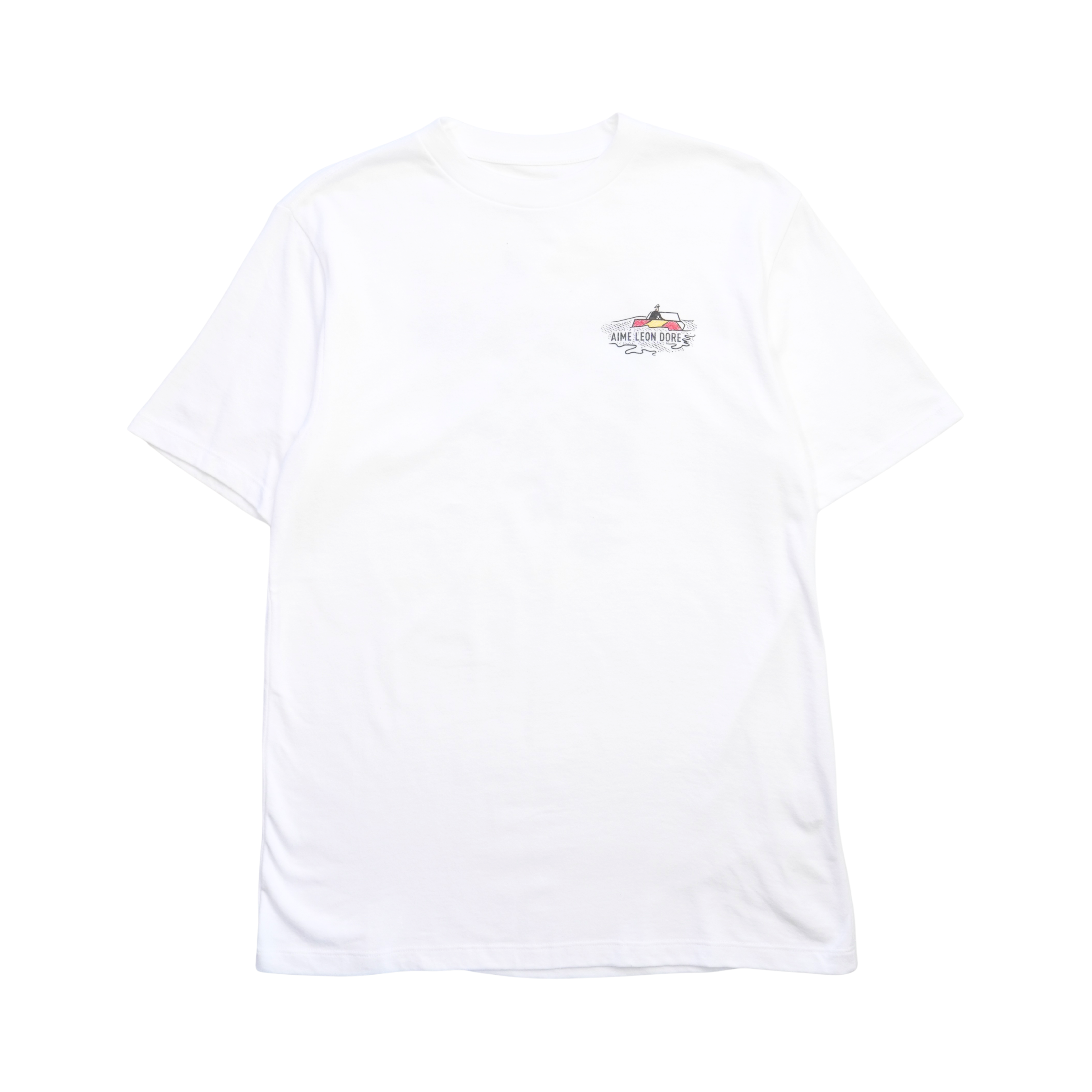 Aime Leon Dore 'Water Ski' t-shirt in white cotton with a small boat logo graphic on the chest and a larger multicolour water ski sketch graphic on the back.
