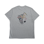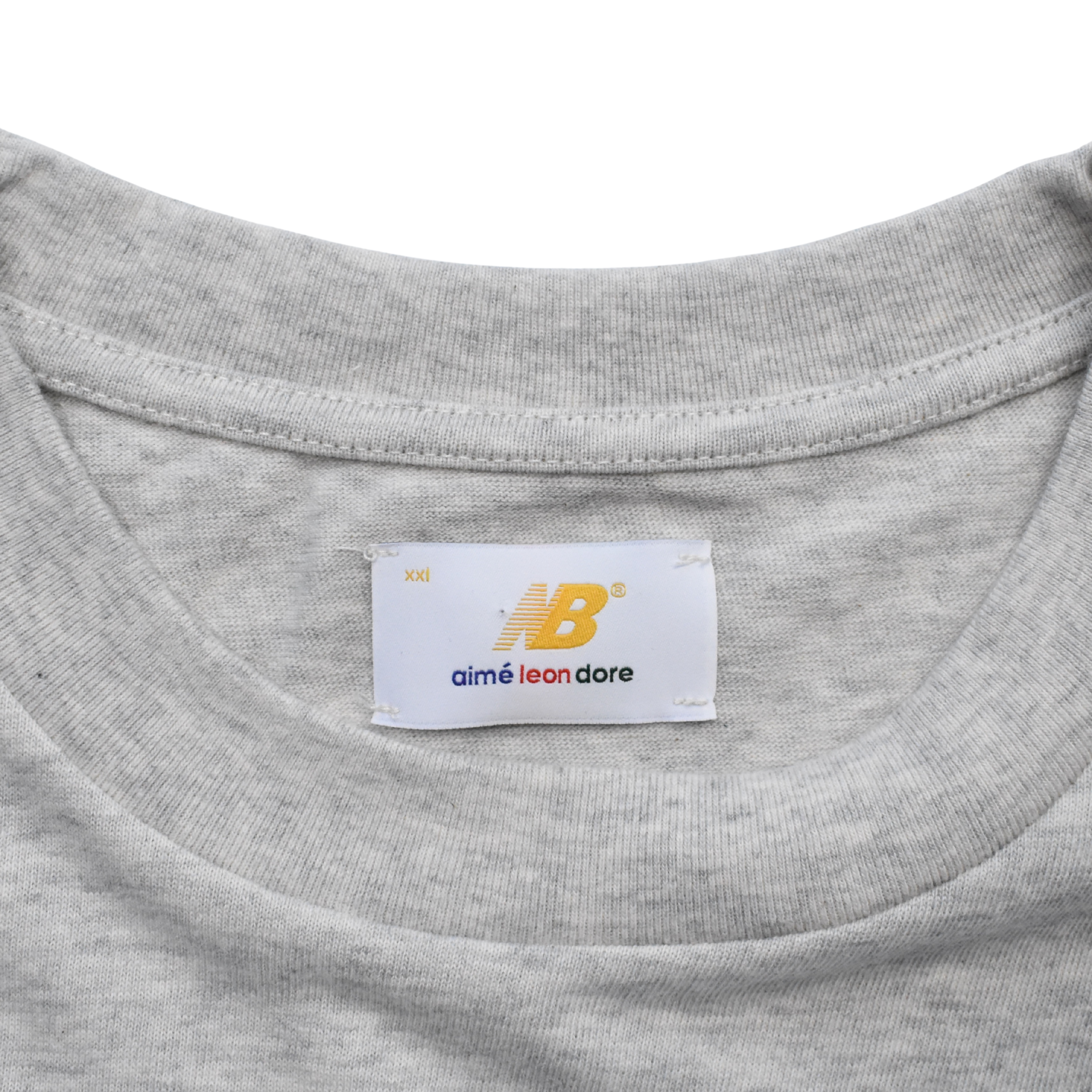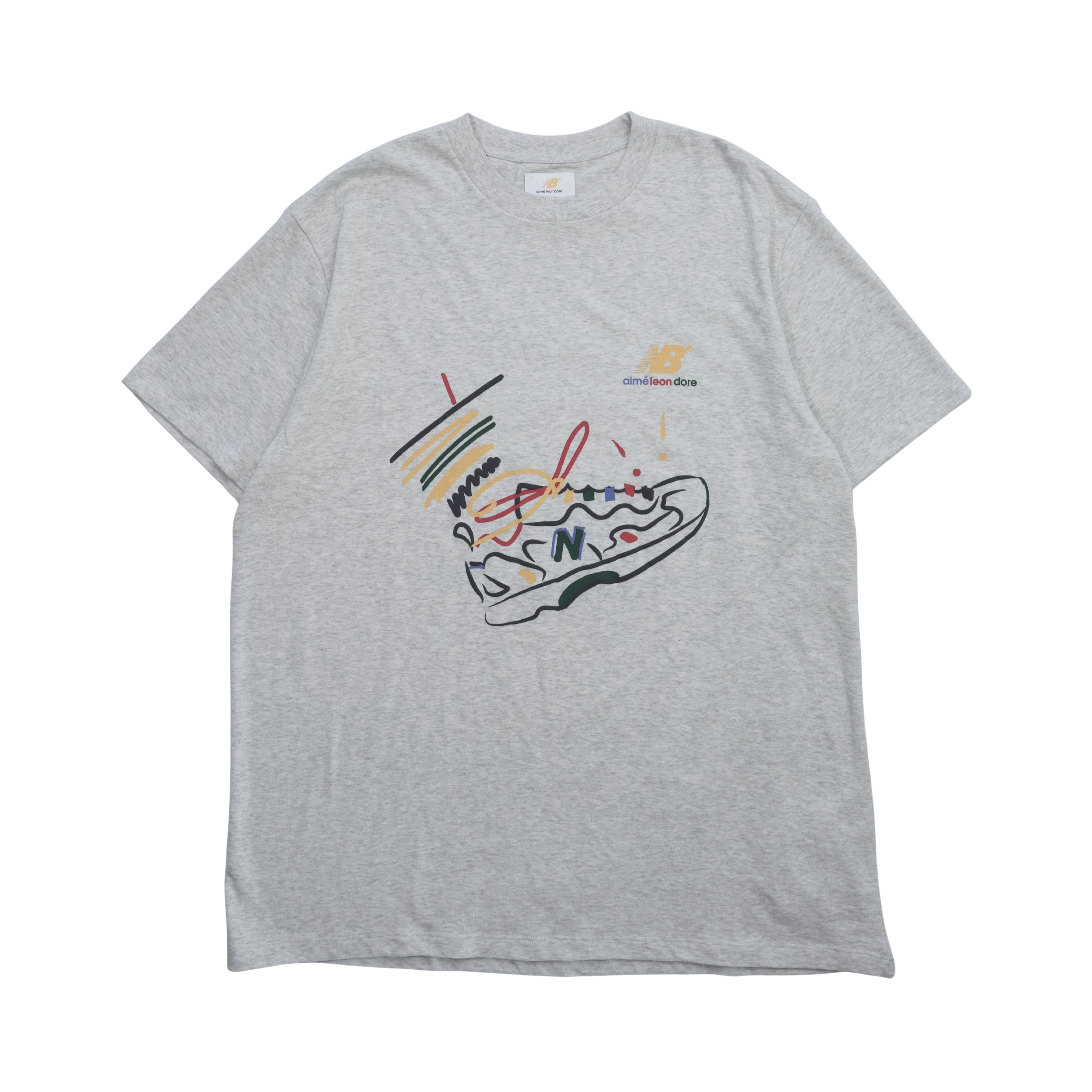 Aime Leon Dore x New Balance t-shirt in heather grey cotton with a multicolour painted shoe and logo graphic on the chest.