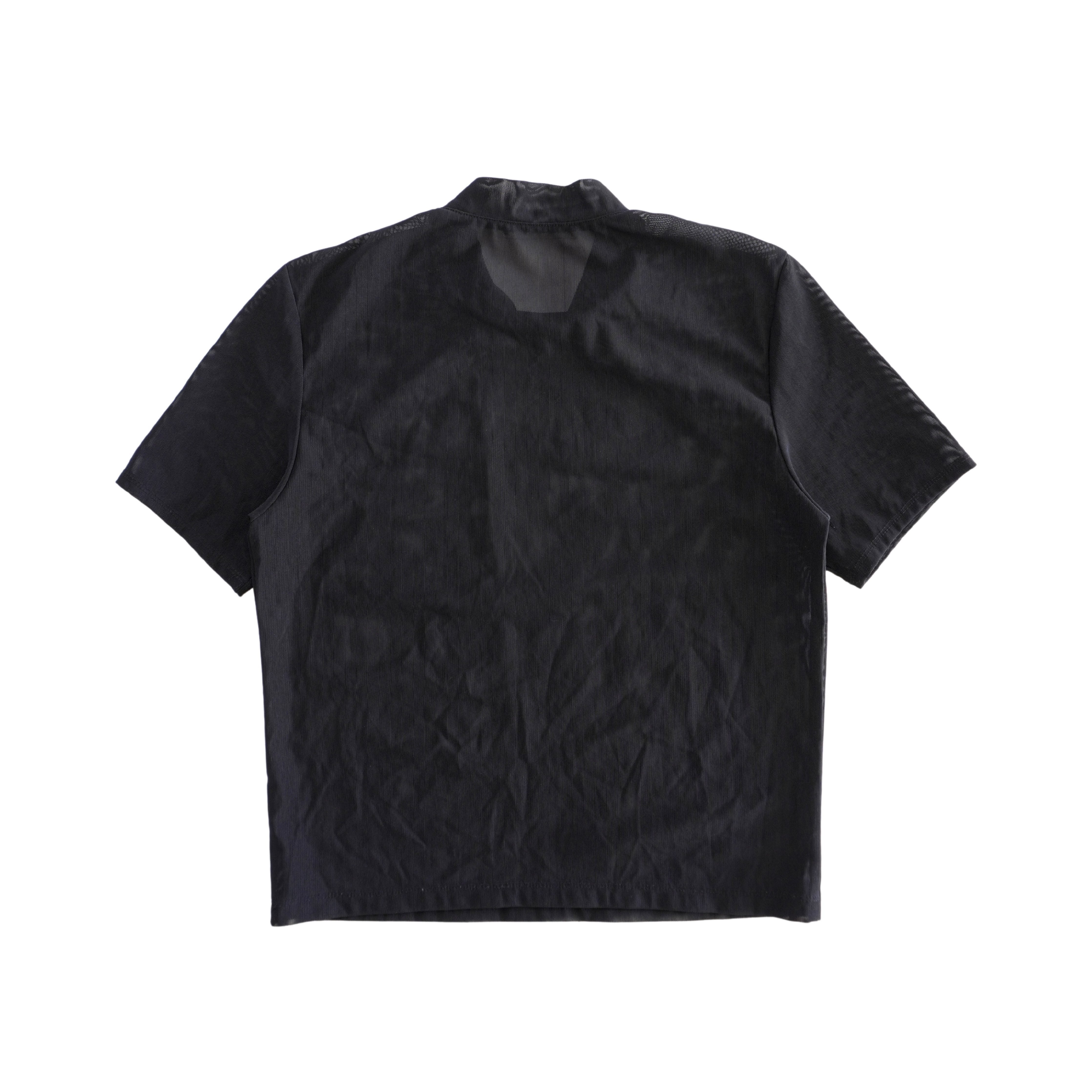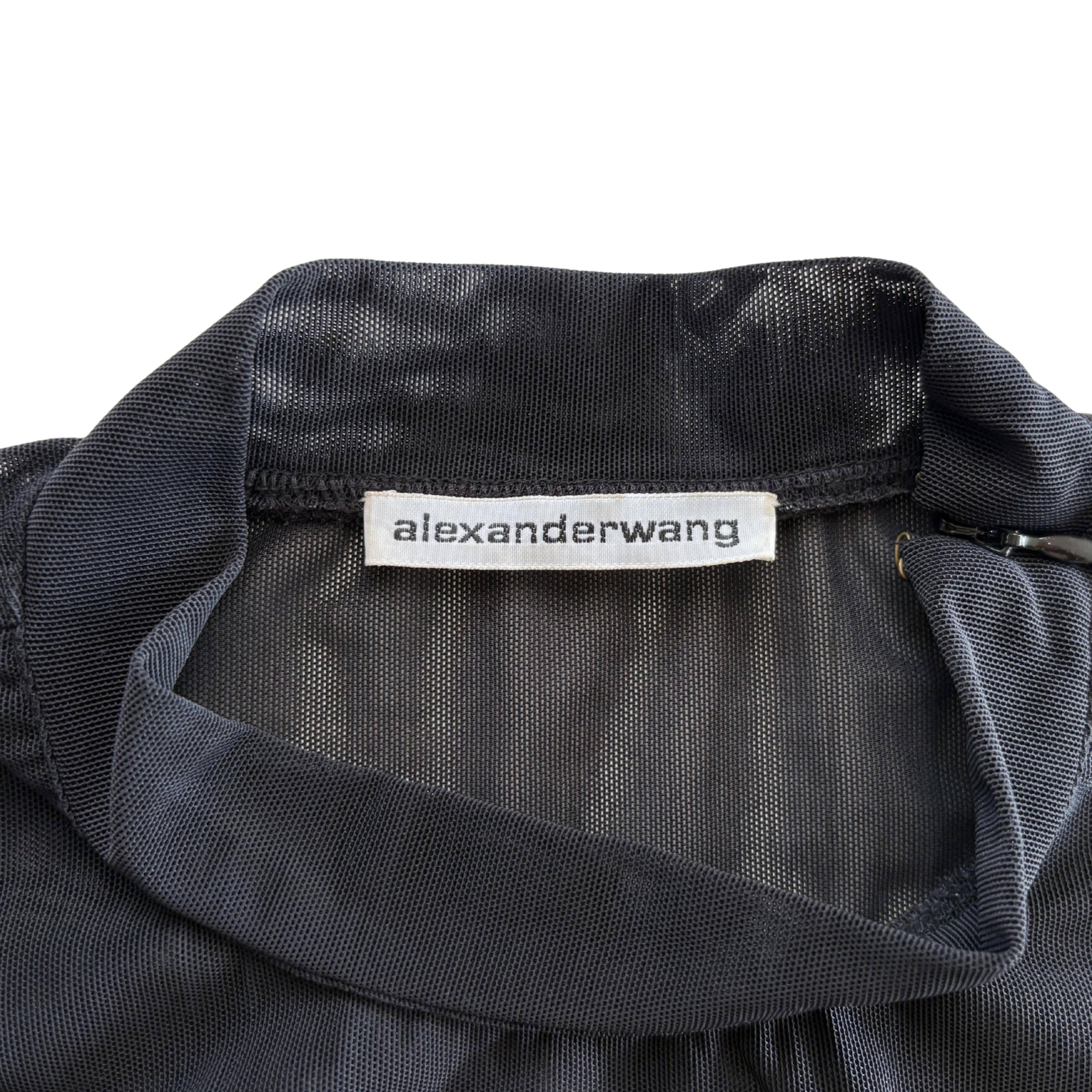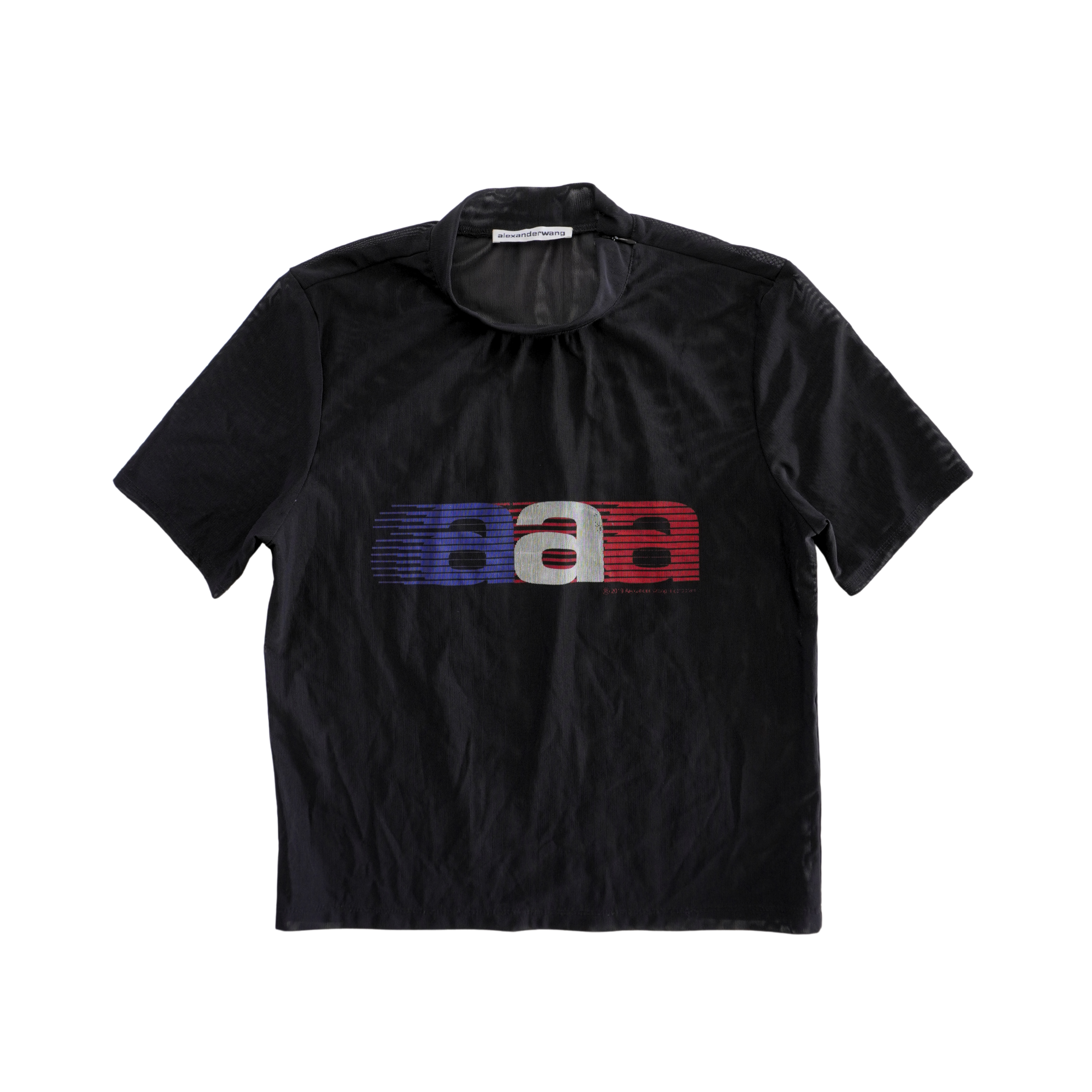 Alexander Wang black mesh t-shirt with a blue, red, and white logo graphic on the chest, a mock neckline, and a zip opening at the shoulder.