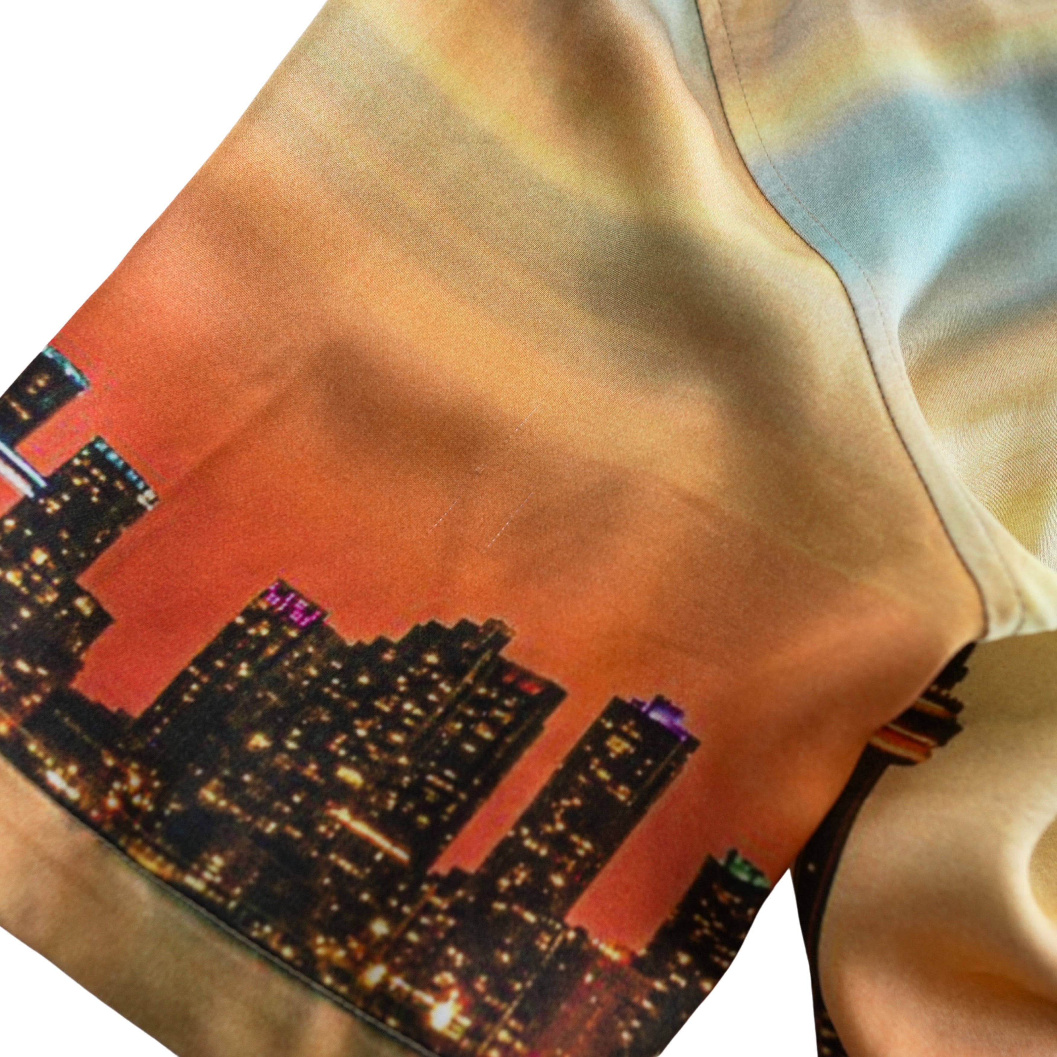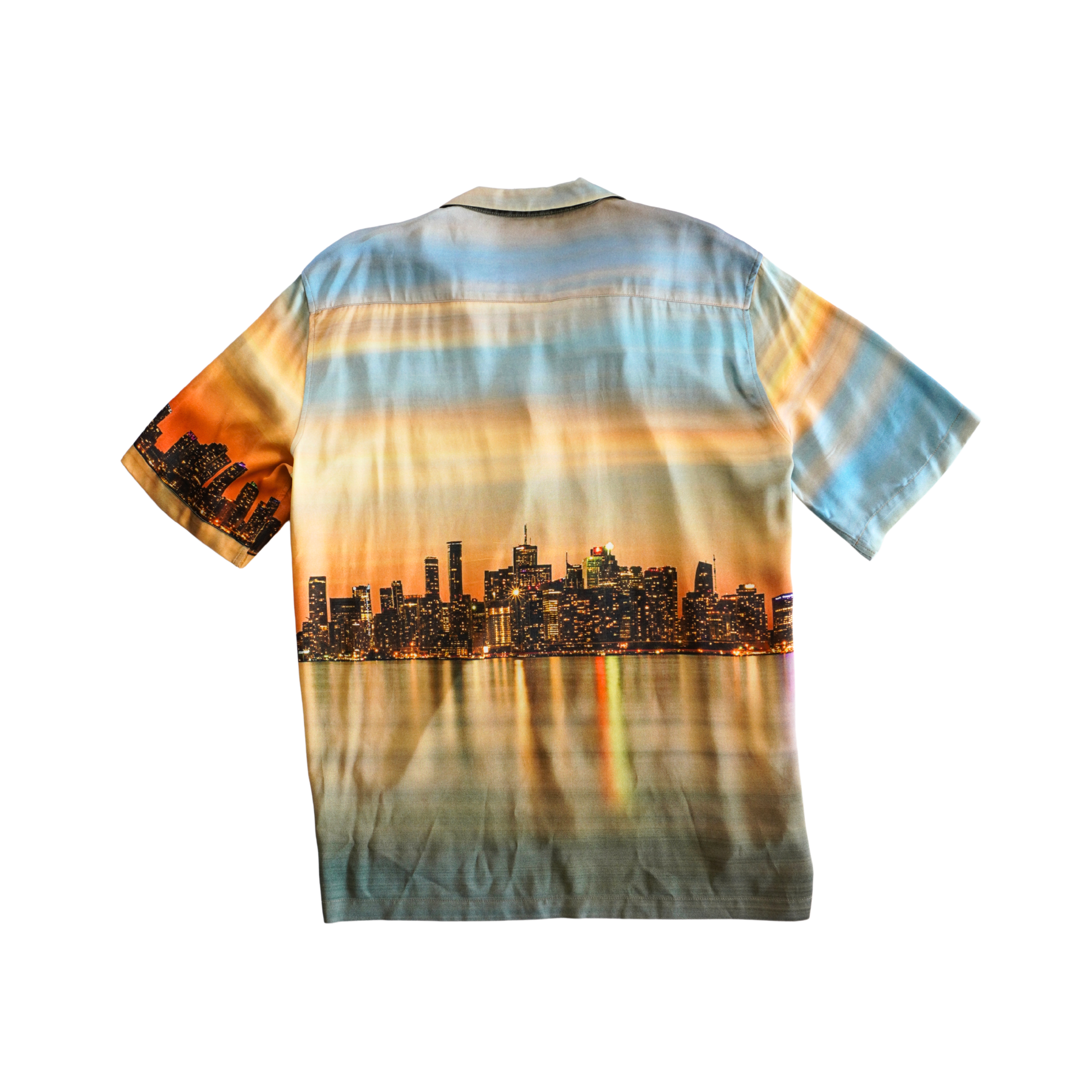 Blue Sky Inn 'Toronto' CNTRBND exclusive short-sleeve button-down shirt with Toronto skyline print in blue yellow and black.