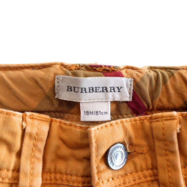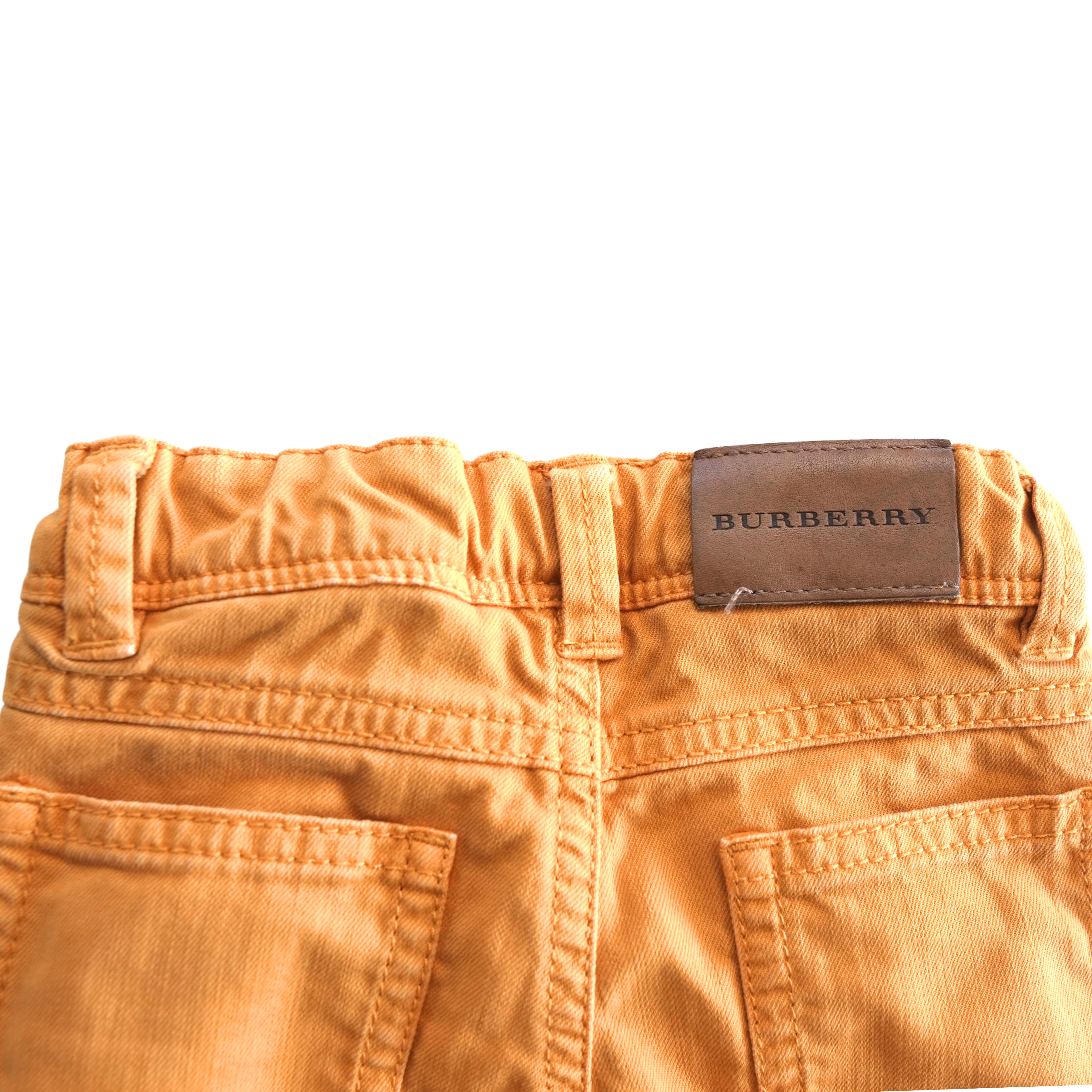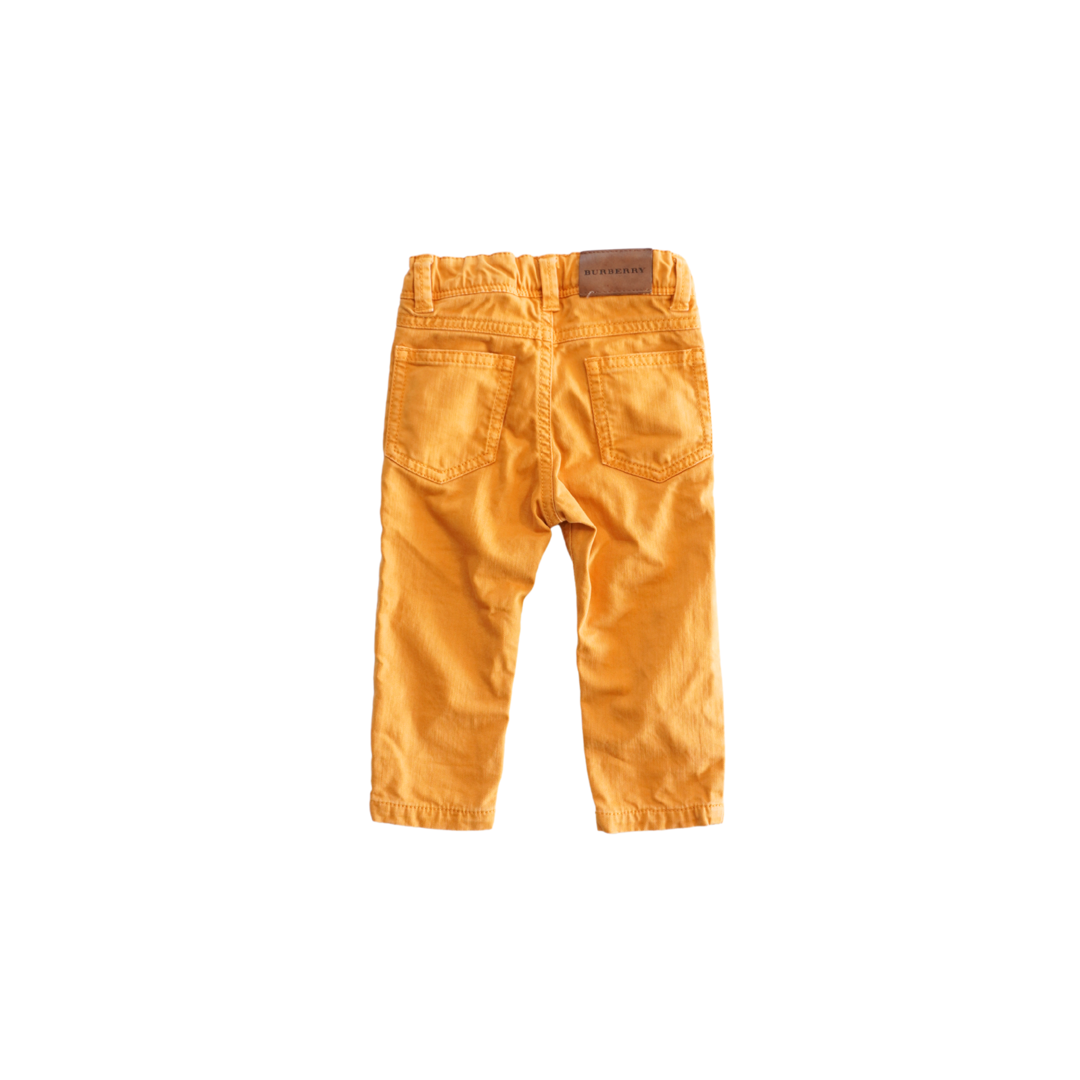 Burberry slim fit mustard yellow pants with brown logo patch and elasticized waistband.