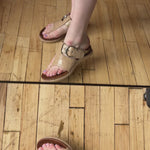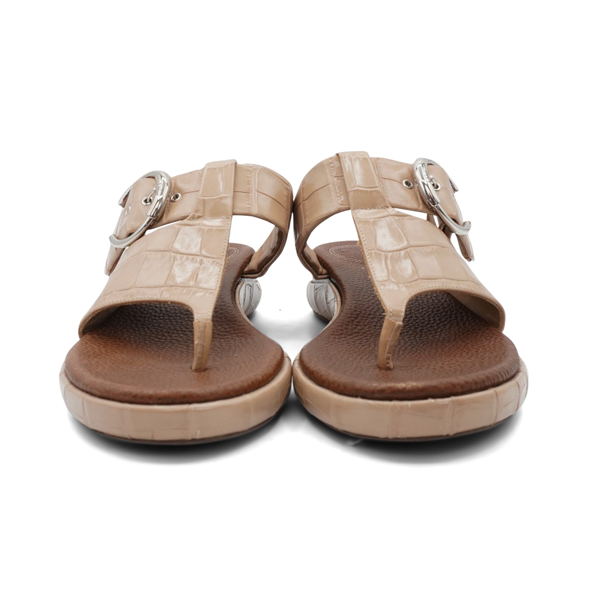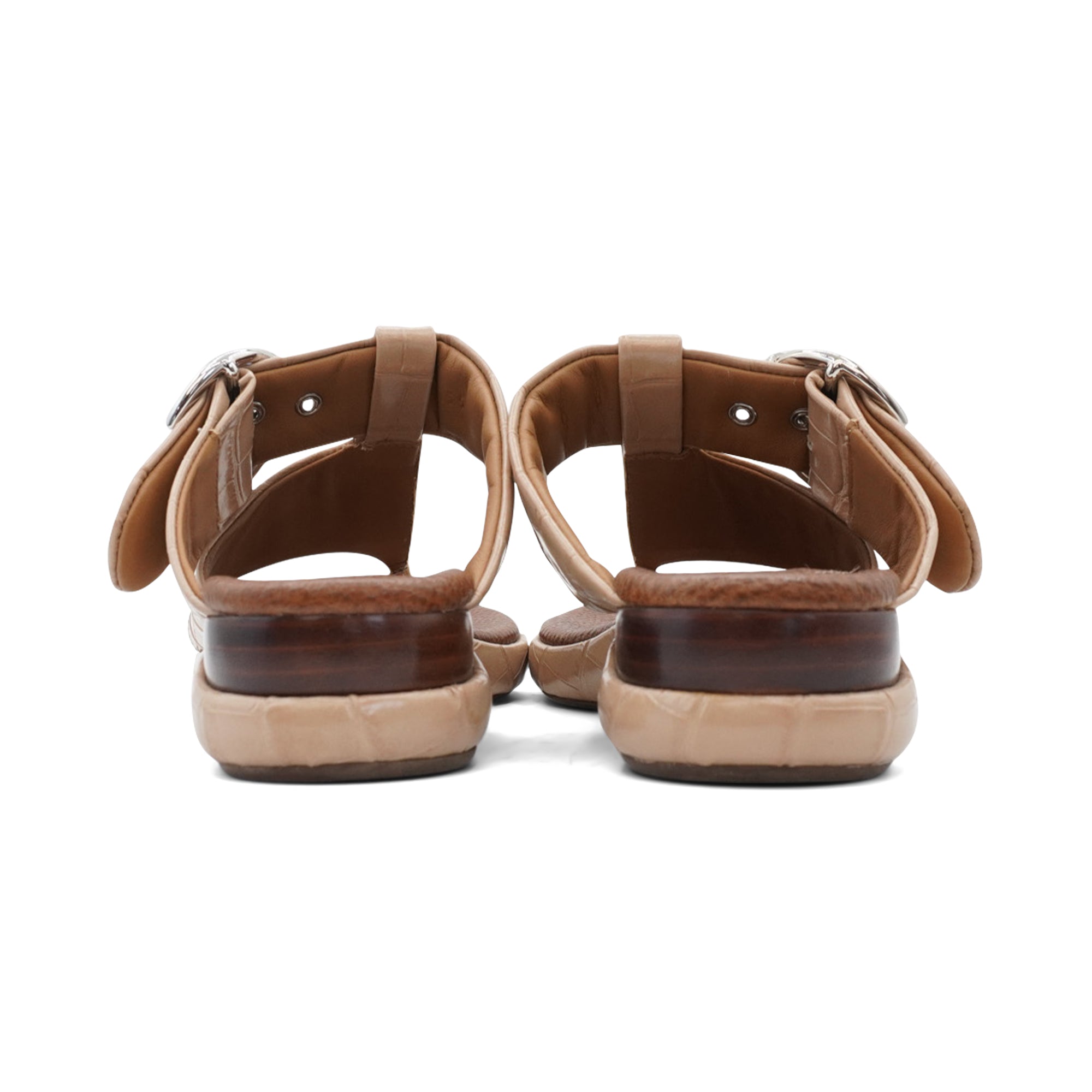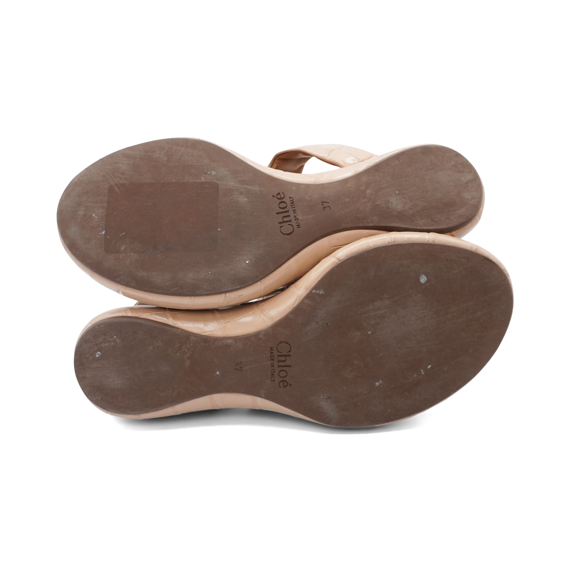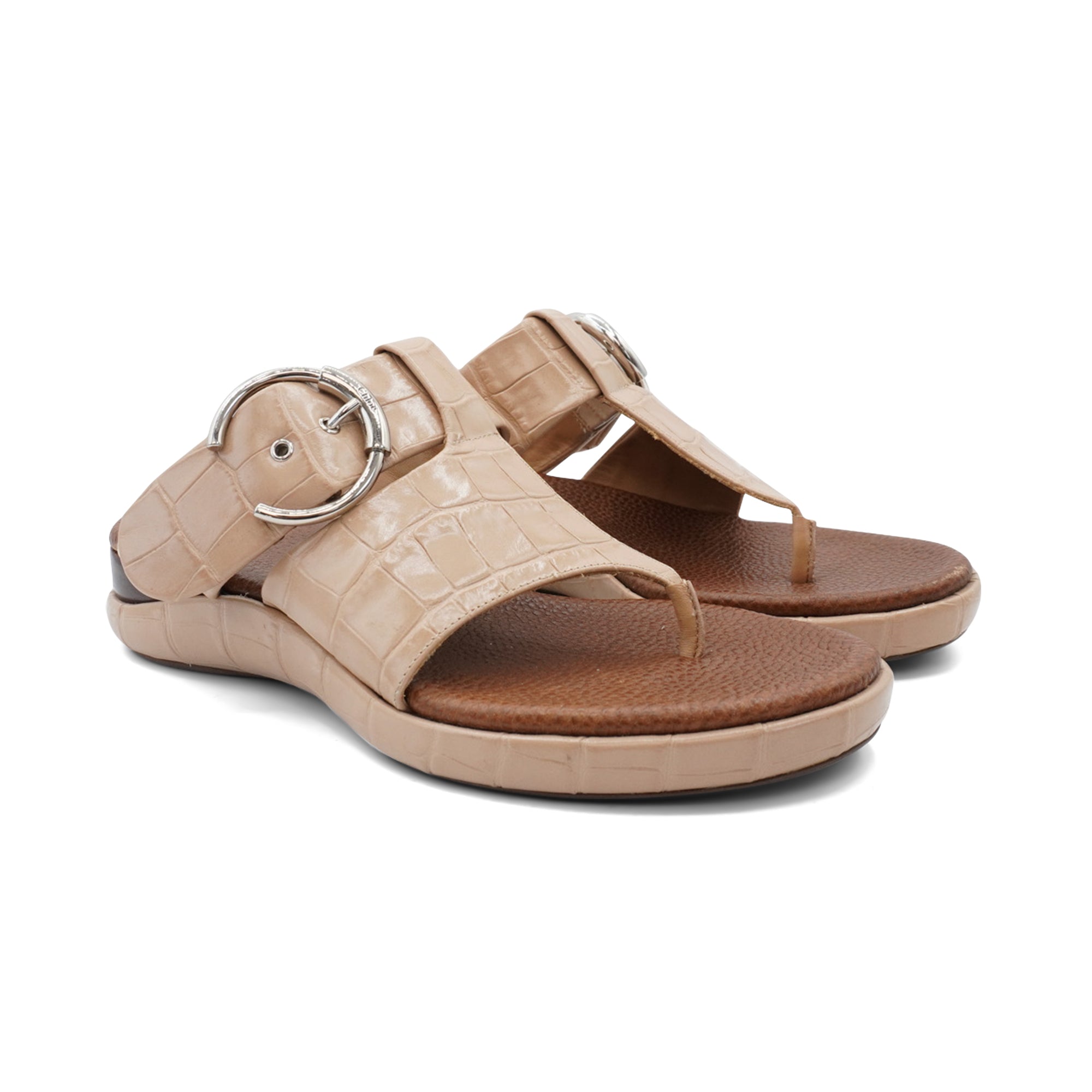 Chloe flip flop sandal in beige and brown croc embossed leather with silver buckle detailing and slight wedge heel.