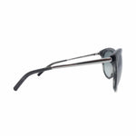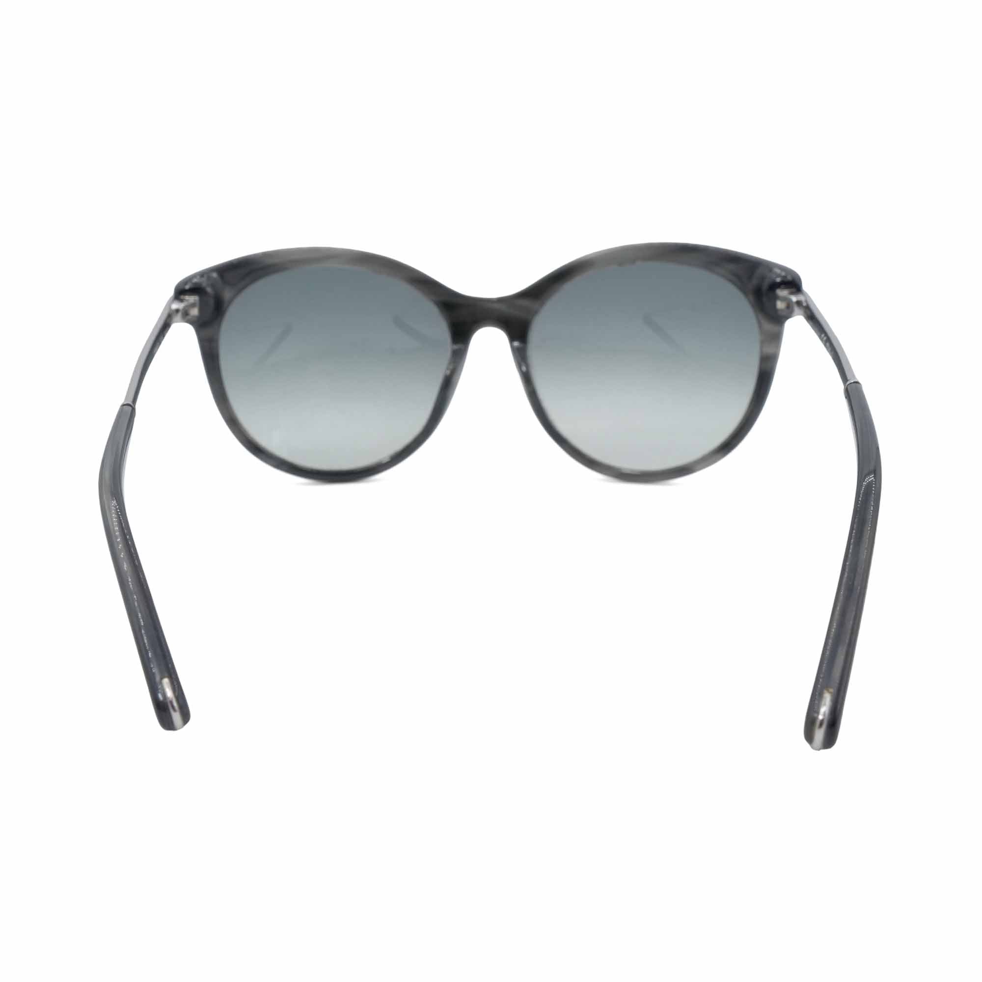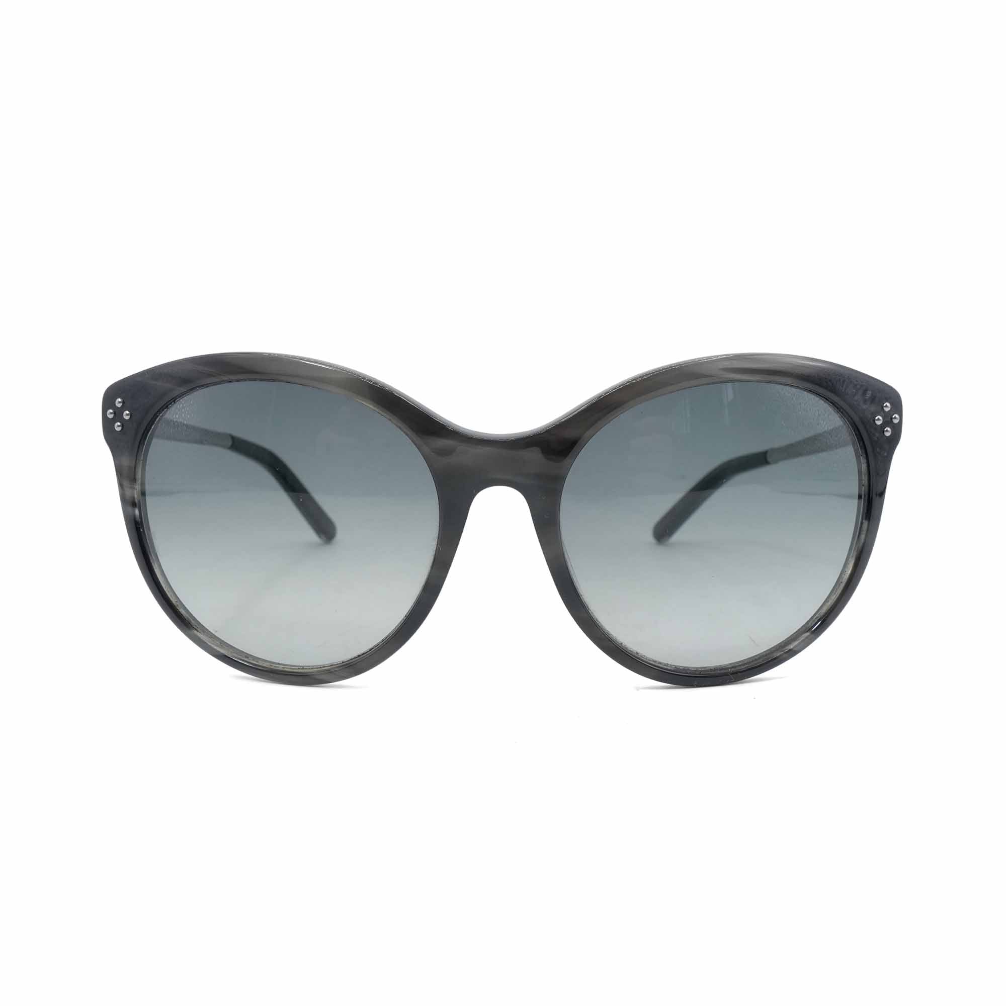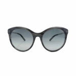 Chloe sunglasses in marbled black acetate with rounded blue lenses, silver metal arms, and small stud detailing at the temples.
