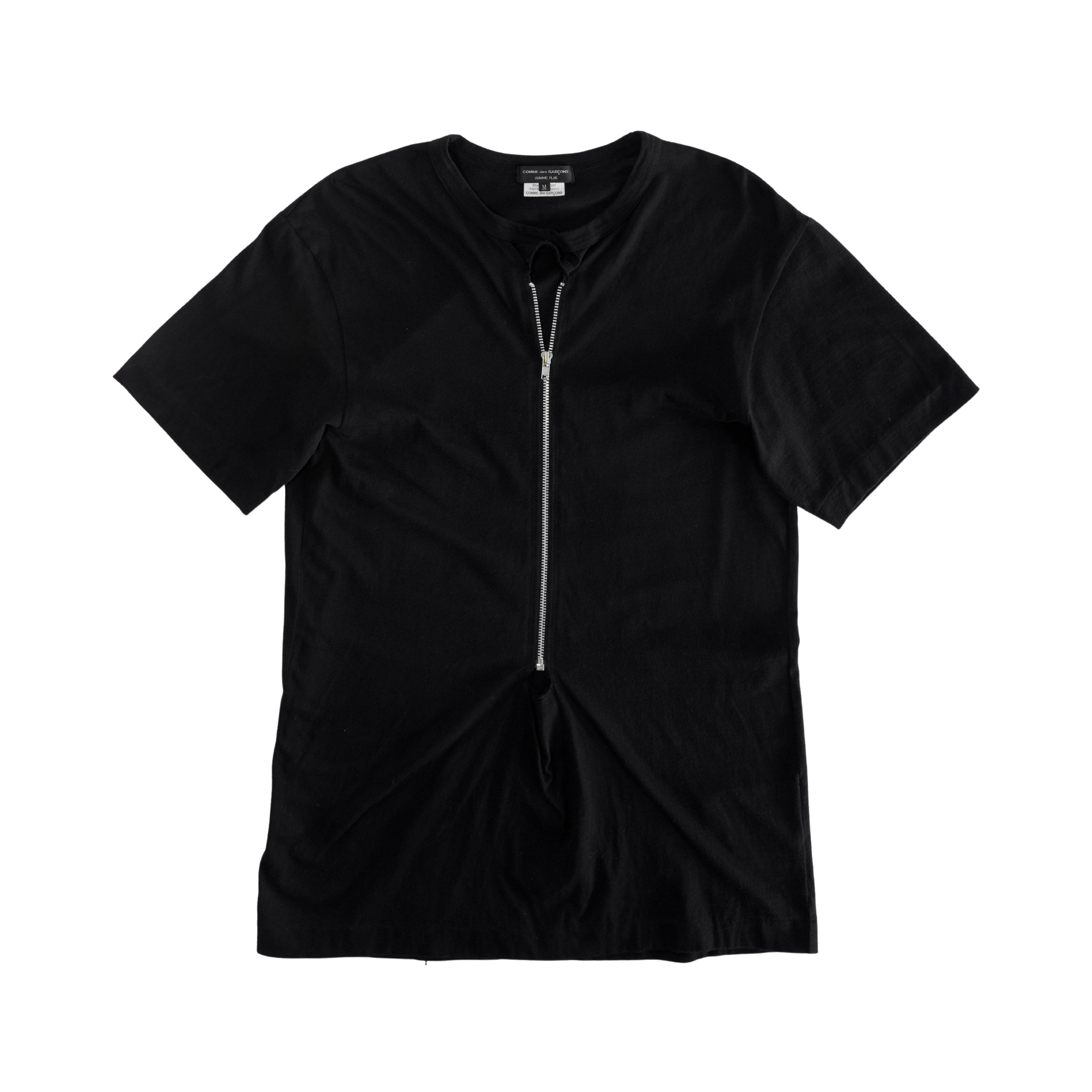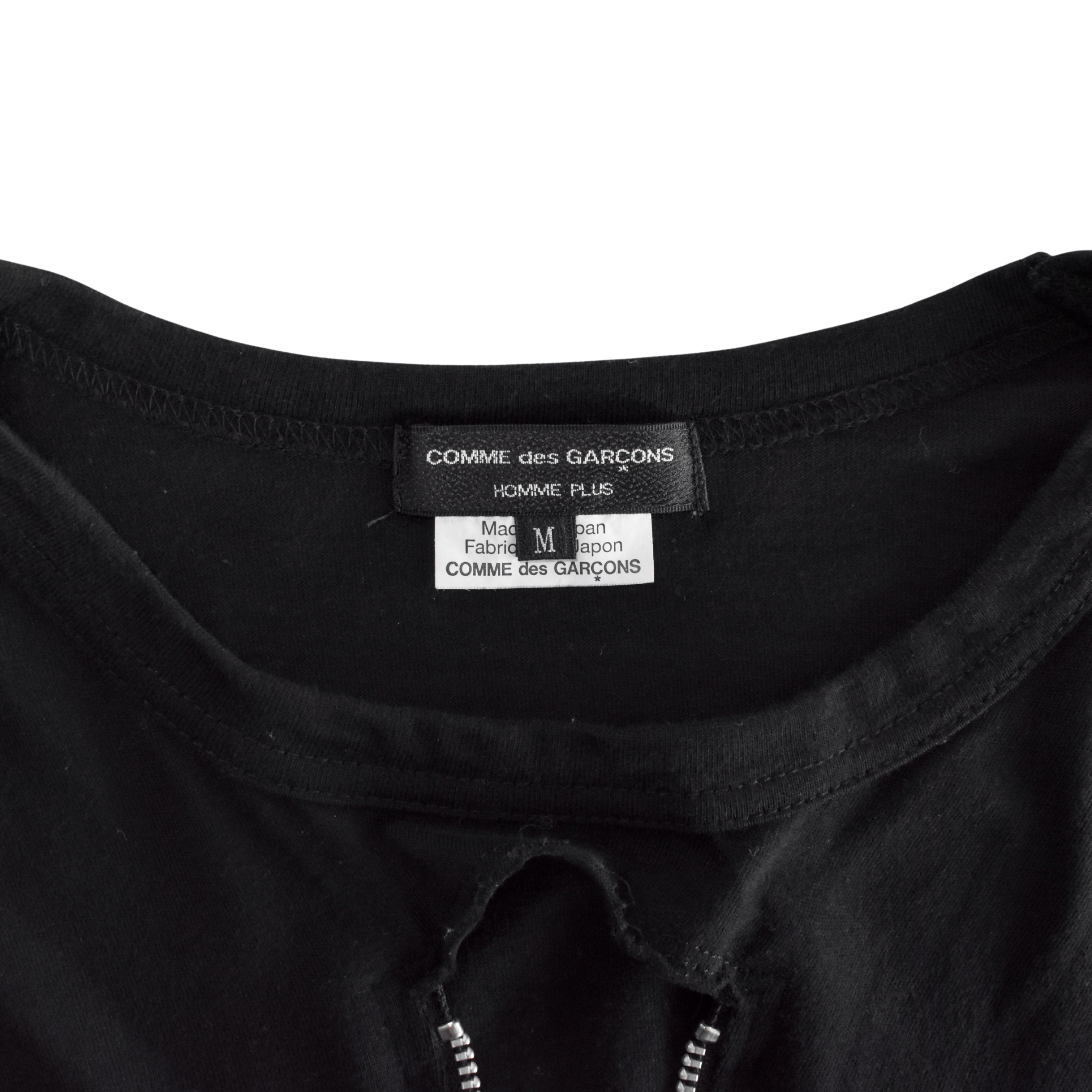Comme Des Garcons 'Zipper' t-shirt in black cotton a large silver zipper detail on the chest and cutout details on either side.