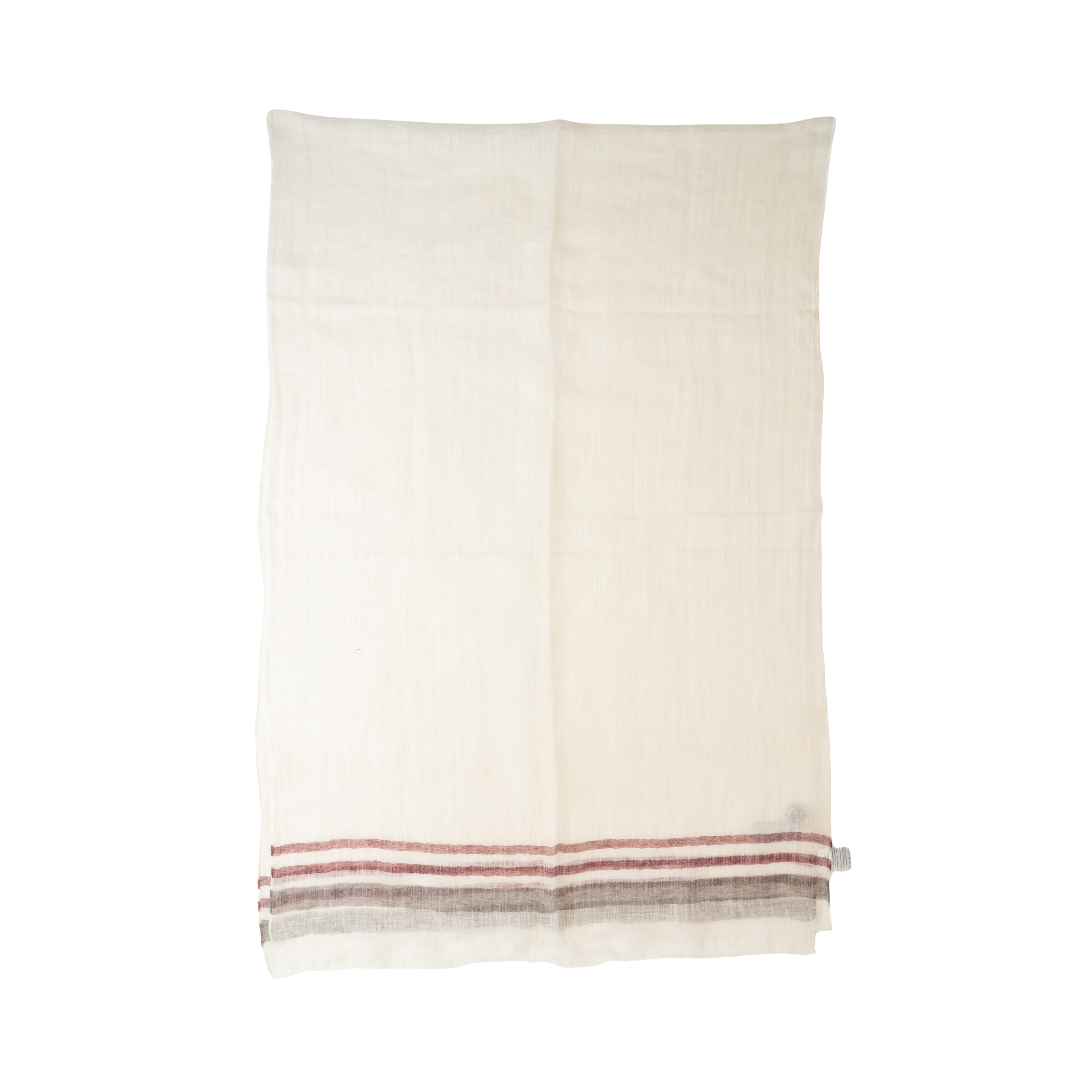 Eleventy large rectangular scarf in a white light linen with red and grey stripe near the edge and fringe trim.