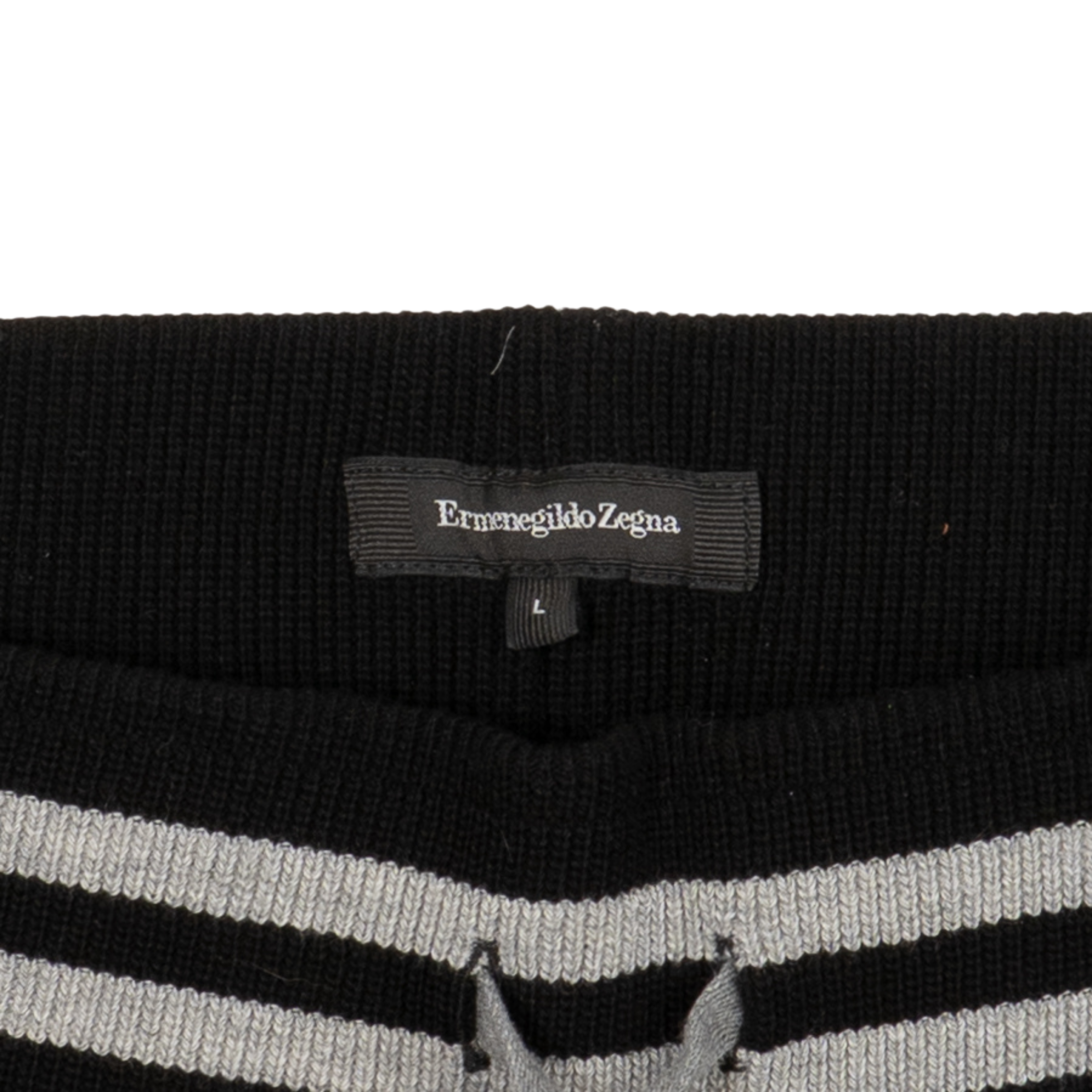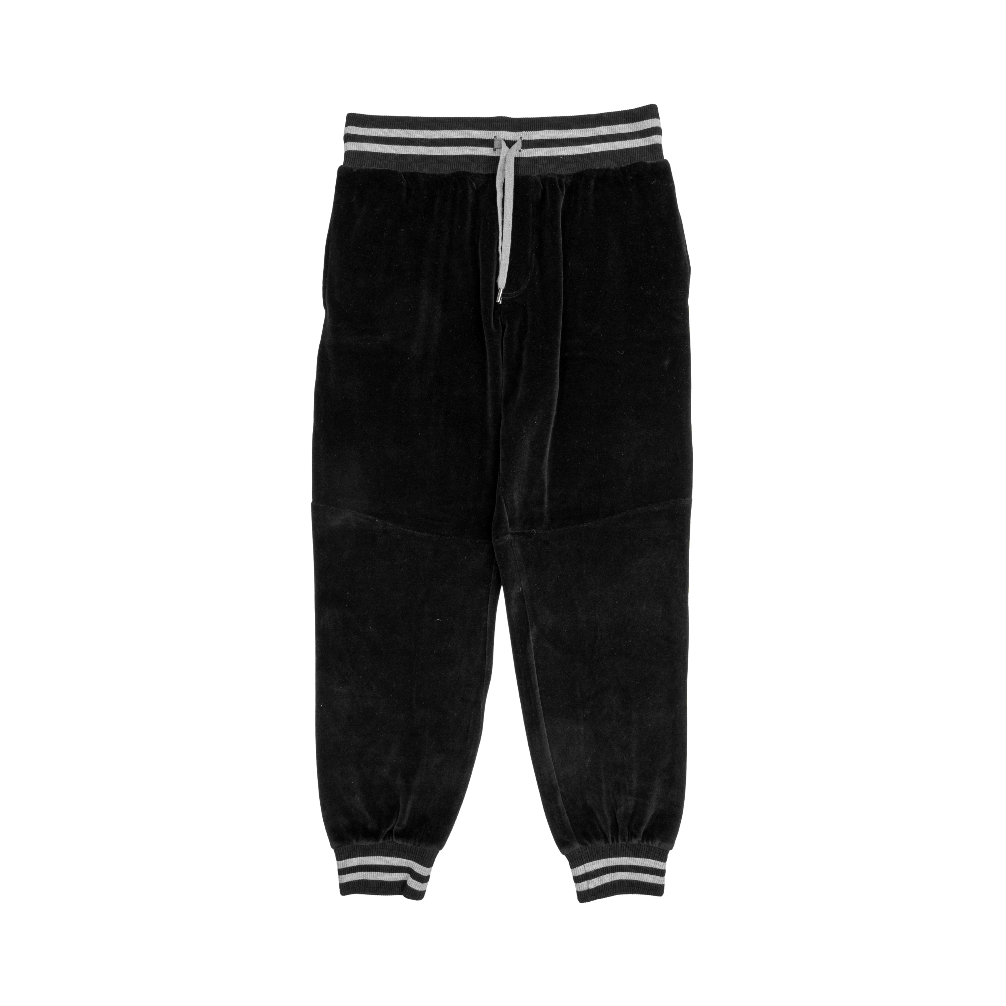 Ermenegildo Zegna tapered joggers in black velour with grey stripes around the waistband and ankle cuffs.
