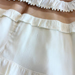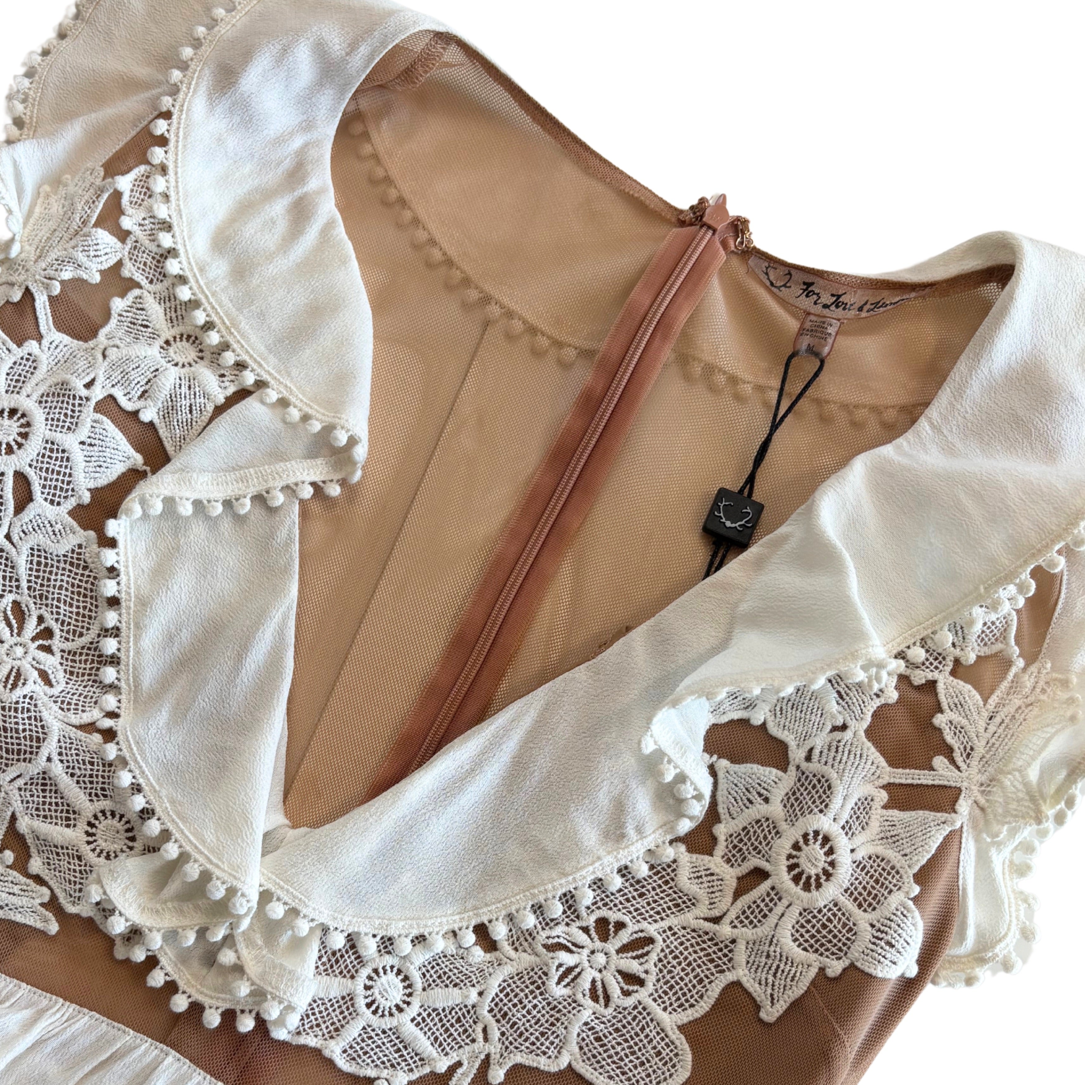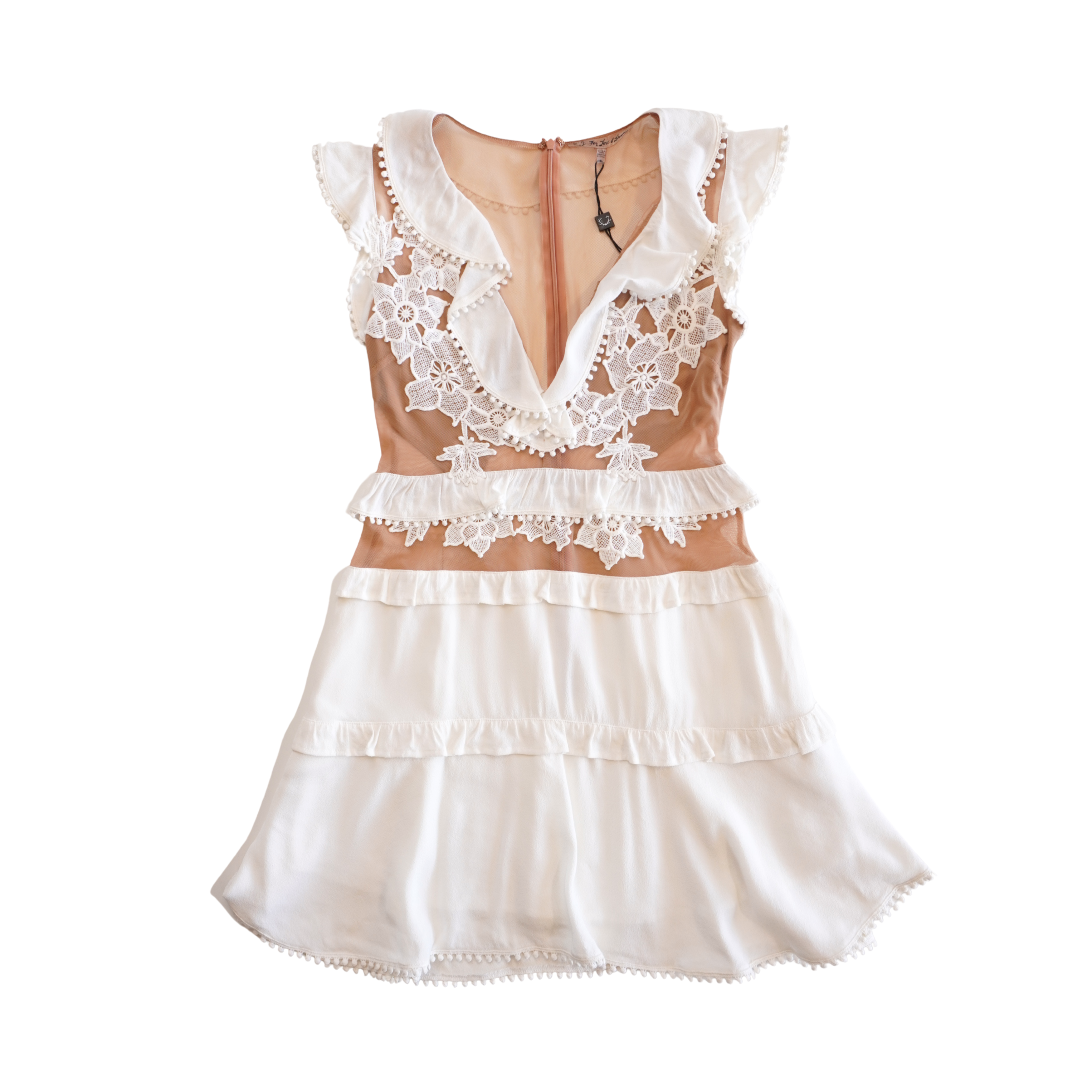 For Love & Lemons 'Laney Lou' mini dress in white crepe with nude mesh panels. Features lace appliques at the bust, ruffled trims, a deep V-neck, and cap sleeves.