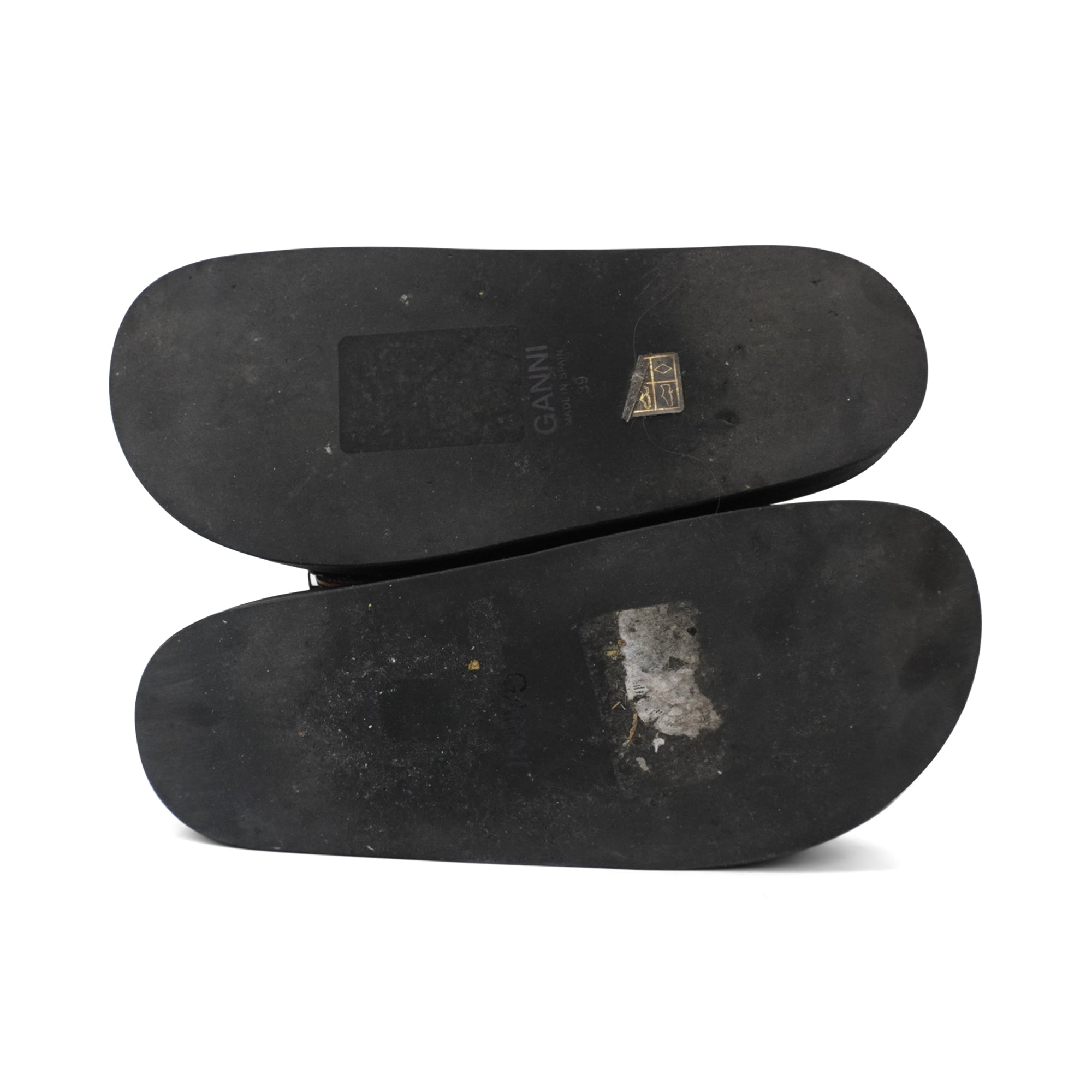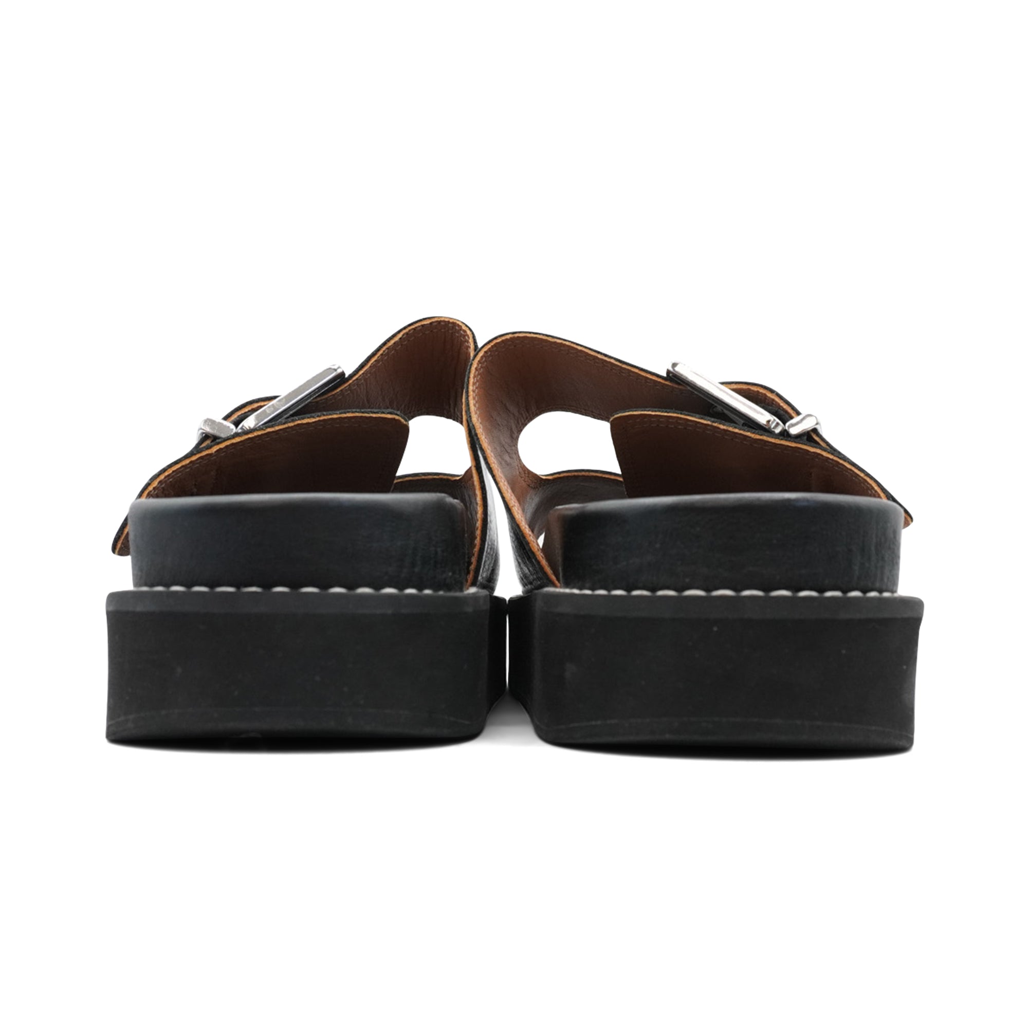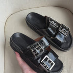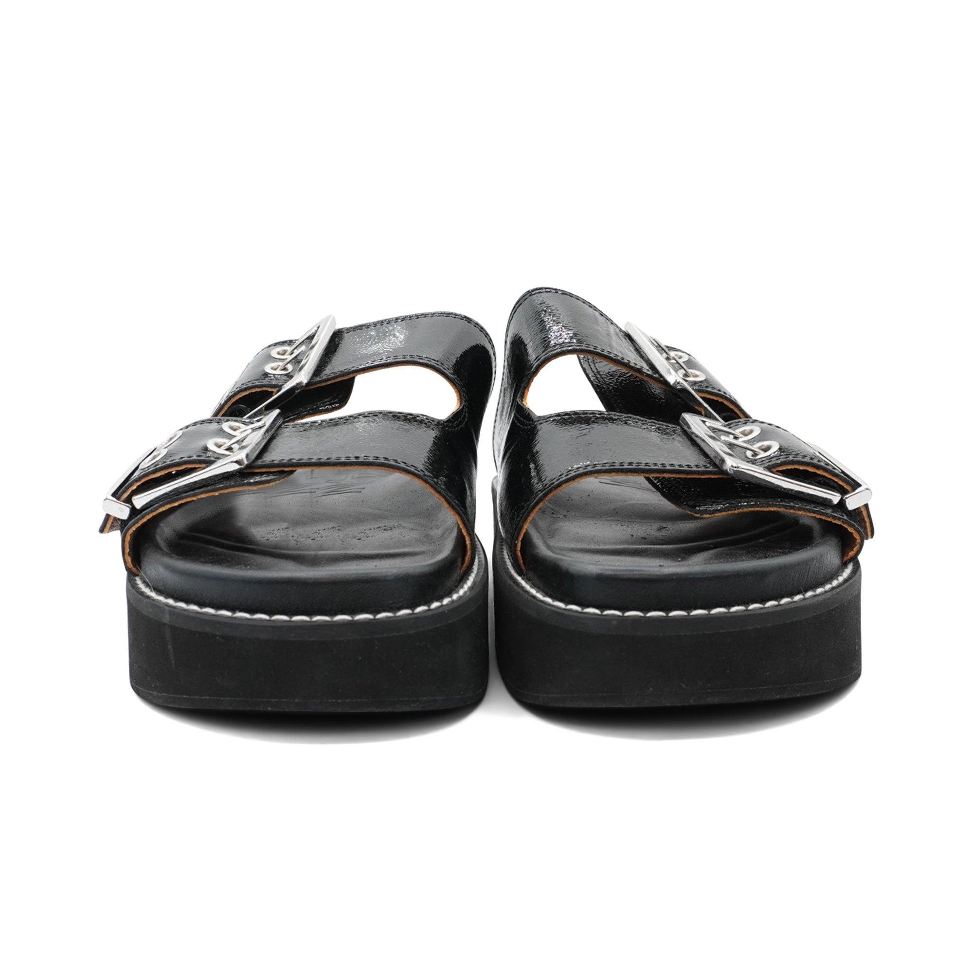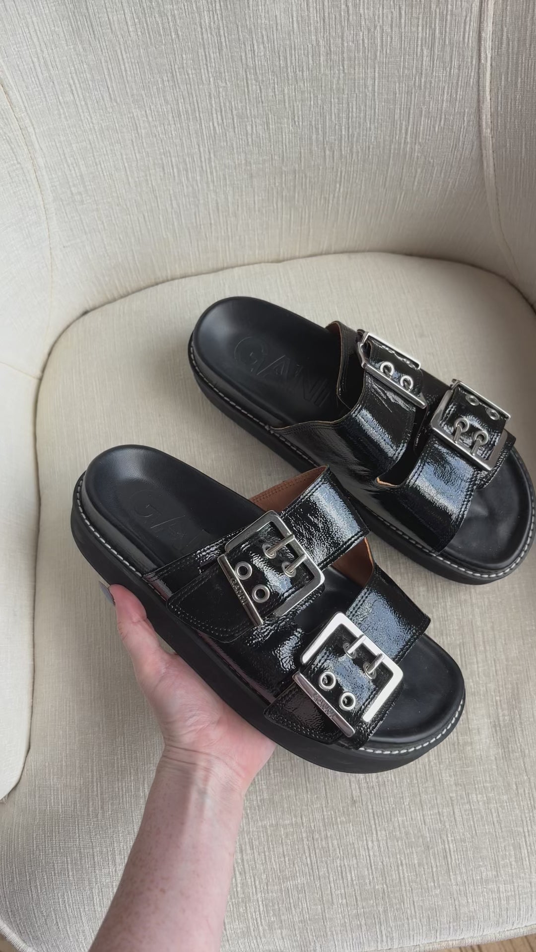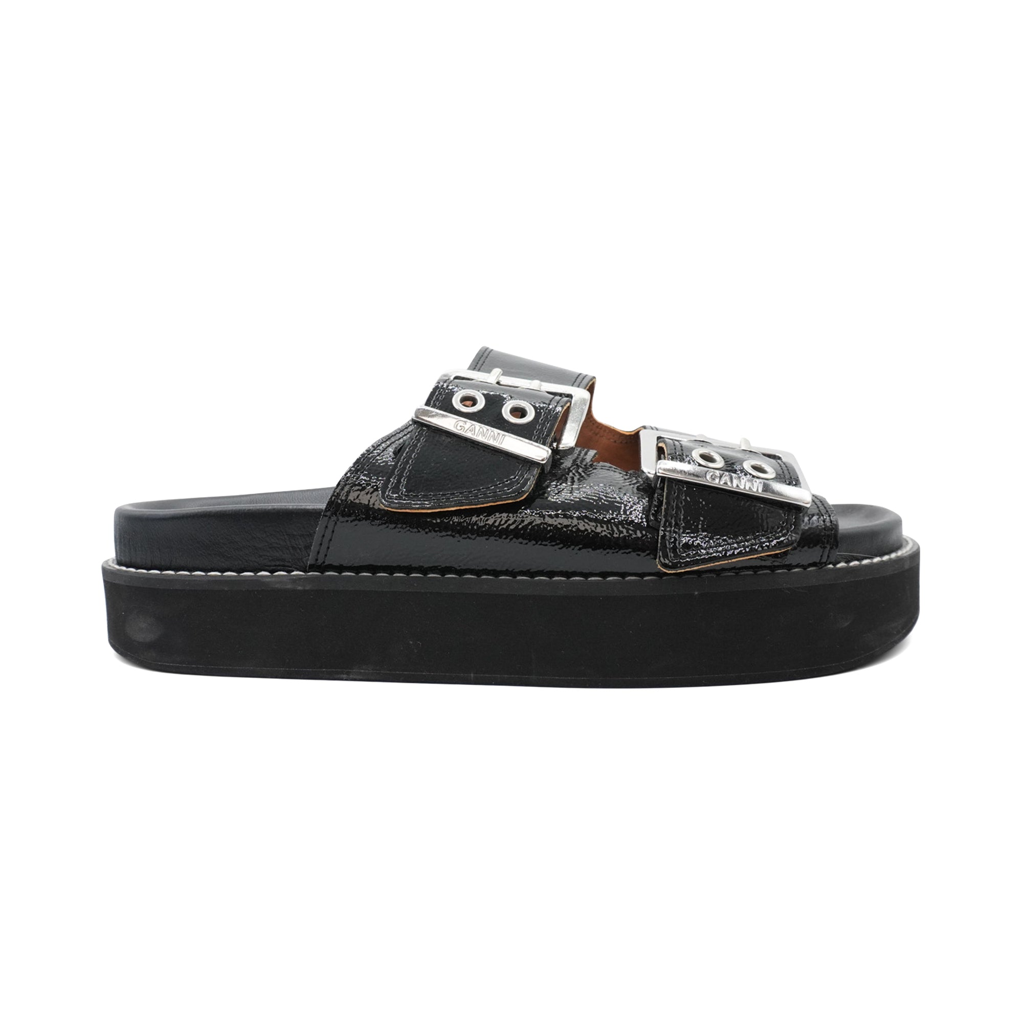 Ganni slide sandals in black patent leather with oversized silver buckle straps and platform soles.