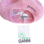 Ganni beret hat in pink loose knit mohair with a small black embroidered logo on the band.