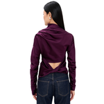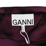 Ganni mock neck long sleeve top in dark purple nylon-satin with  ruching across the entire garment, a hidden zip opening at the shoulder, and a triangular back cutout.