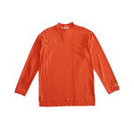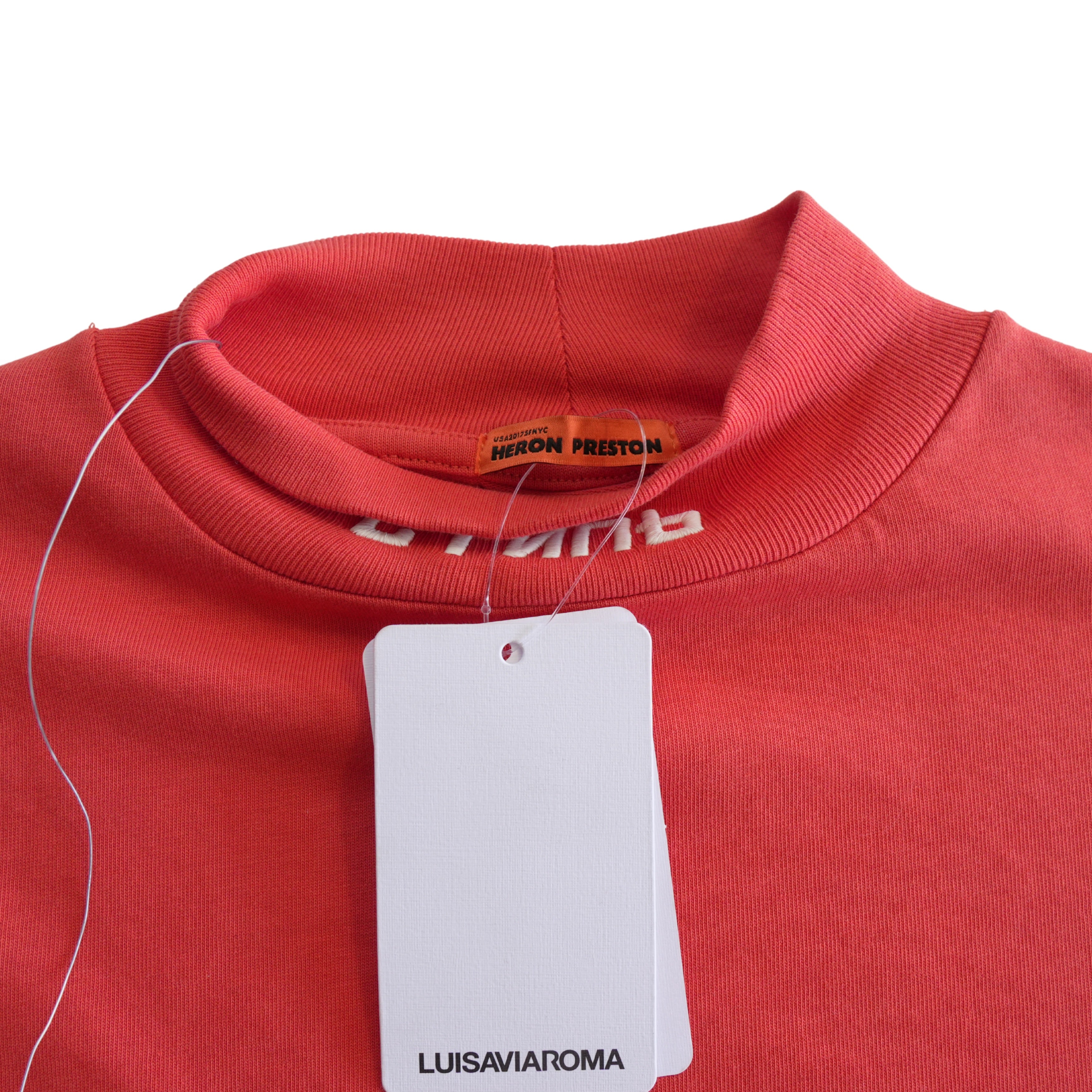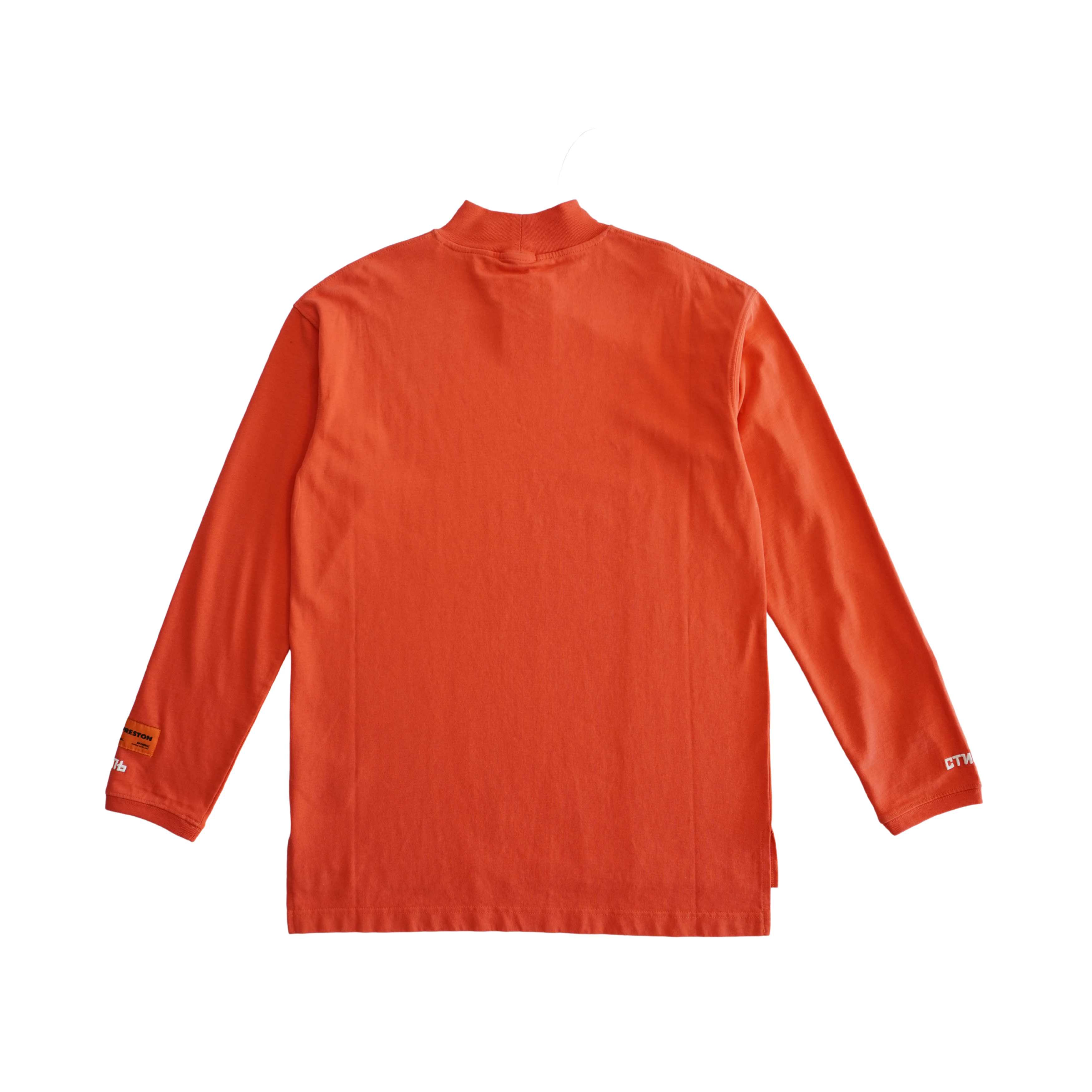 Heron Preston oversized mock neck long sleeve in orange cotton with embroidered white sleeve and neck with orange logo label.