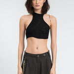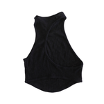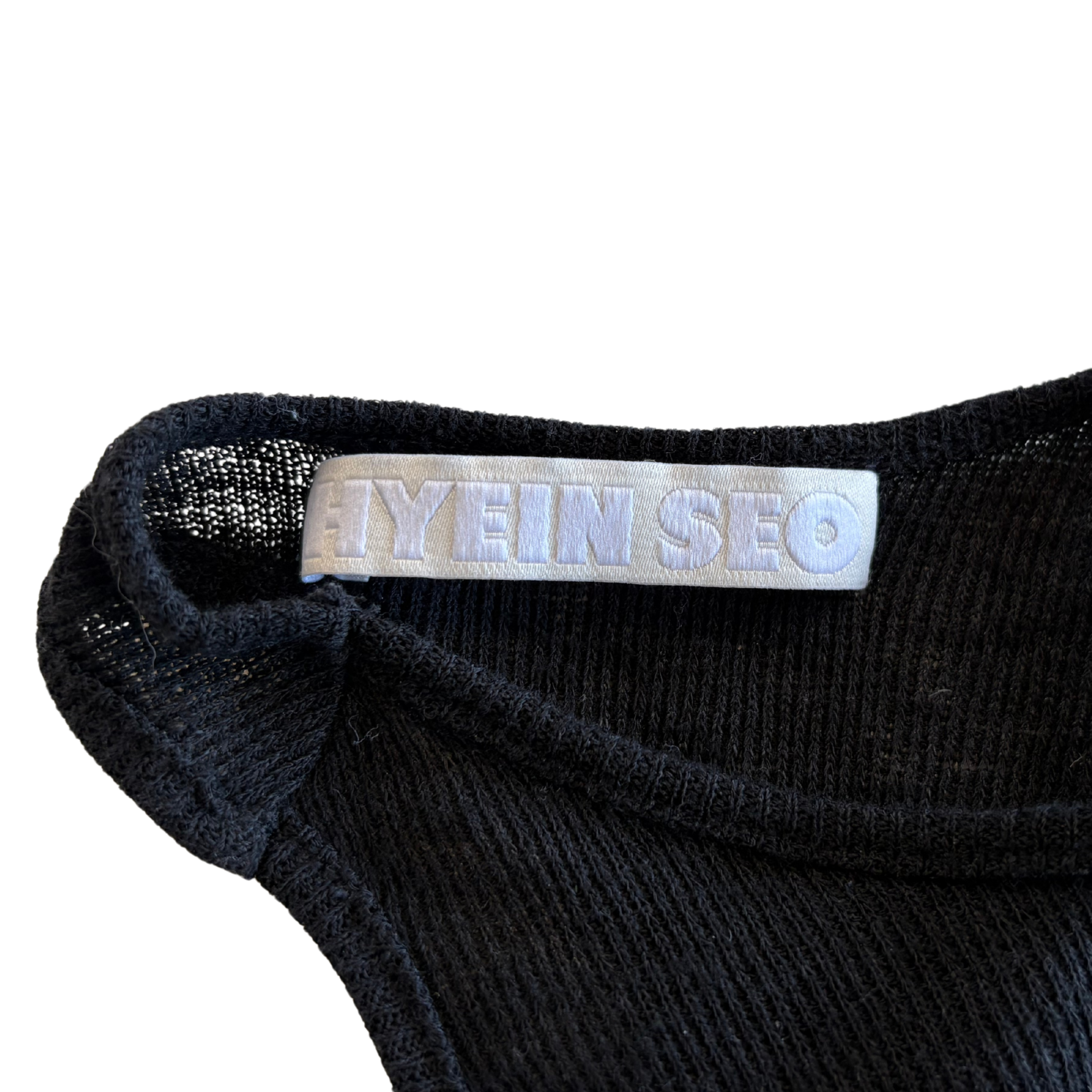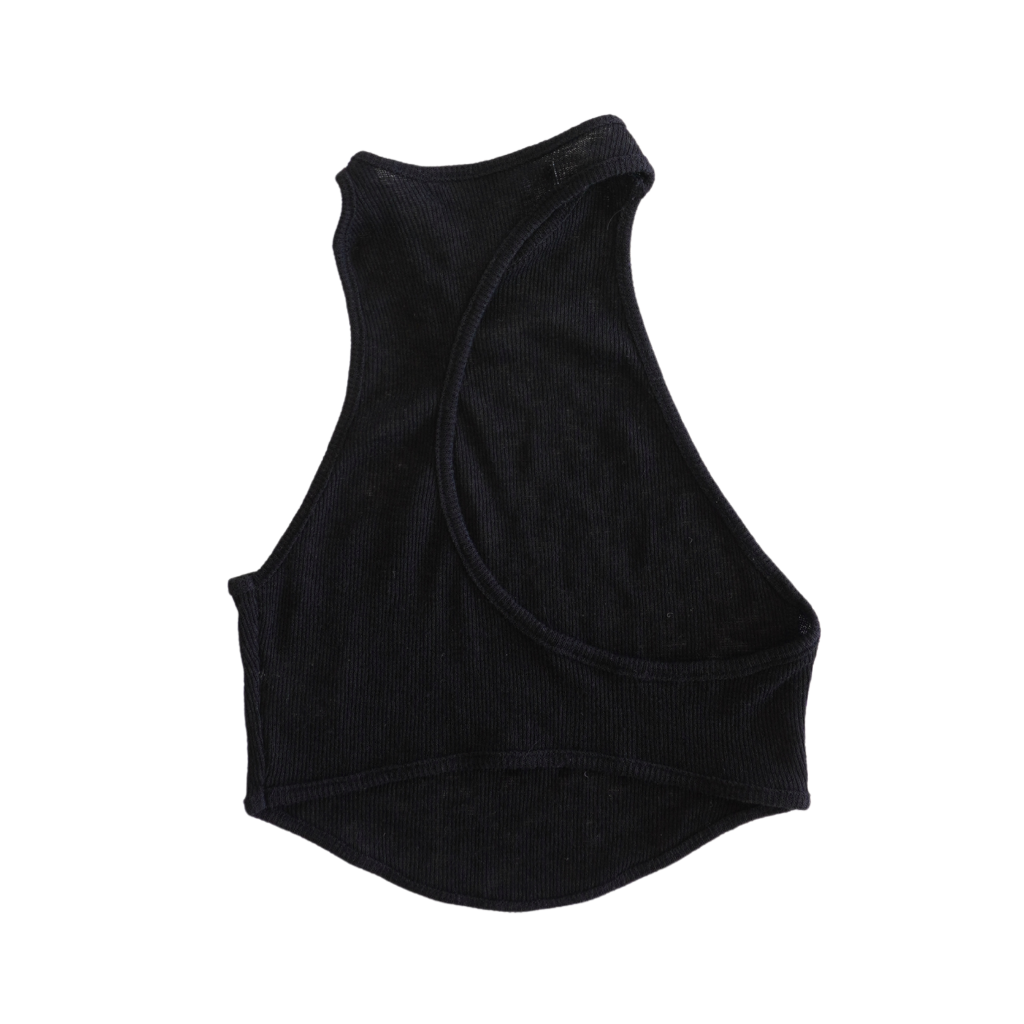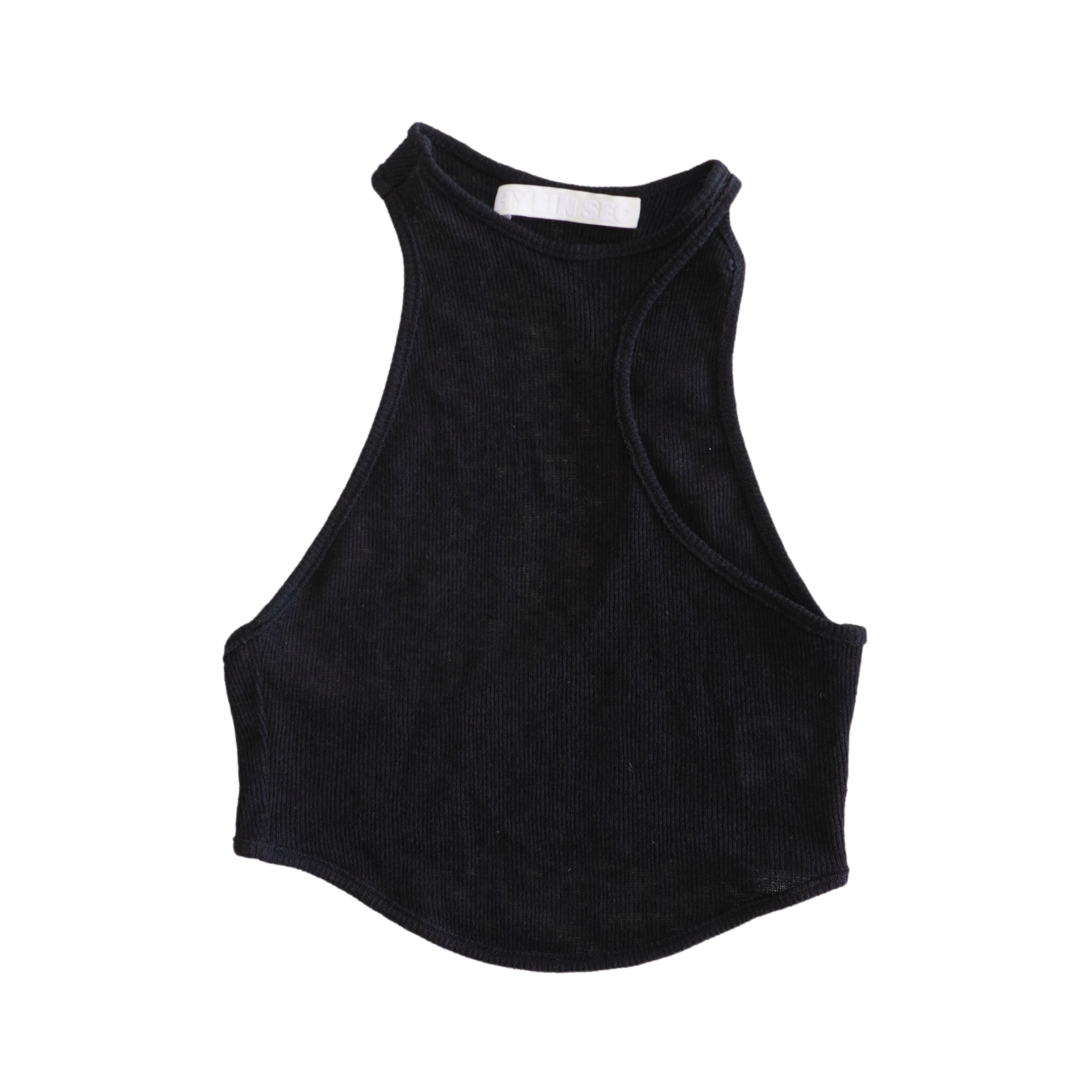 Hyein Seo 'Crescent' tank top in black knit with asymmetrical racer back cut.