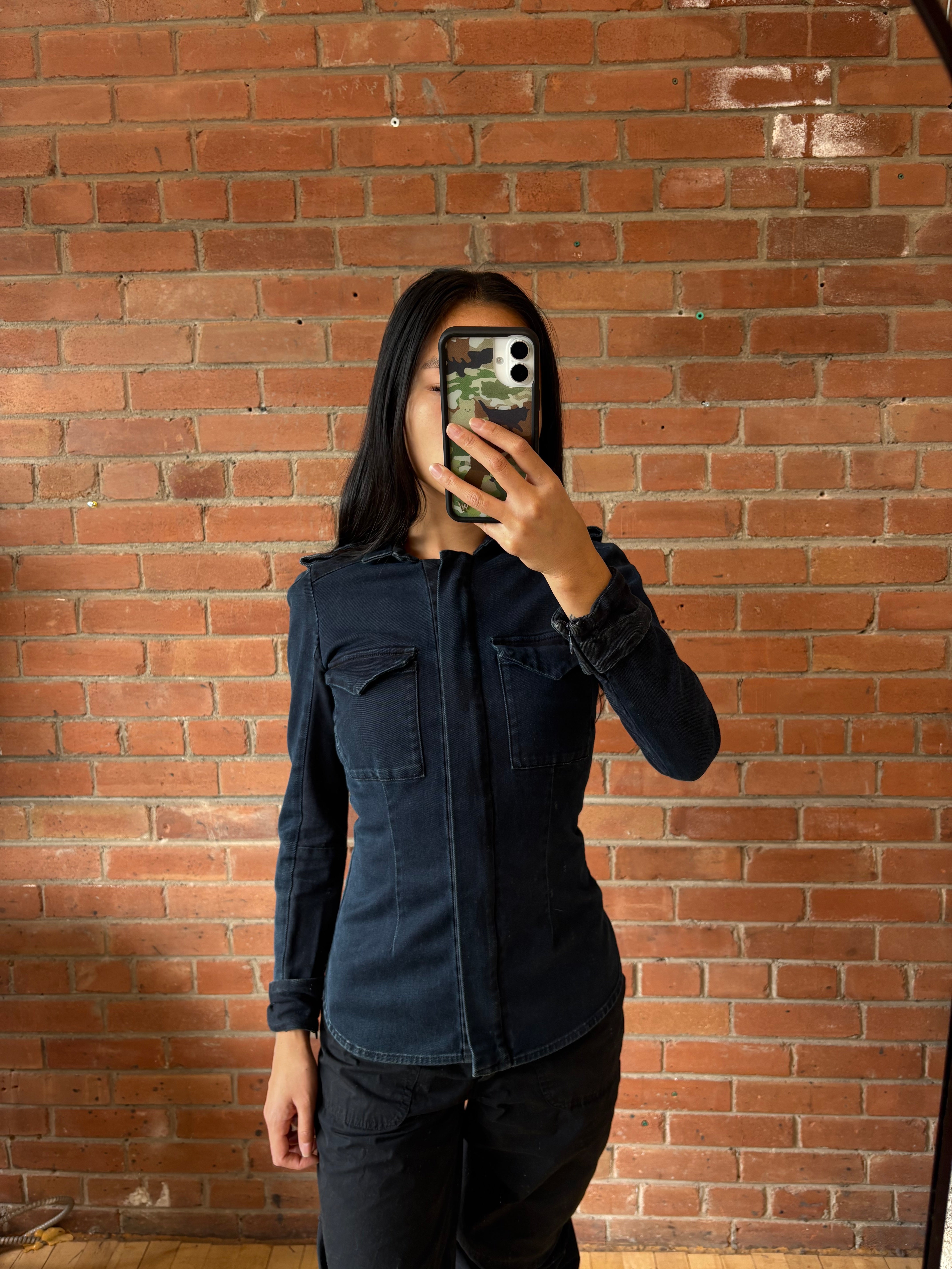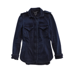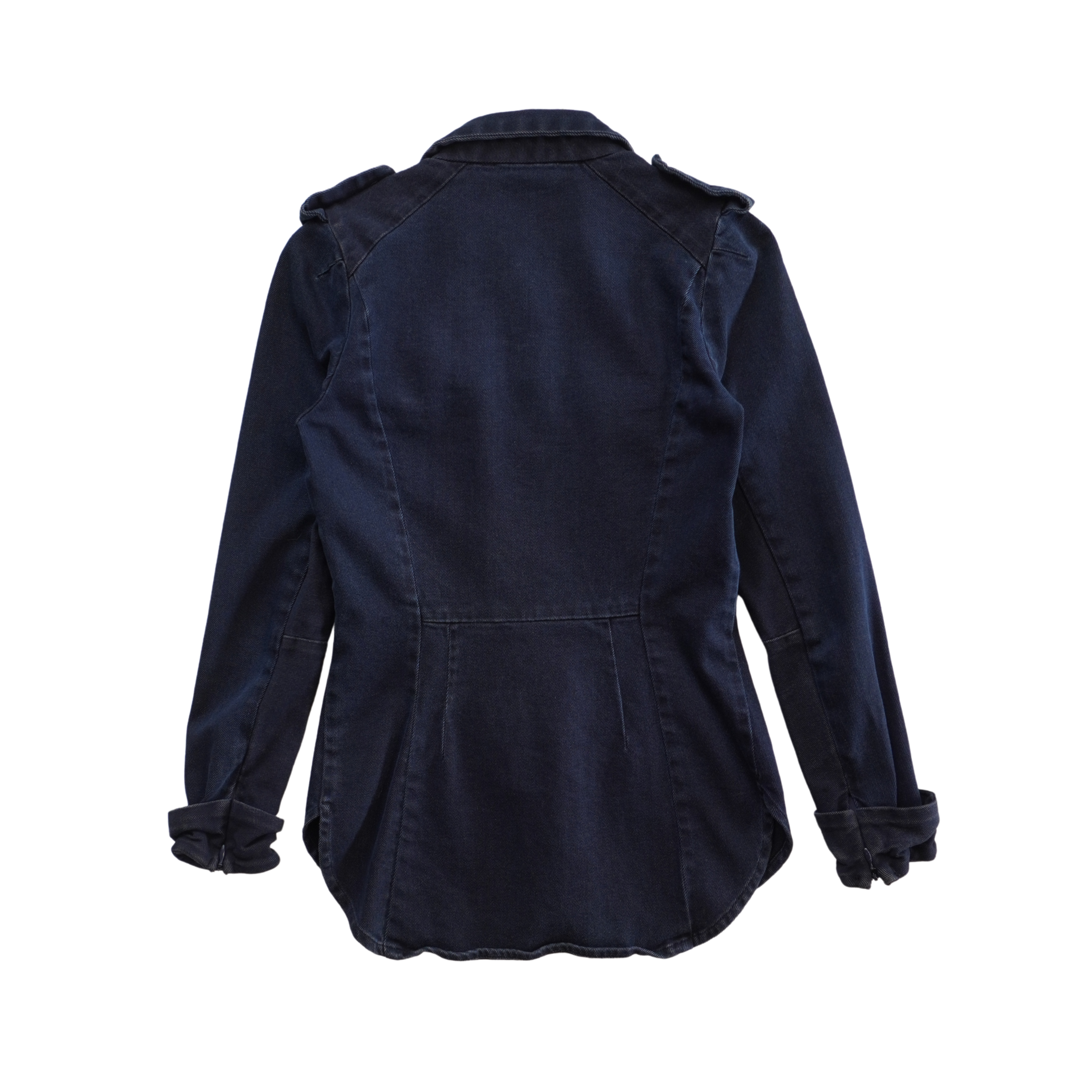 Isabel Marant utility jacket in faded dark navy denim with a hidden front zip opening in silver hardware, chest flap pockets, and shoulder epaulettes.