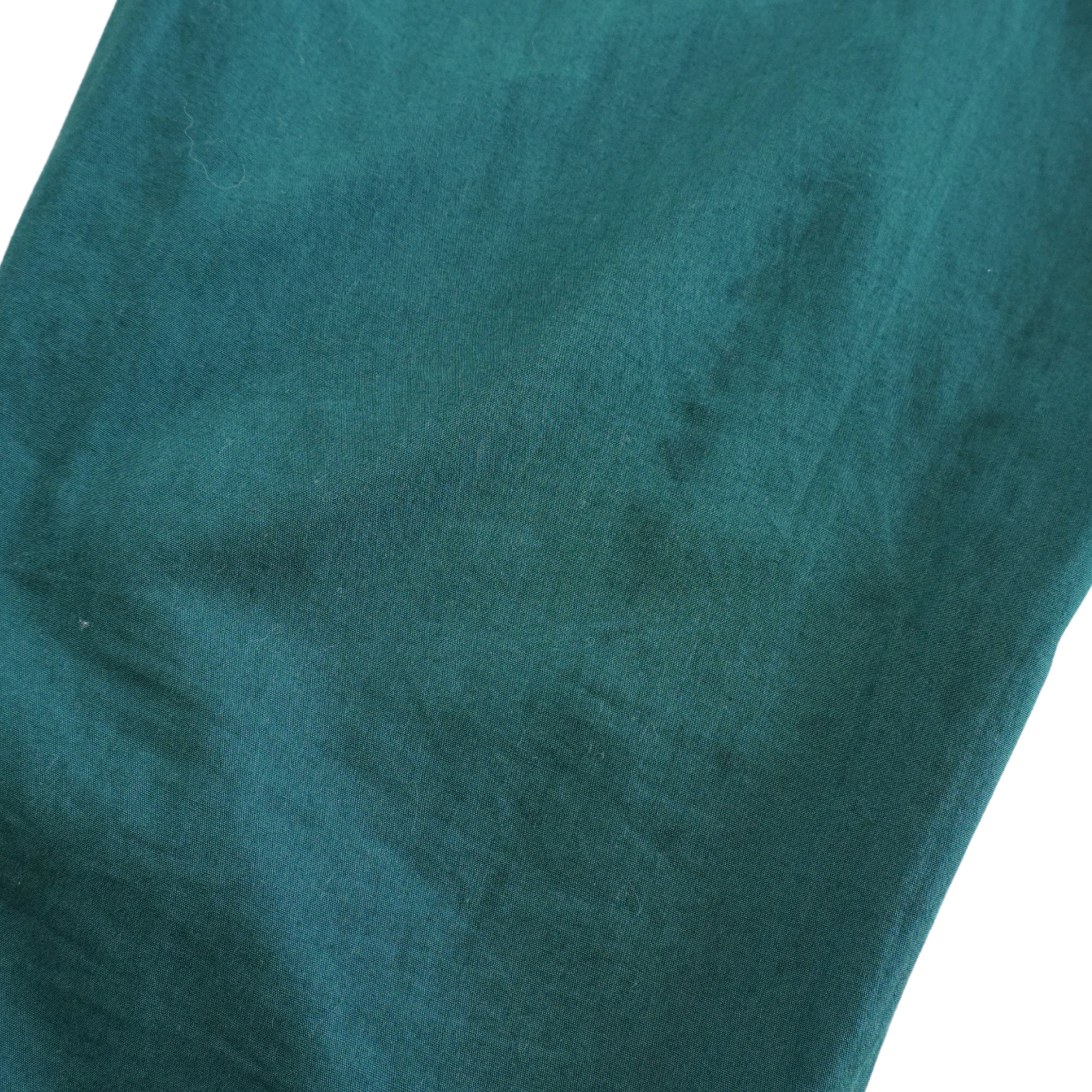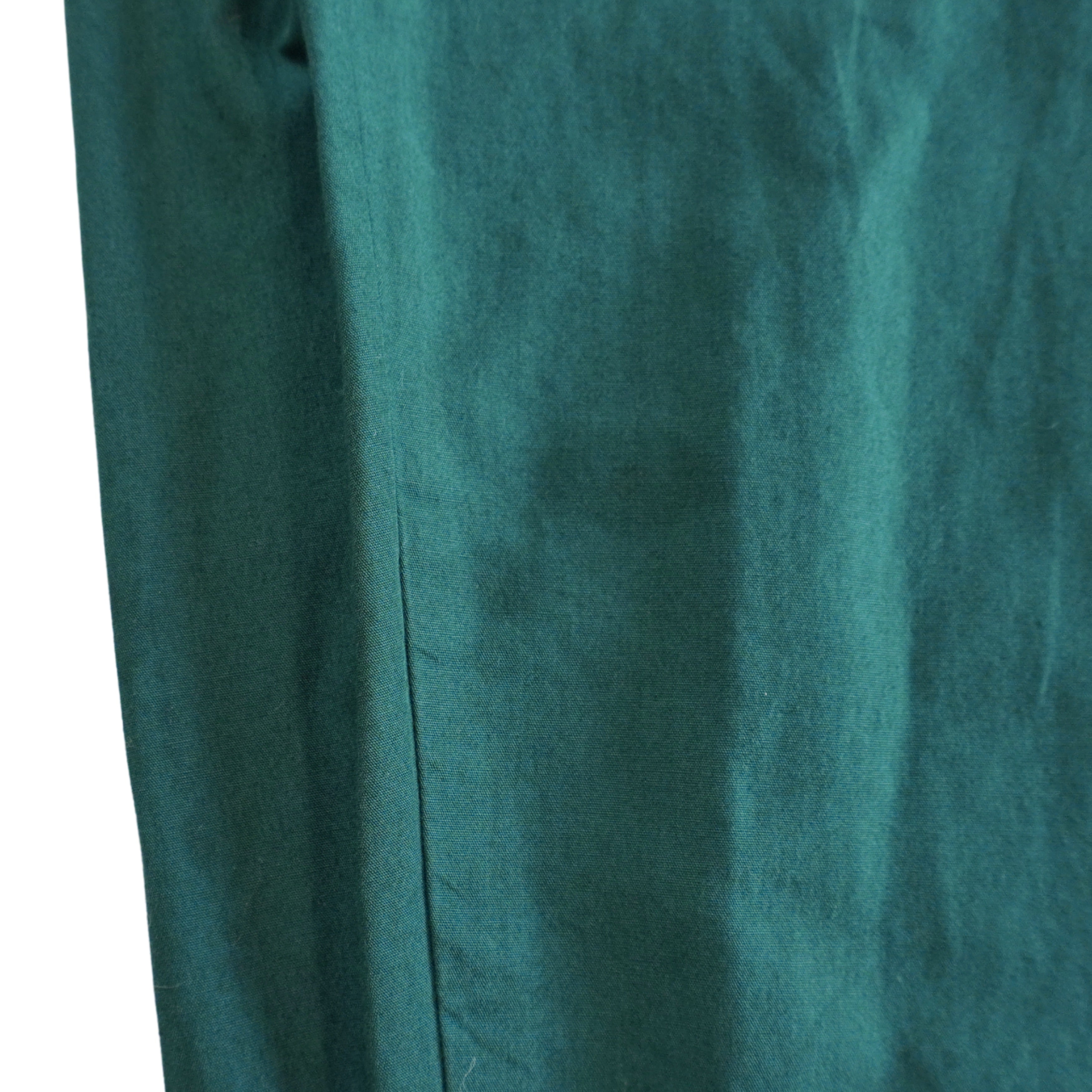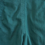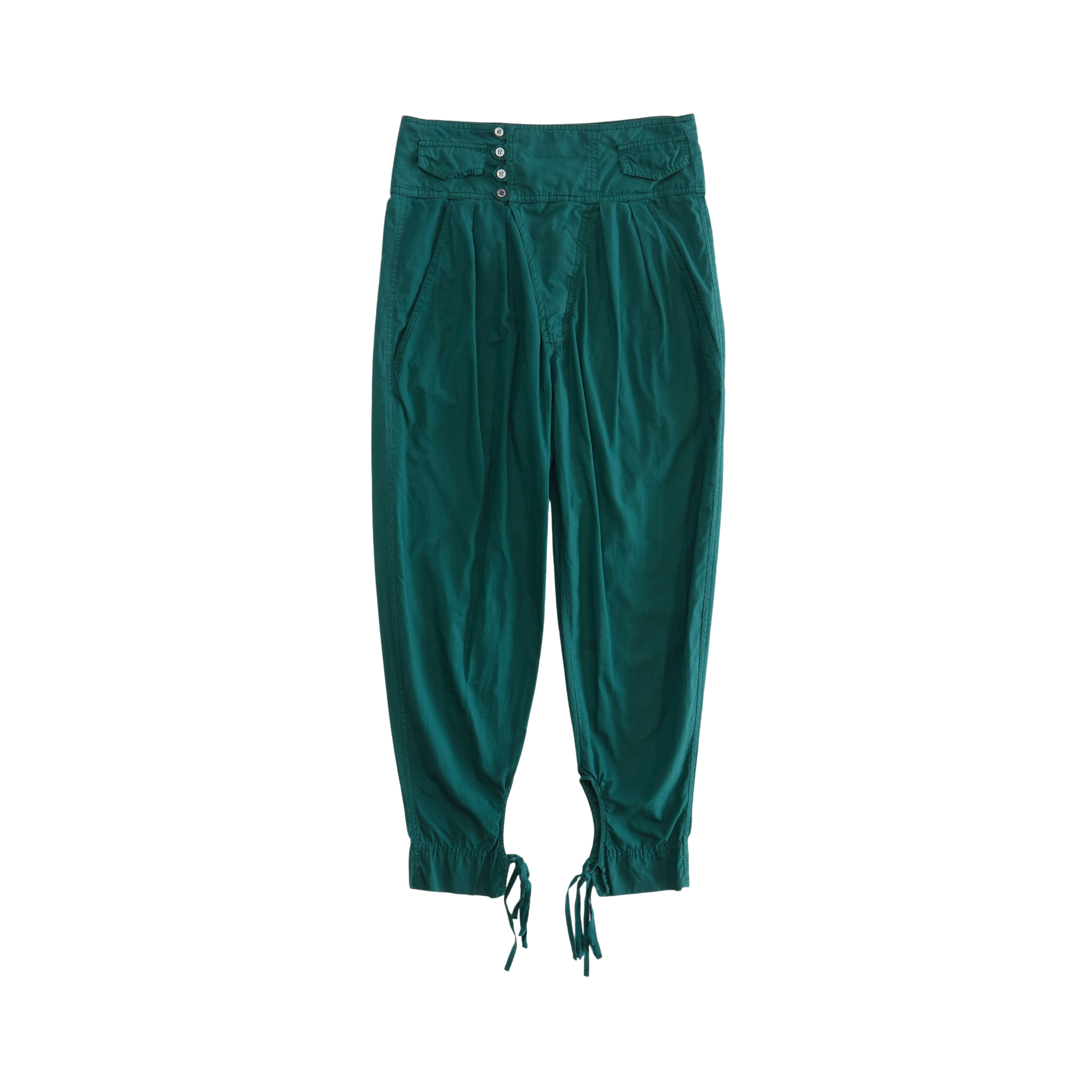 Isabel Marant high-waisted trousers in teal green cotton with a pleated waistline, a four button closure, and a tapered leg with ties at the hem.