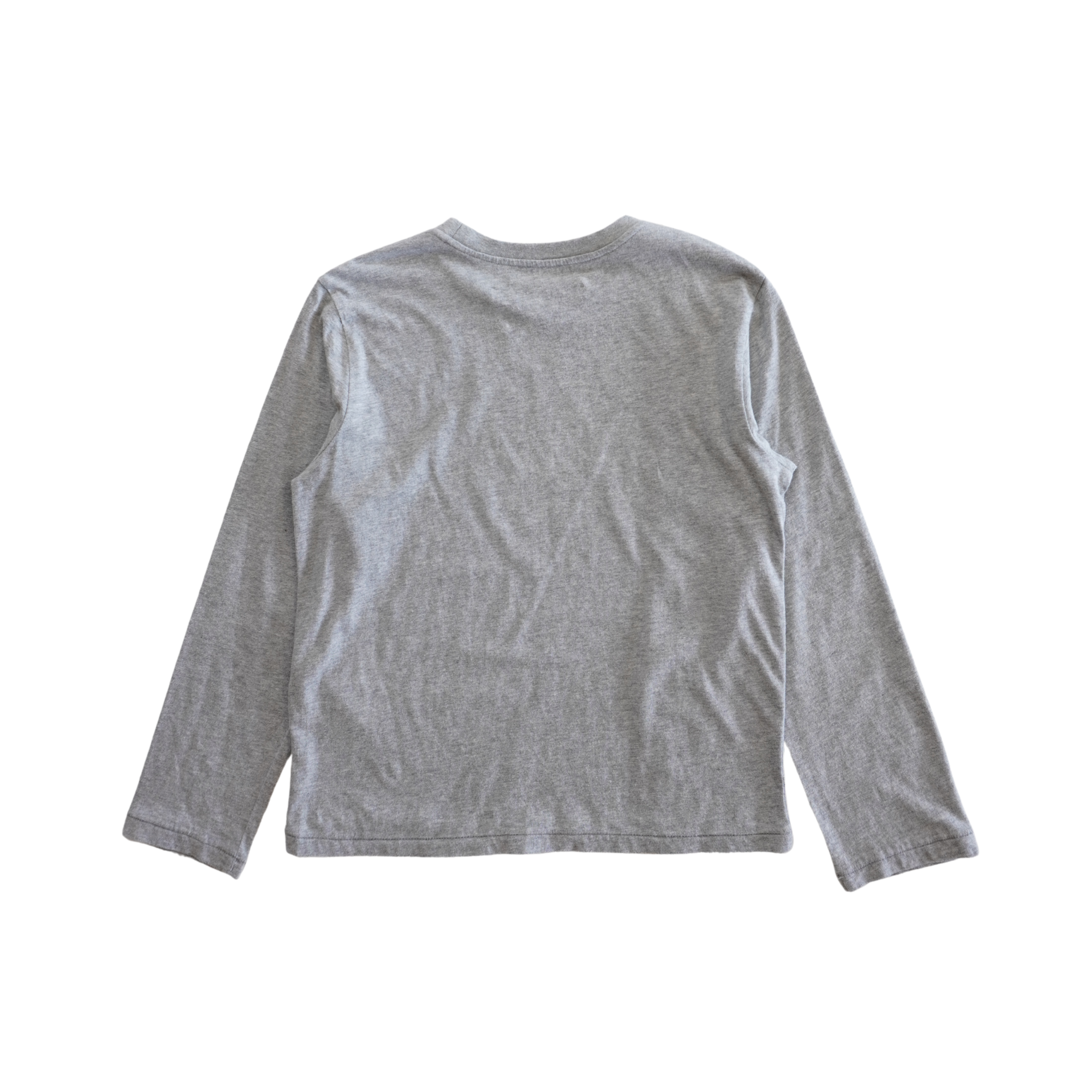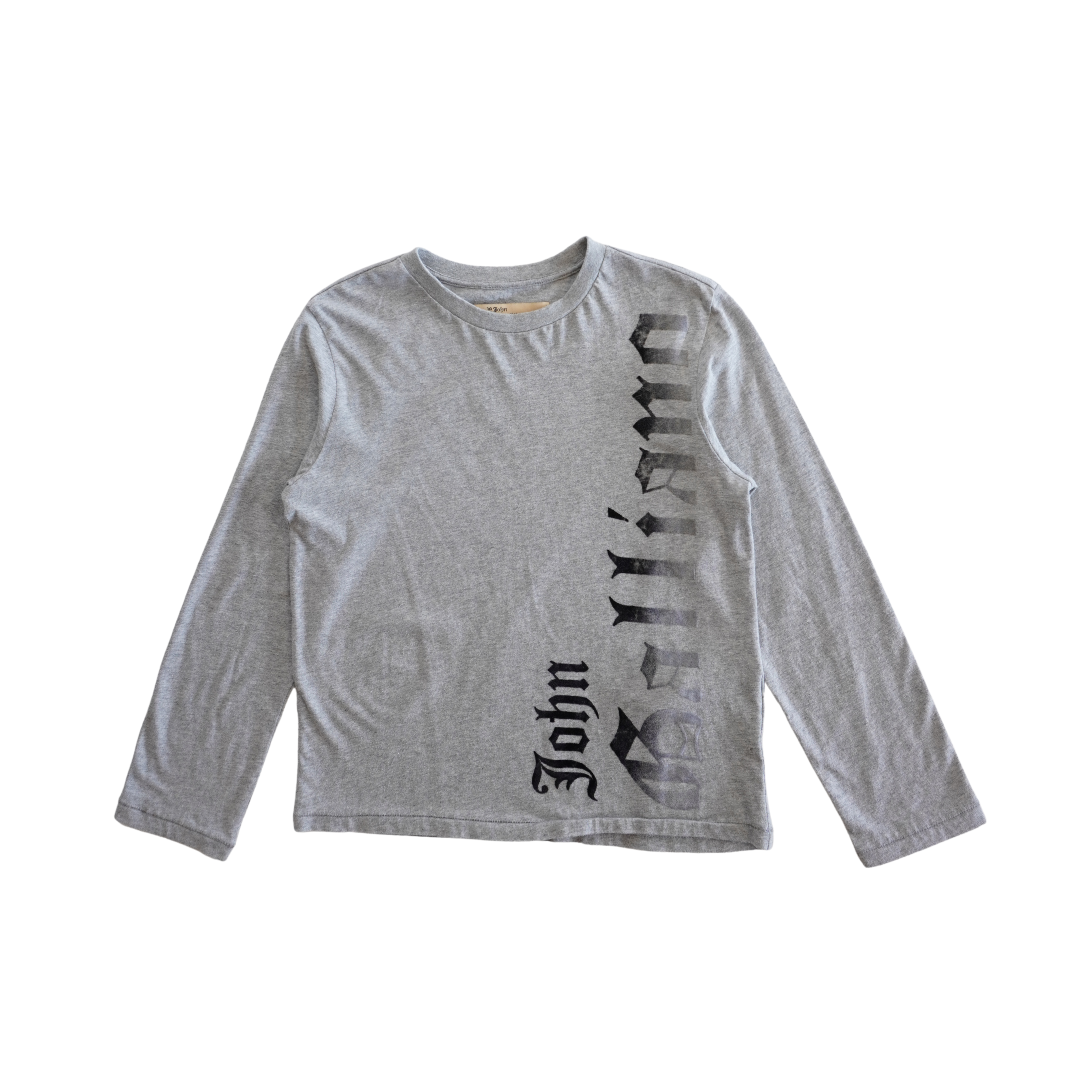 John Galliano long-sleeve t-shirt in grey heathered cotton with a black and grey faded velour logo graphic down the side.