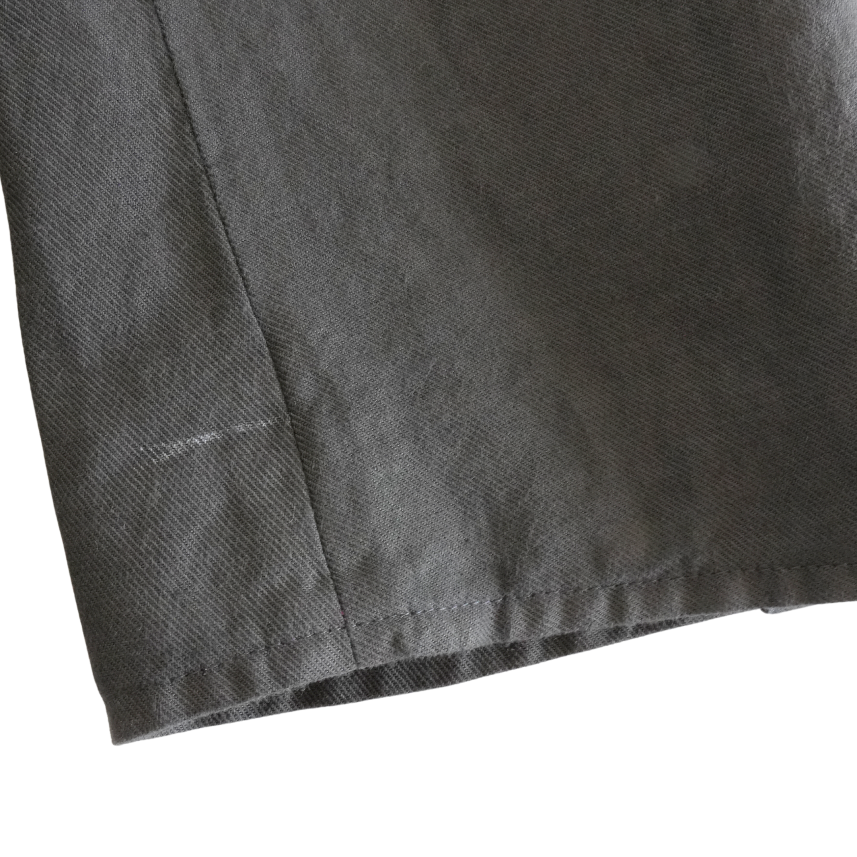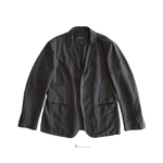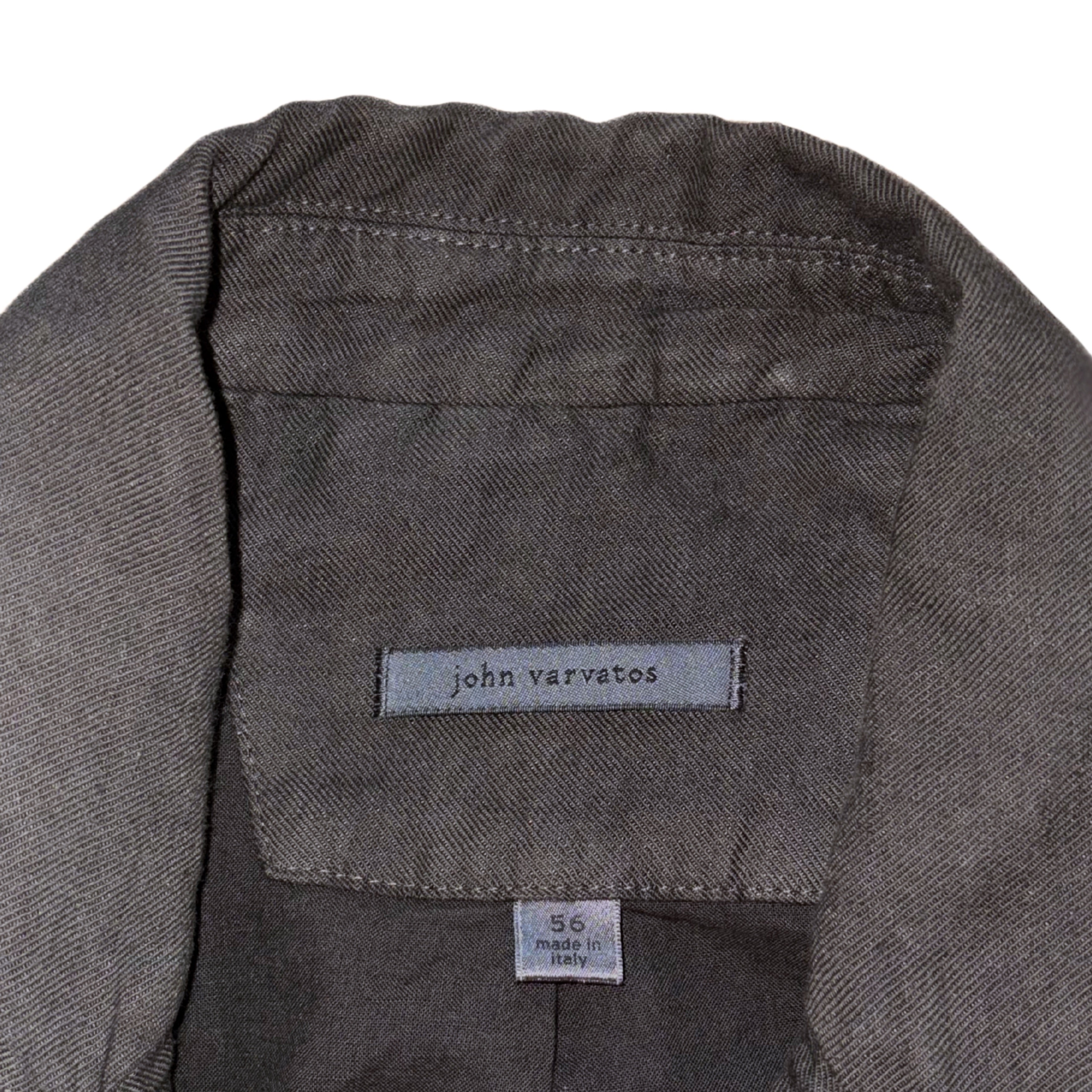 John Varvatos unstructured blazer in dark grey linen with two front welt pockets, lapel collar, back vent and gunmetal hook and eye closure.