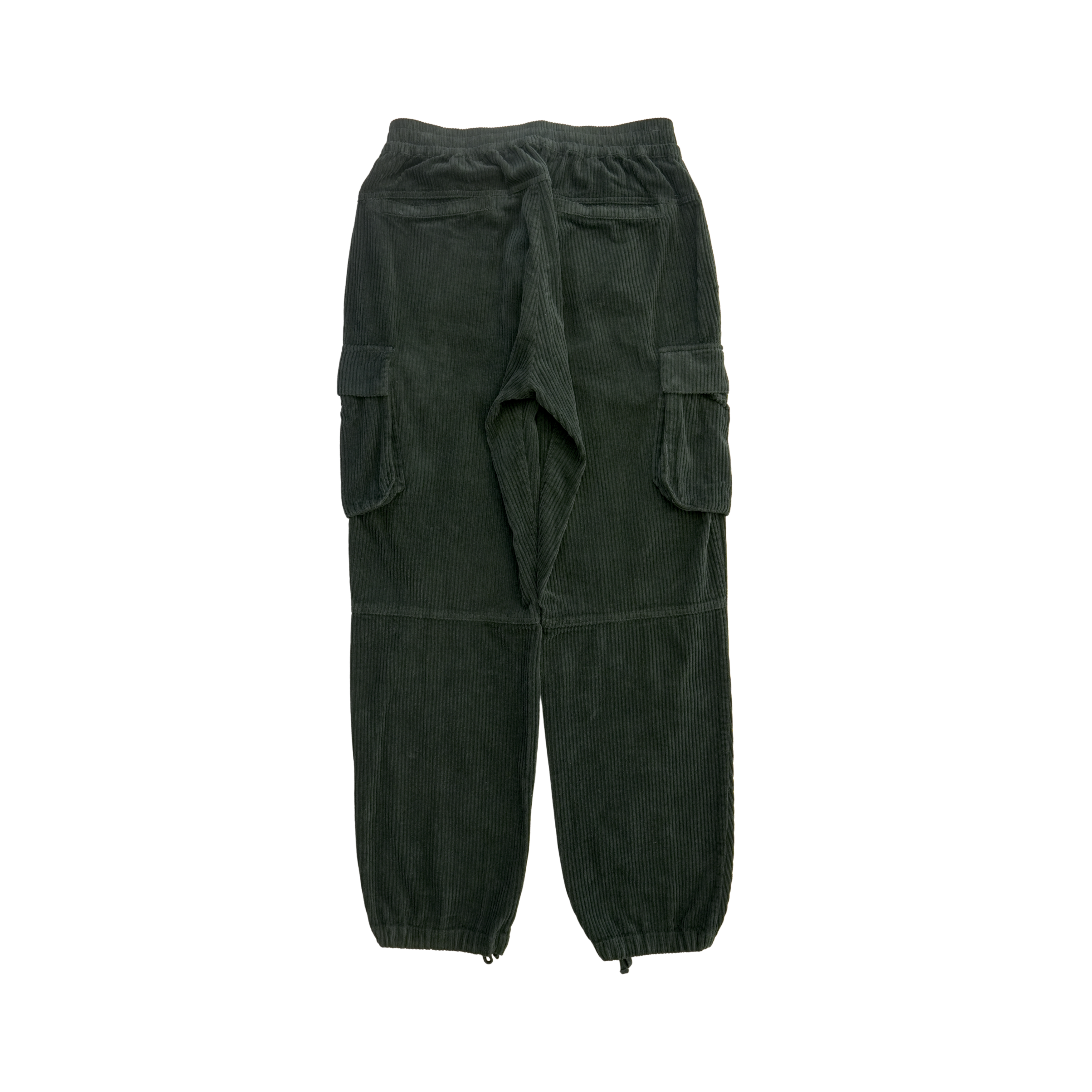 Kith 'Bristol' pants in dark green corduroy with cargo pockets on the sides, a snap button closure at the waistband, and drawstrings at the waist and hem.