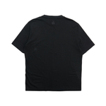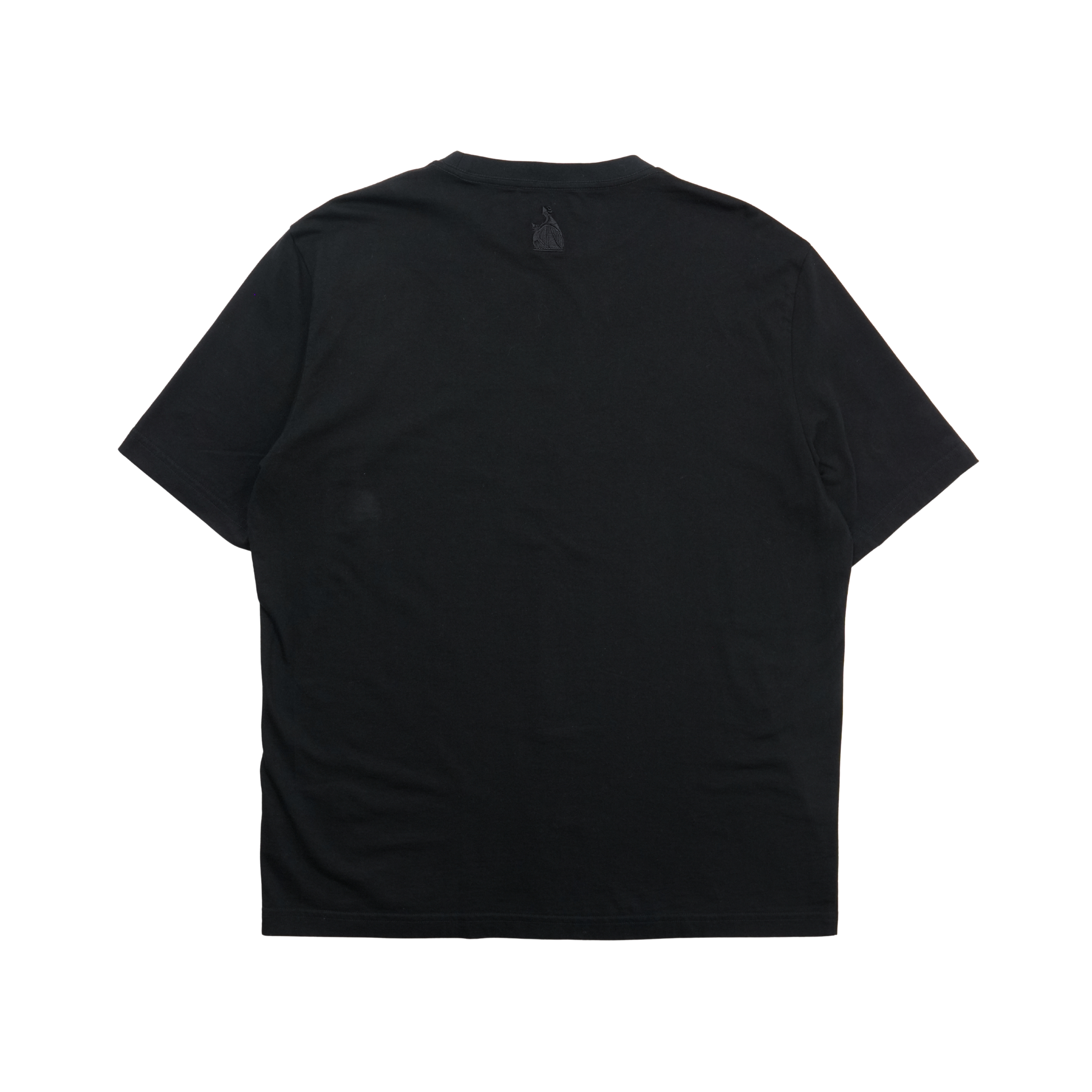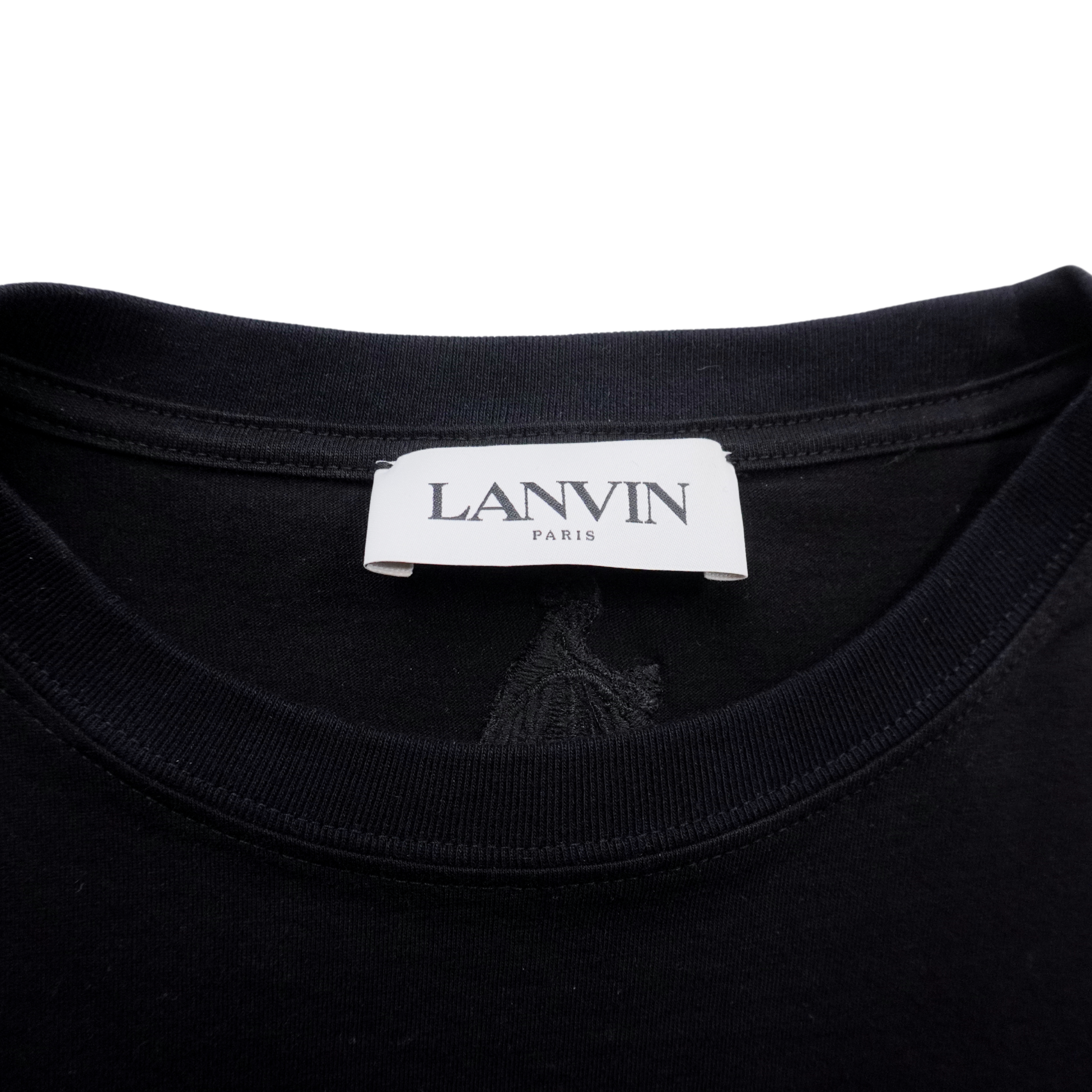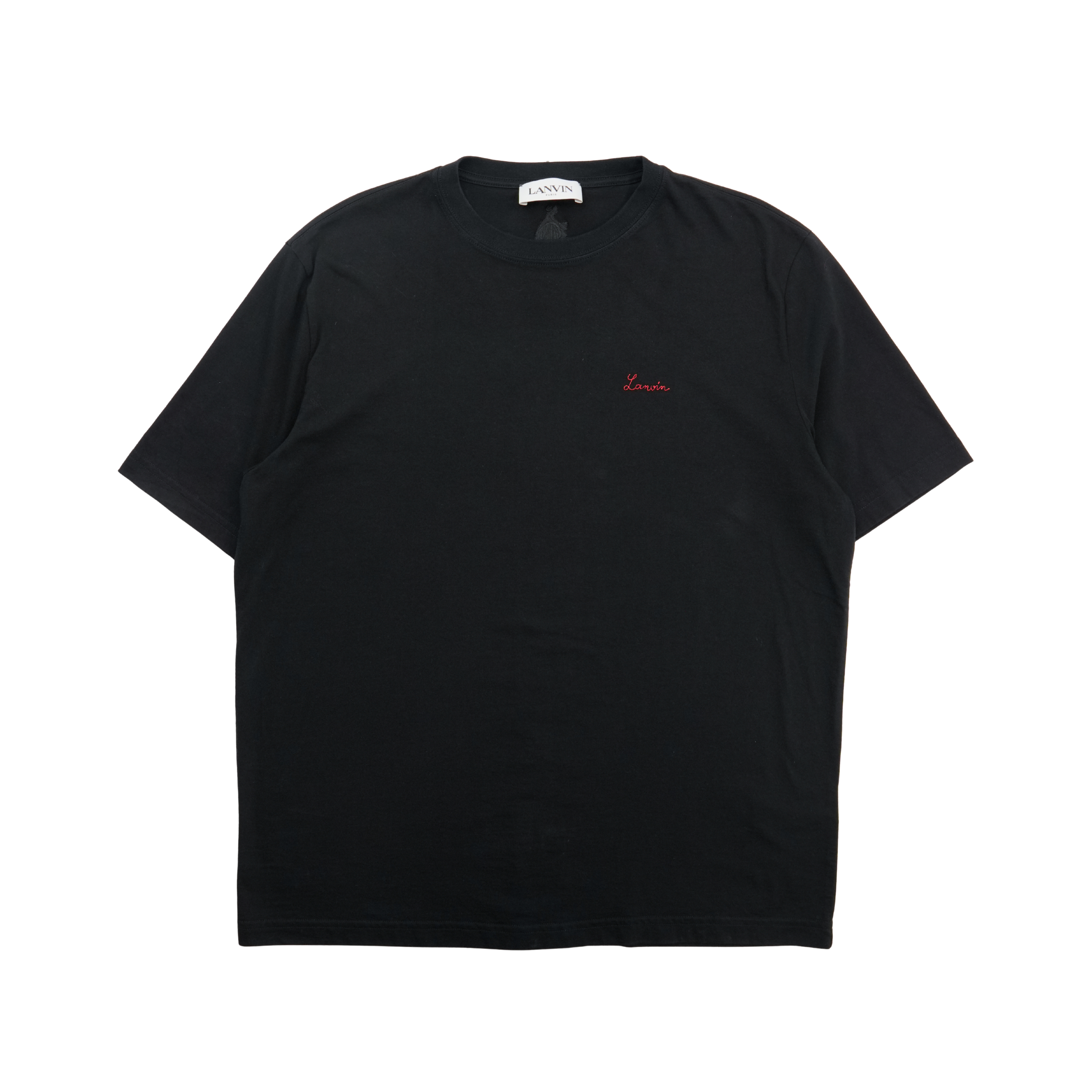 Lanvin black short-sleeve t-shirt with red embroidered cursive logo text on the chest and black embroidered logo on the upper back.