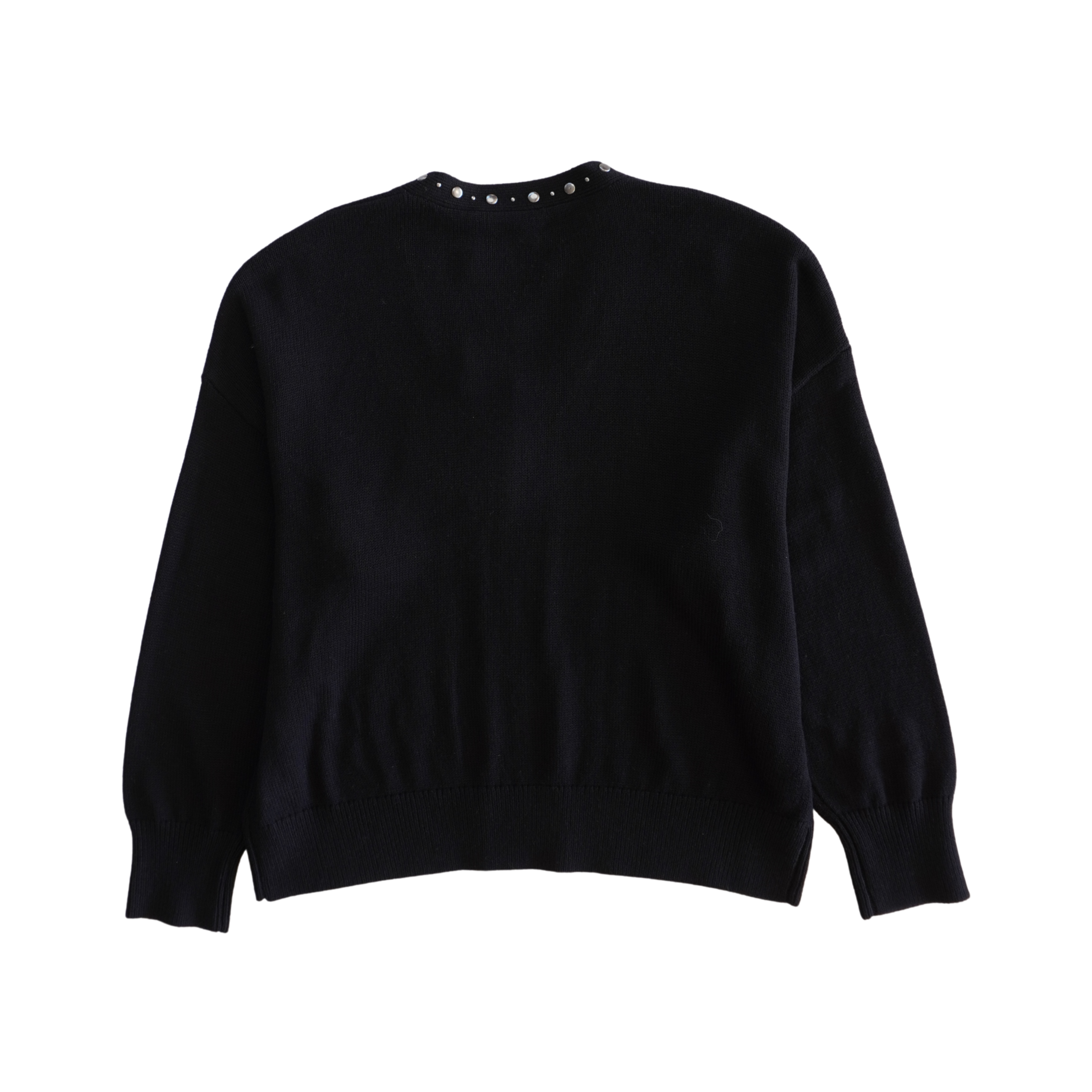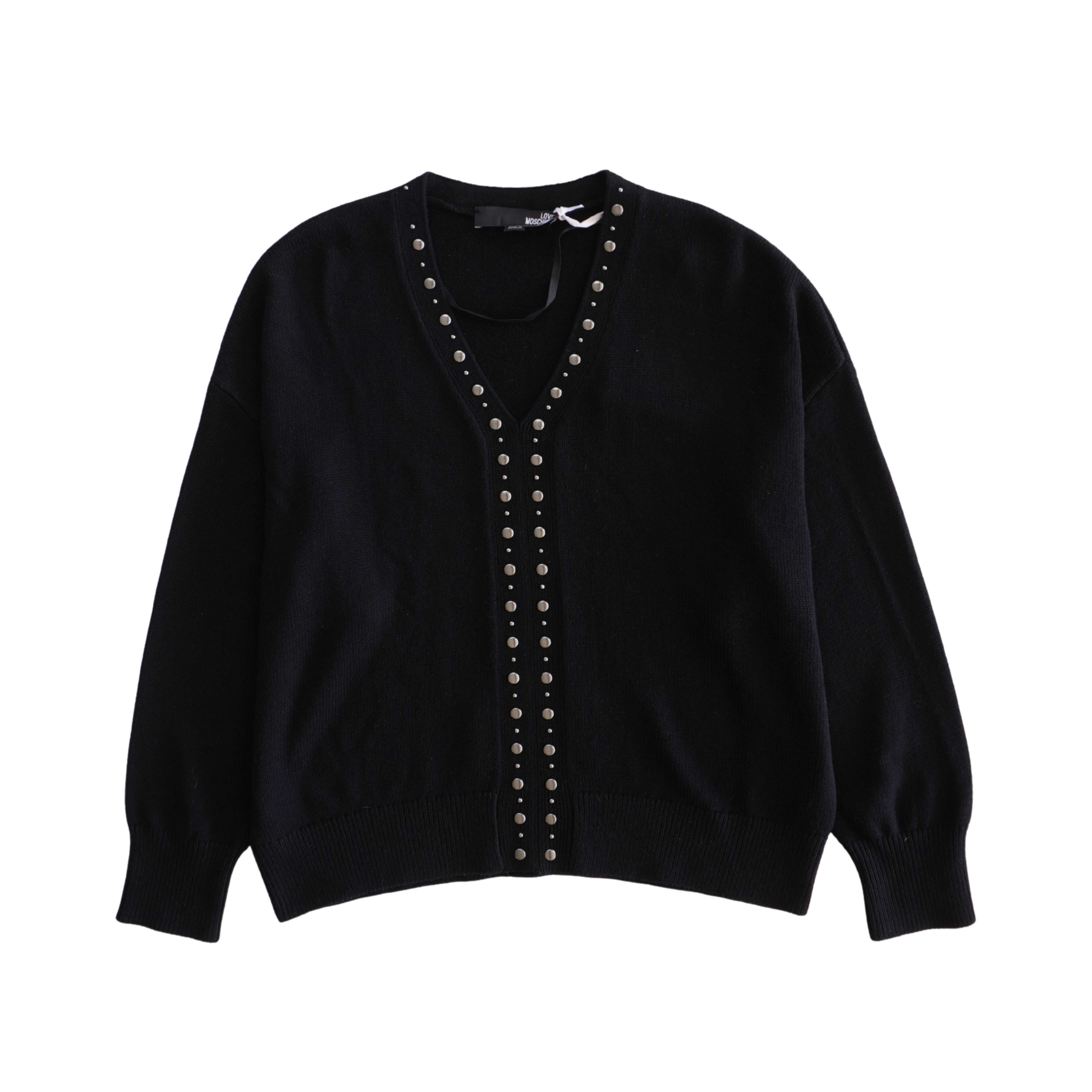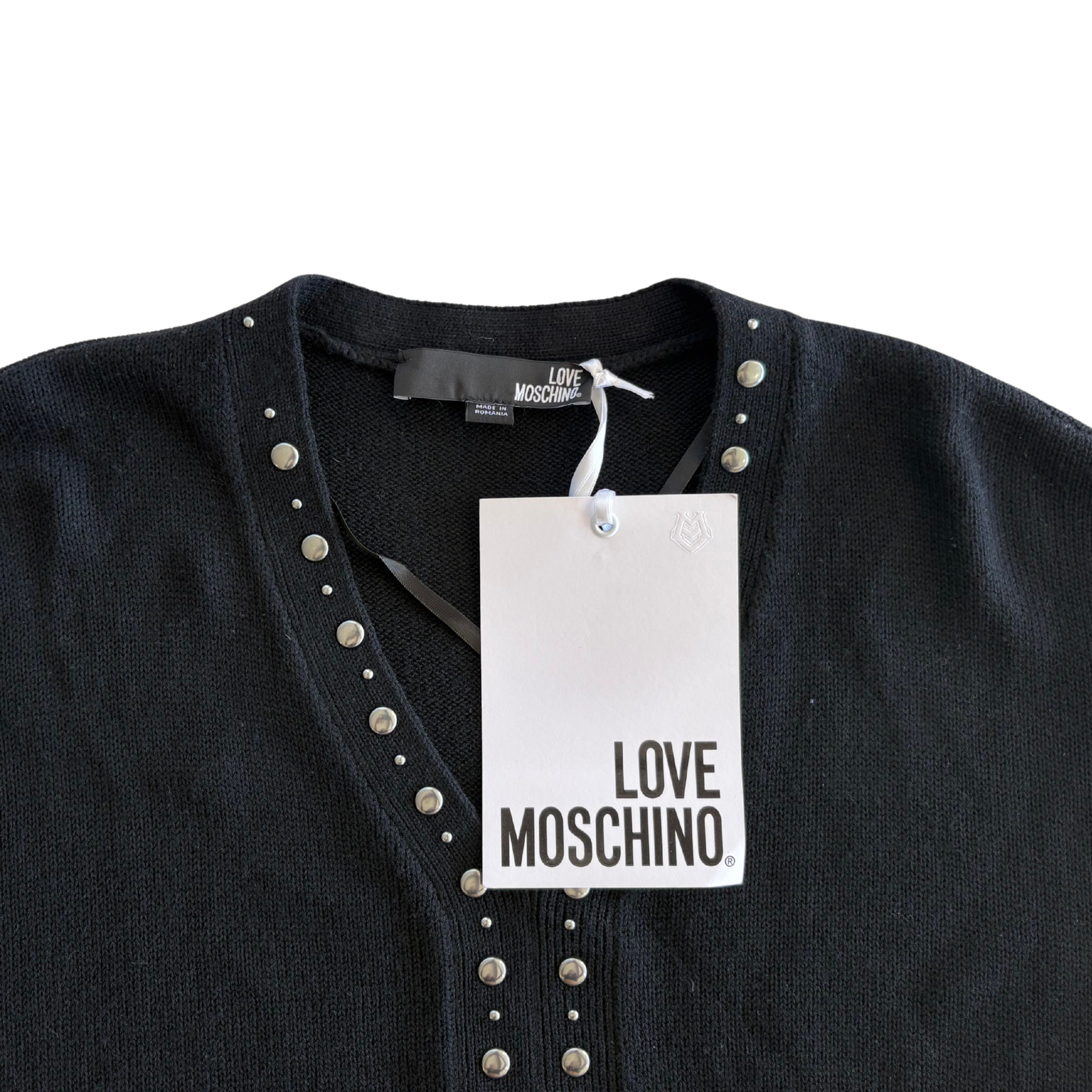 Love Moschino sweater in black knit with a v-neckline and silver flat studs along the collar and down the front.