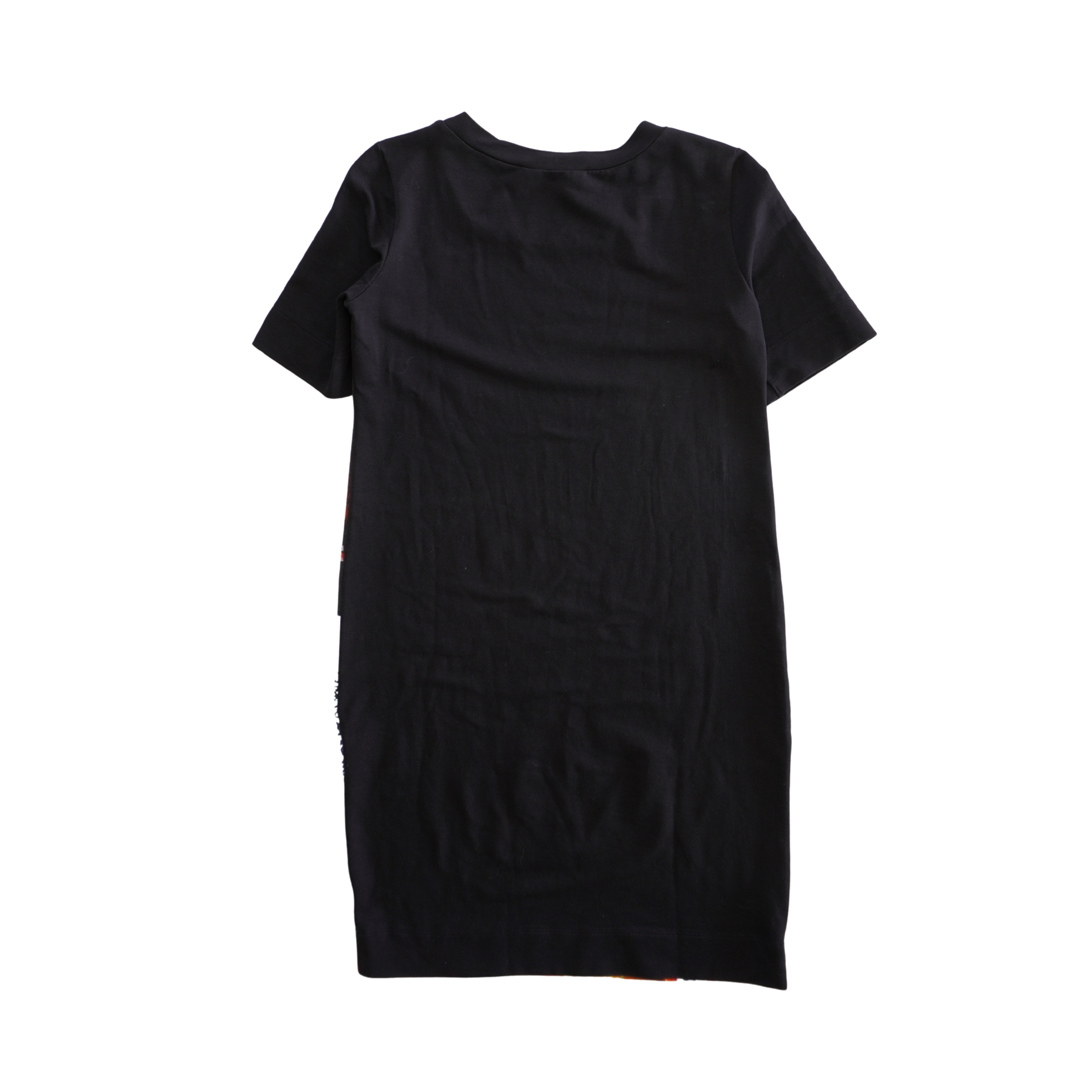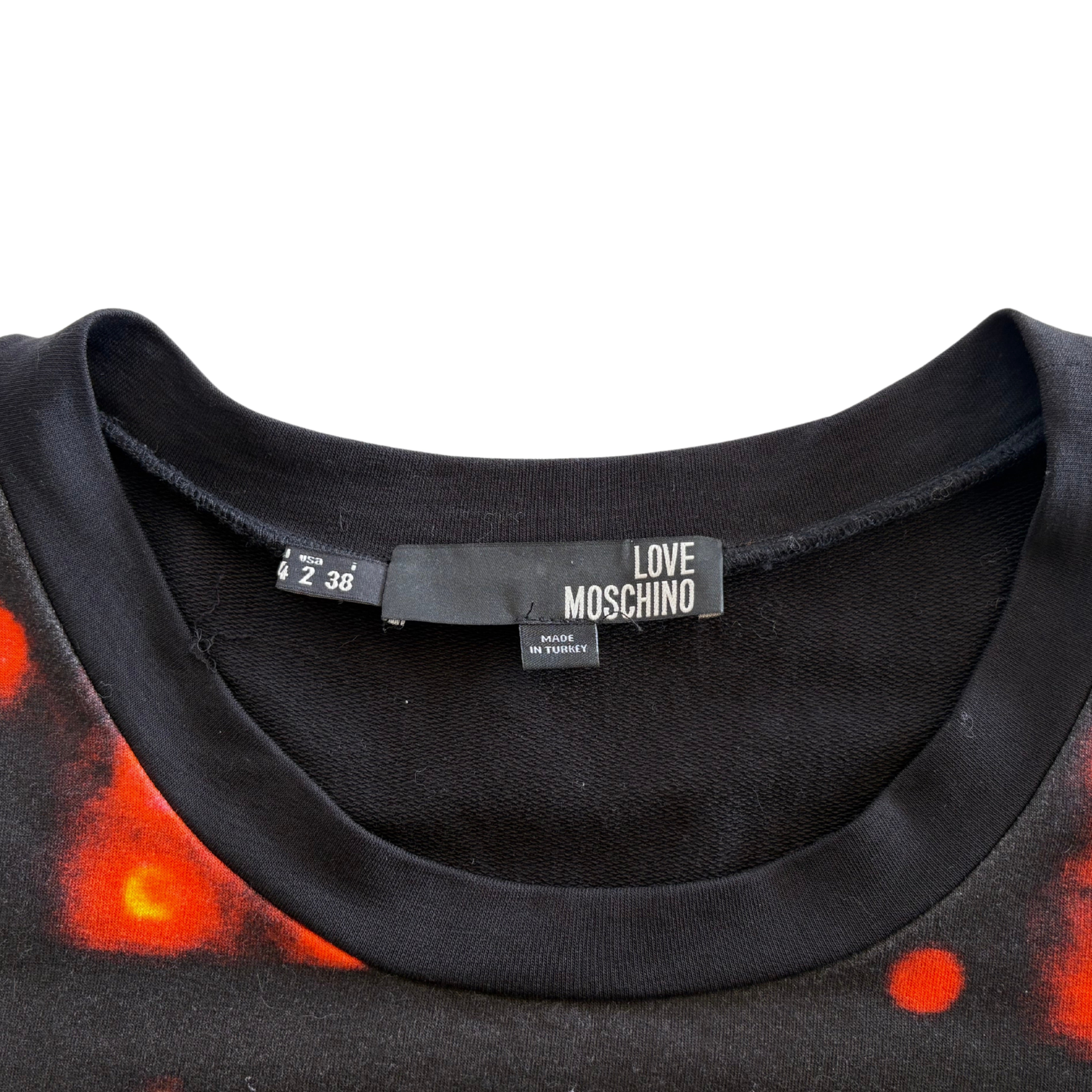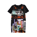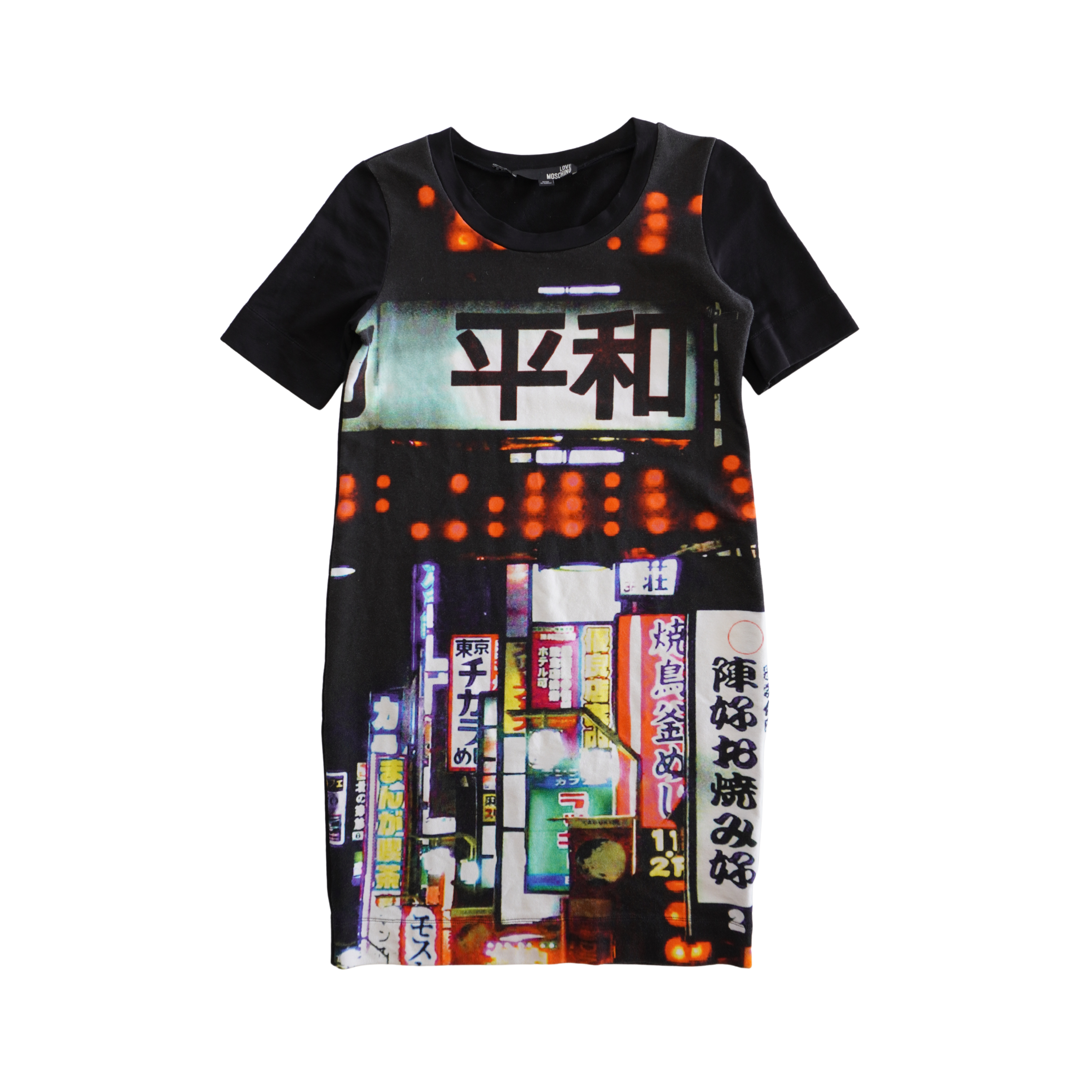 Love Moschino T-shirt dress in black cotton with Tokyo cityscape graphic on the front.