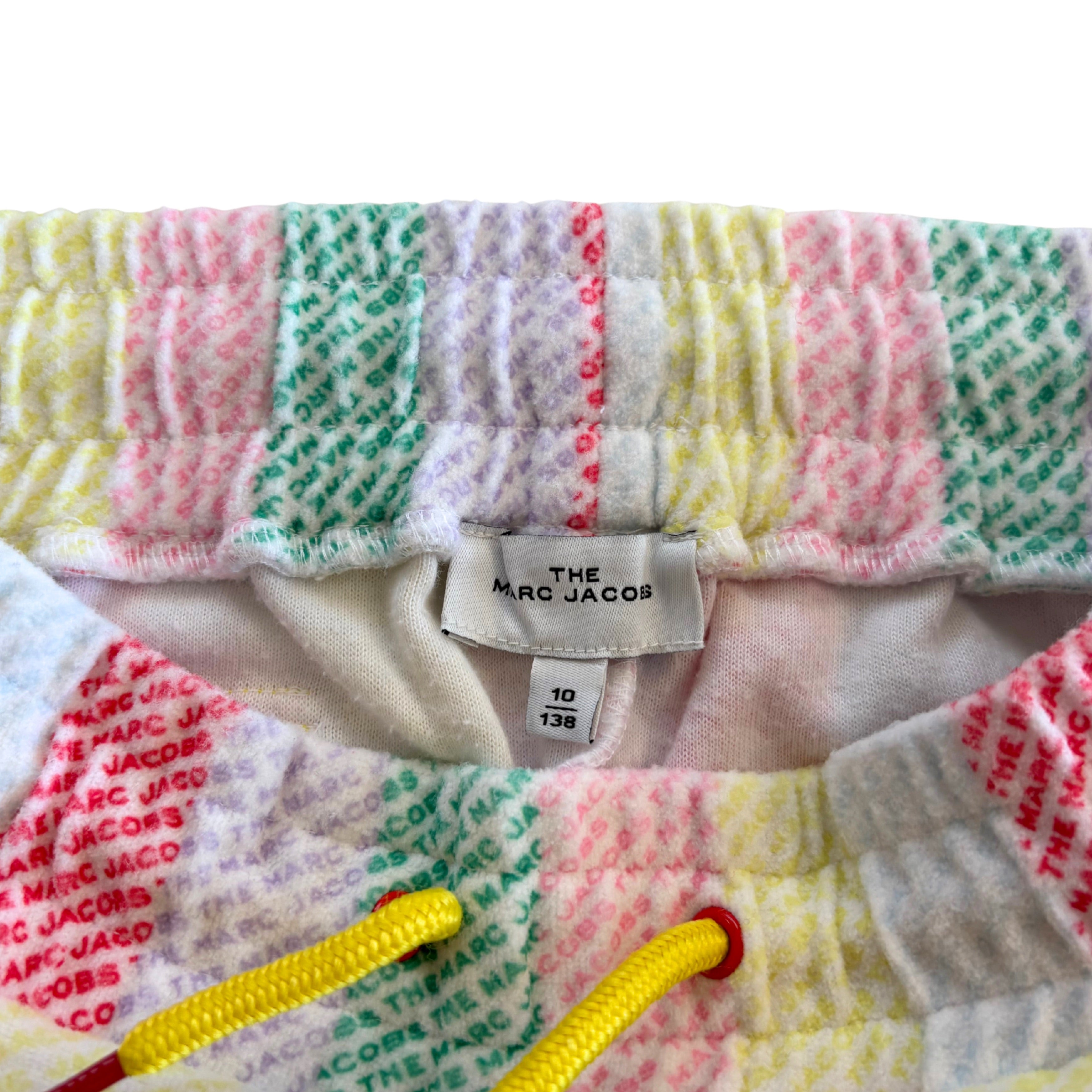 Marc Jacobs shorts in white fleece with an all-over purple, red, green, pink and yellow monogram print, yellow nylon trim, and an elastic drawstring waistband.