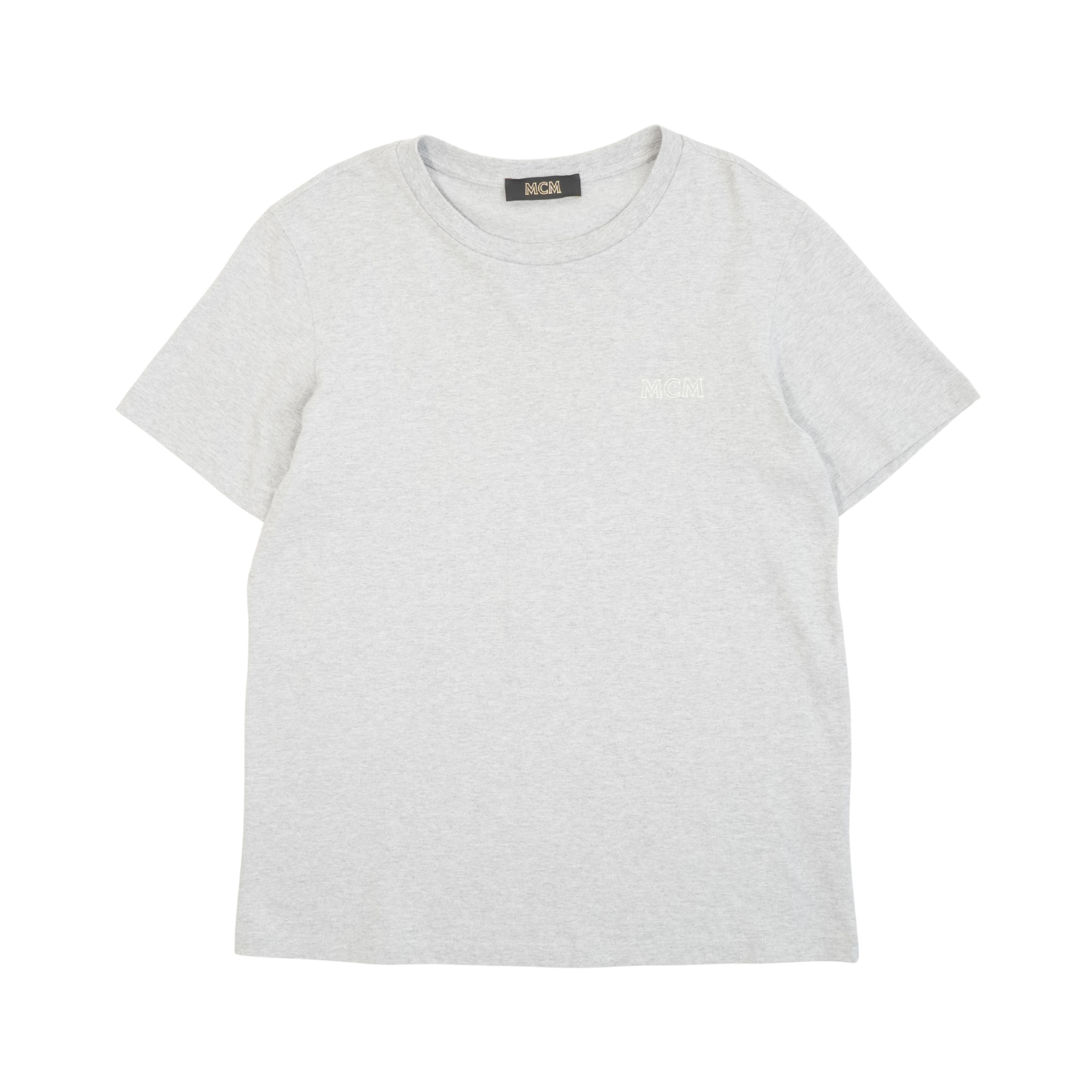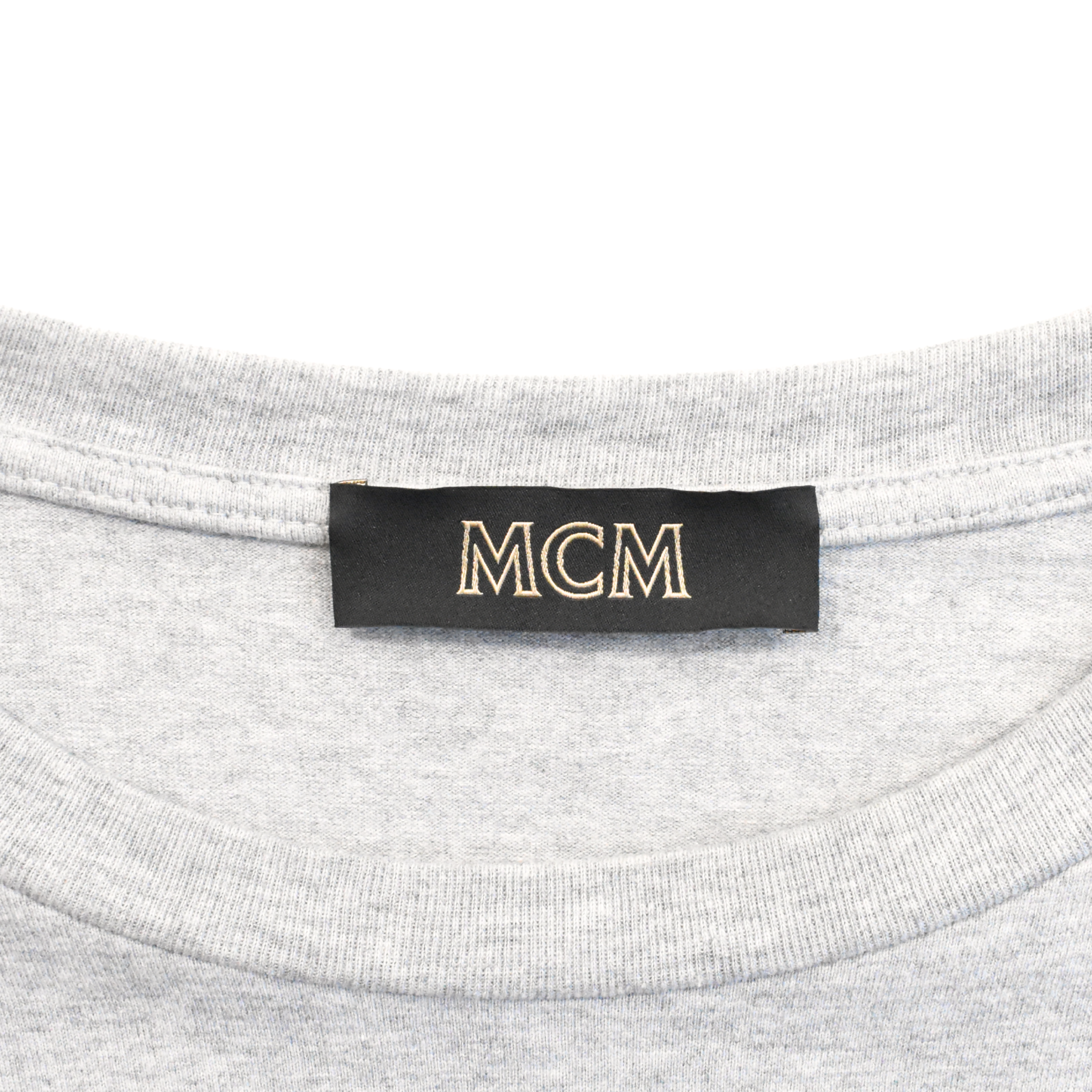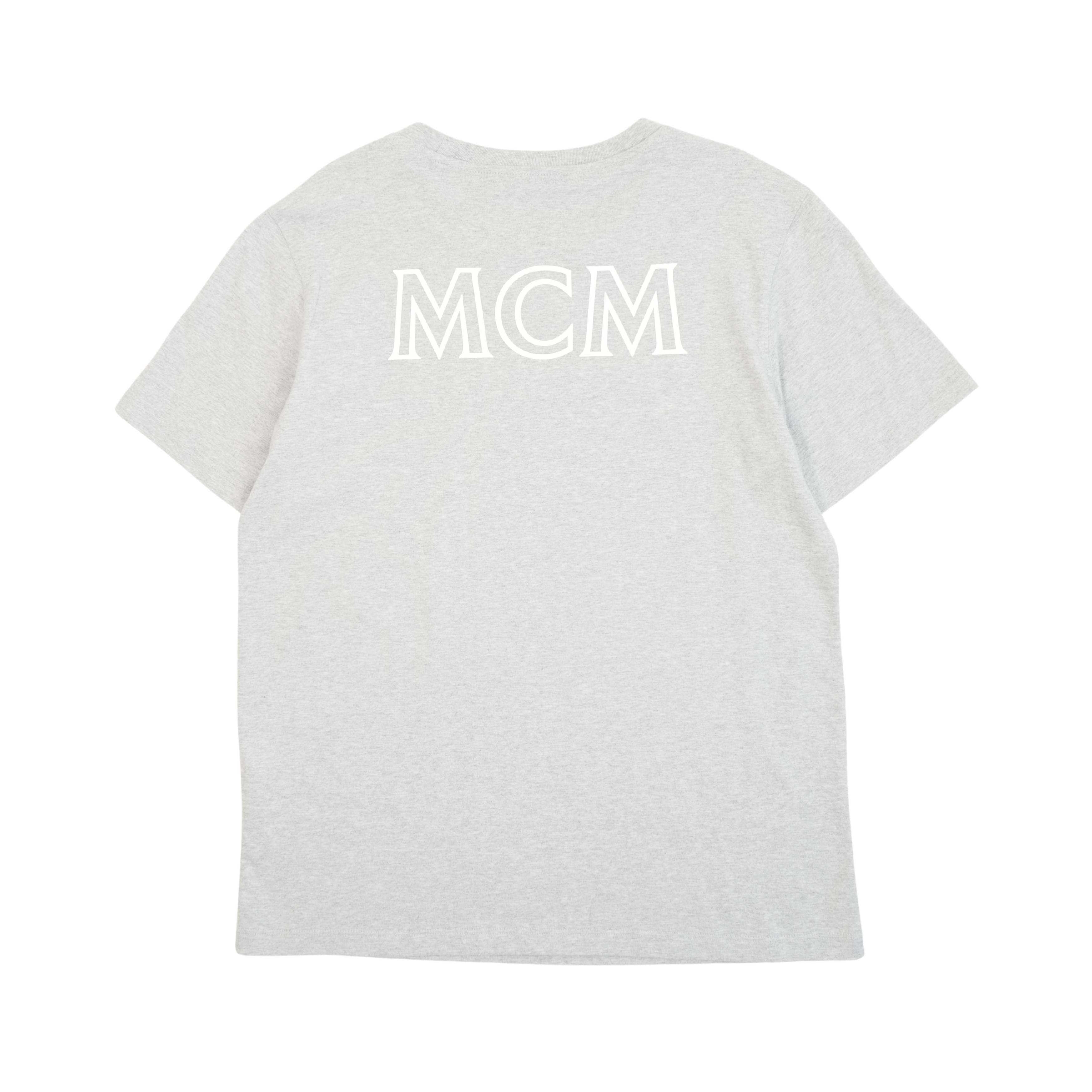 MCM t-shirt in light grey with white white embroidered logo on chest and large printed white logo on the back.
