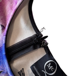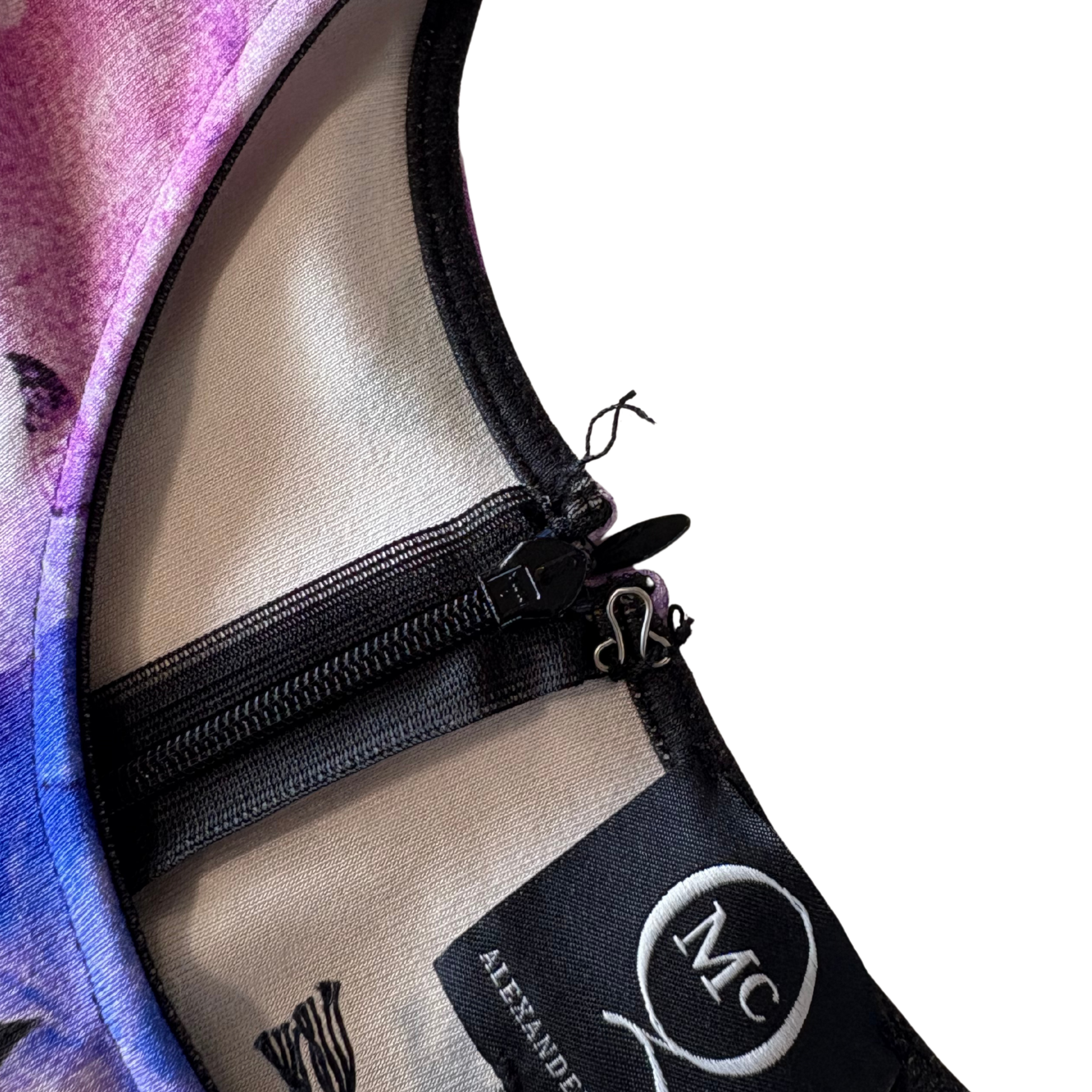 McQ by Alexander McQueen sheath dress in black with purple iris pattern on the top and cap sleeves.
